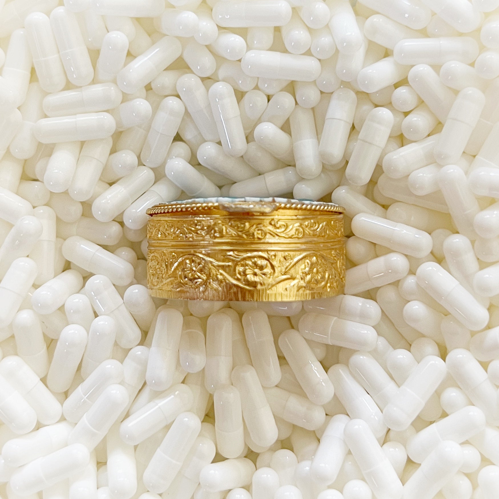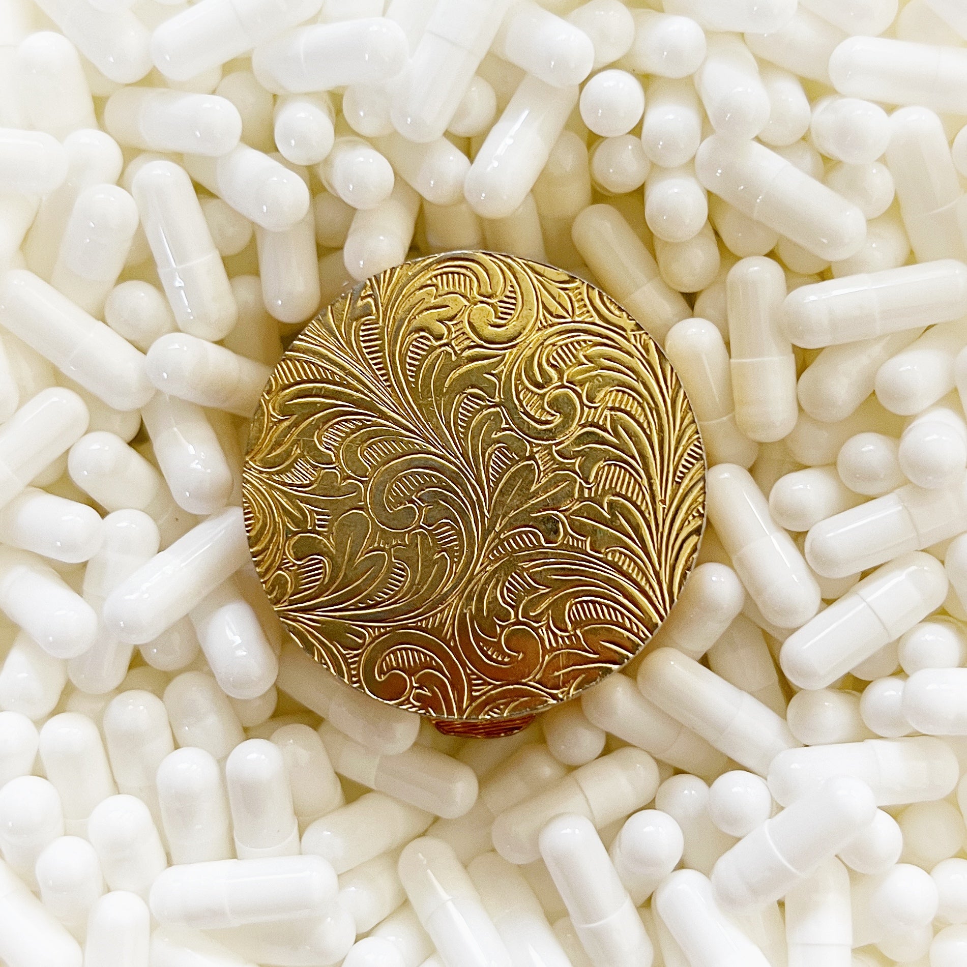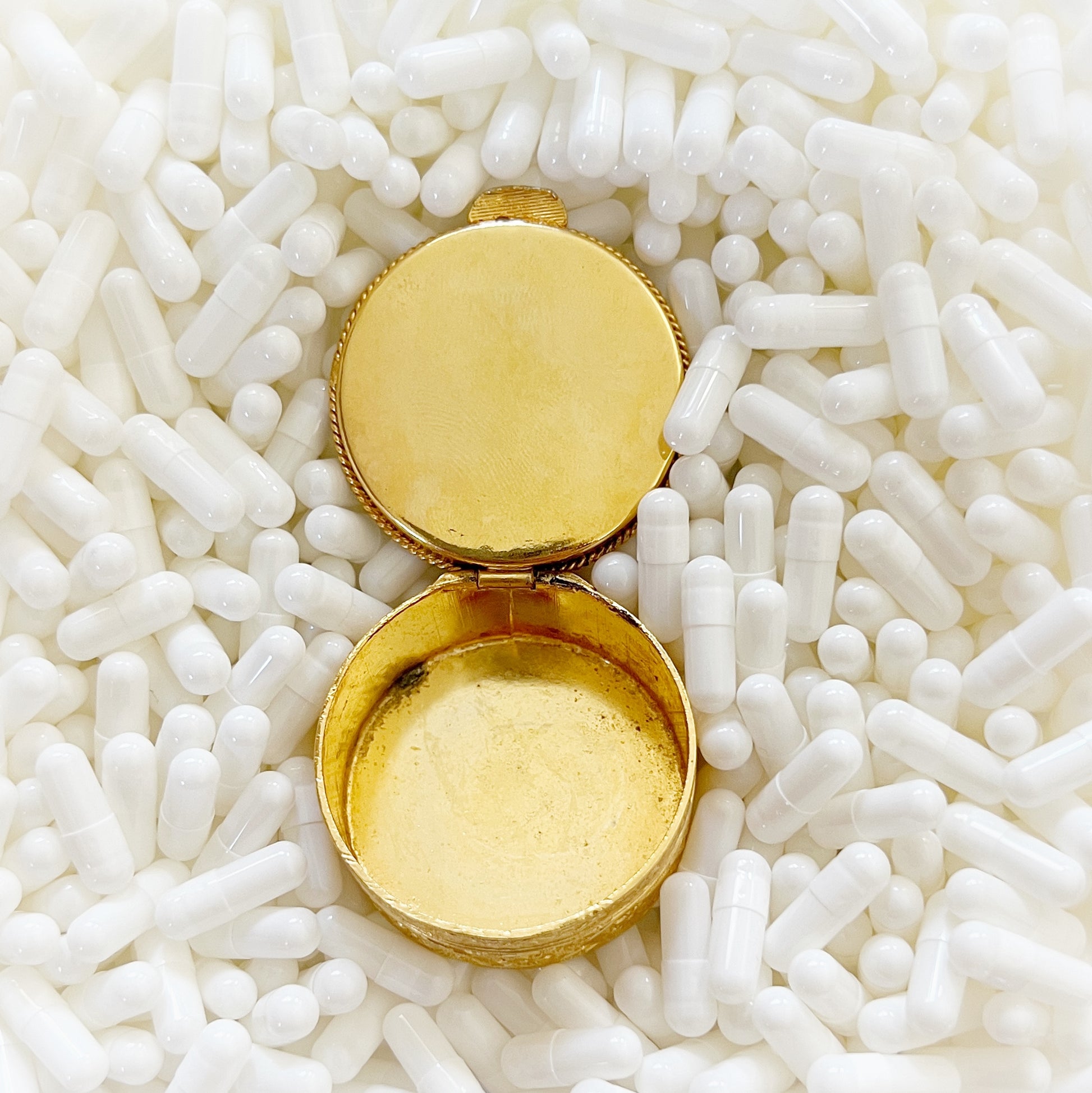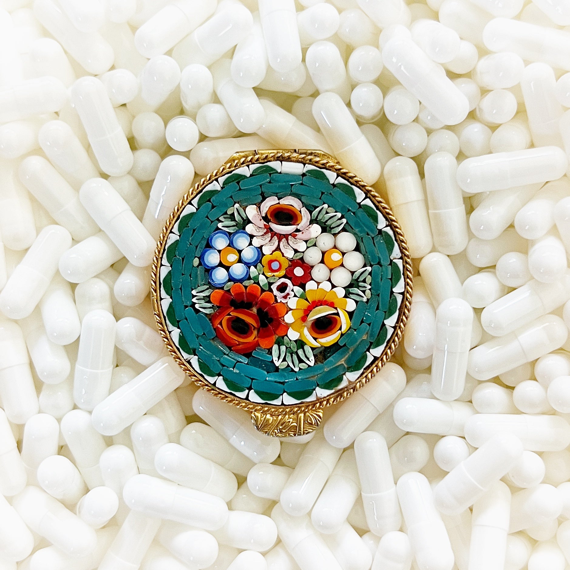 - Materials: Hand-cut glass tesserae set in gilt metal pill box.