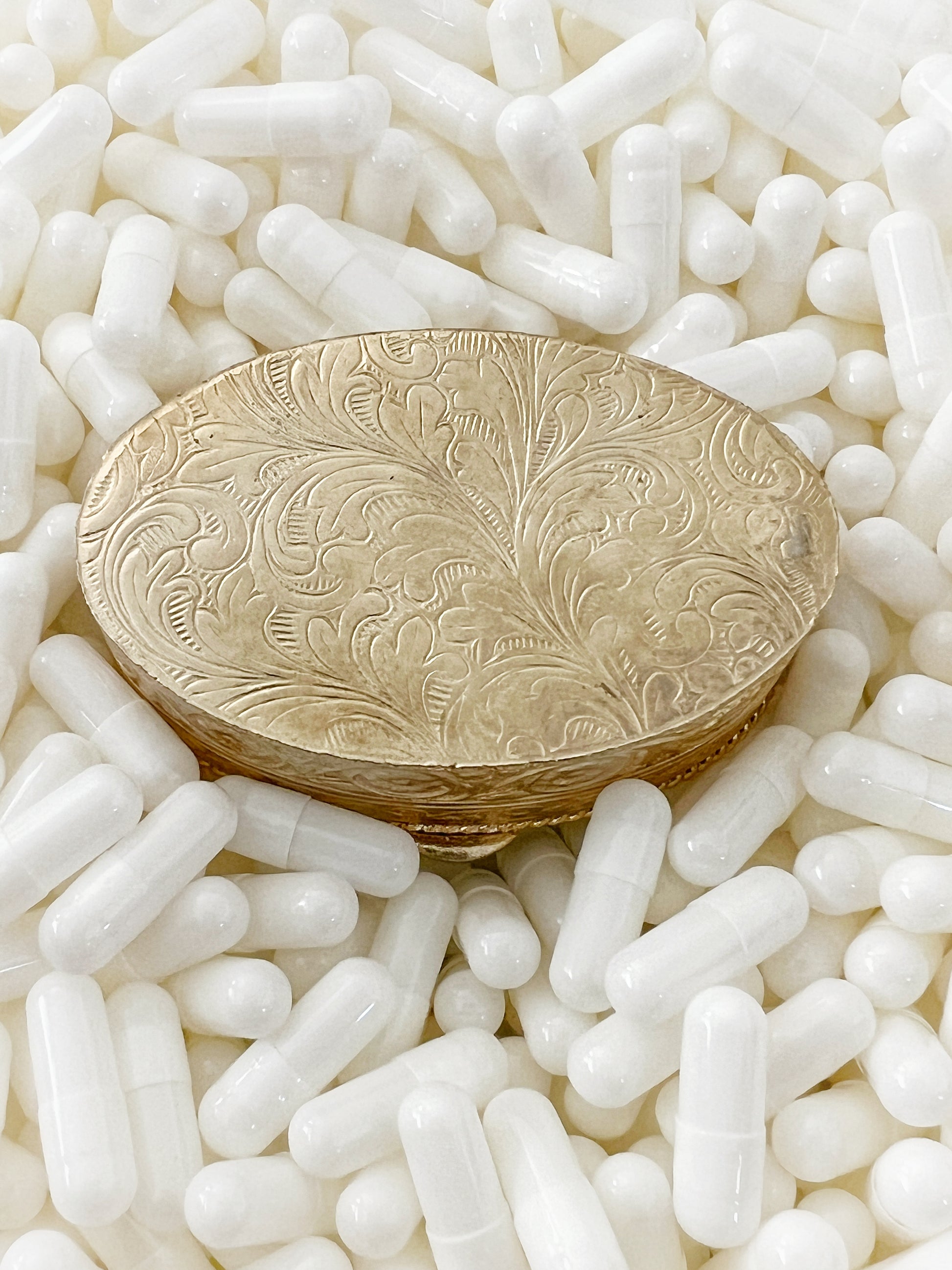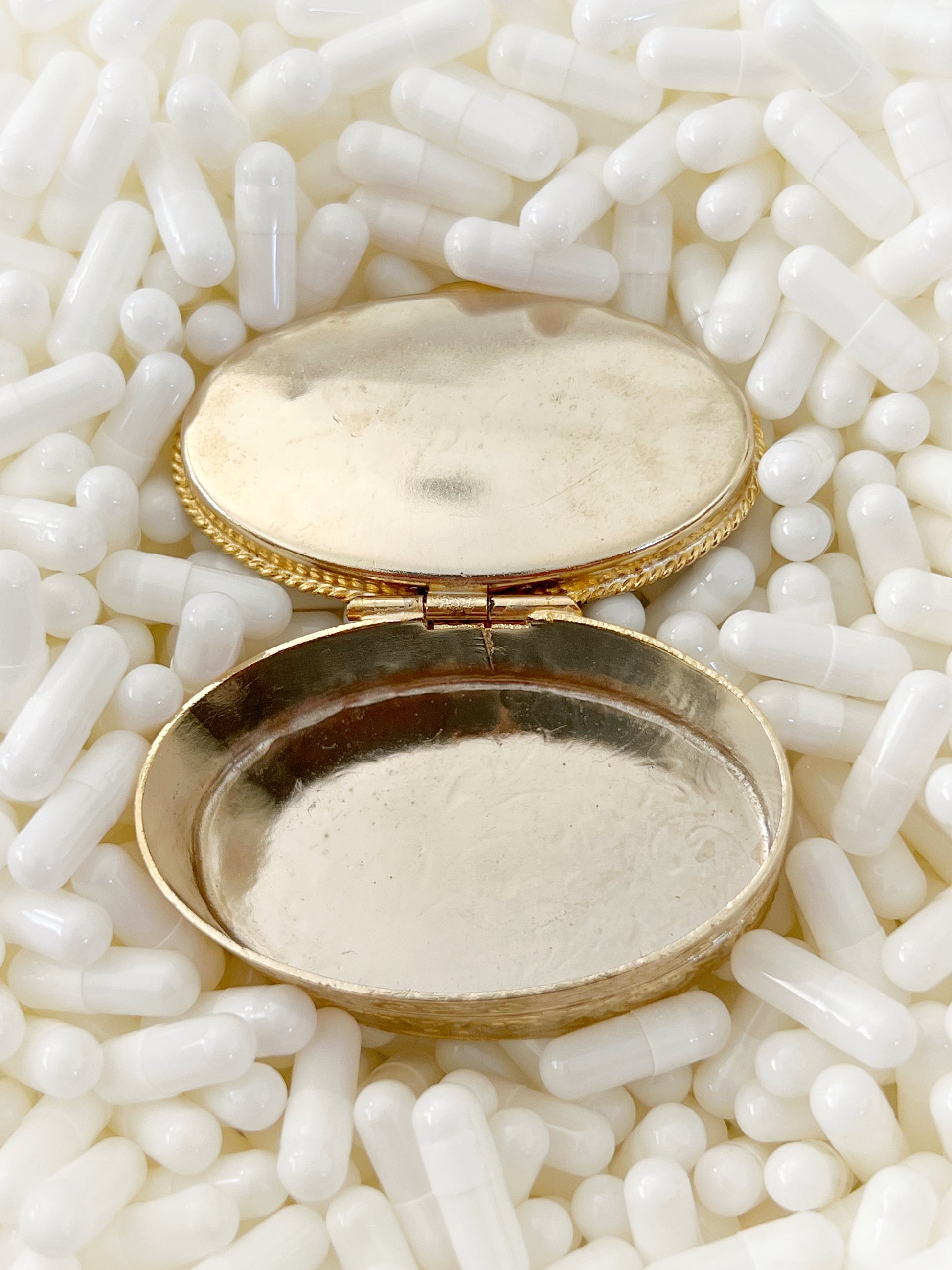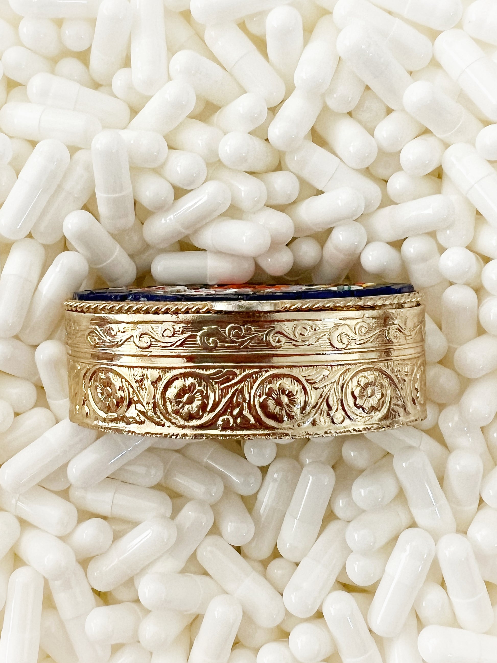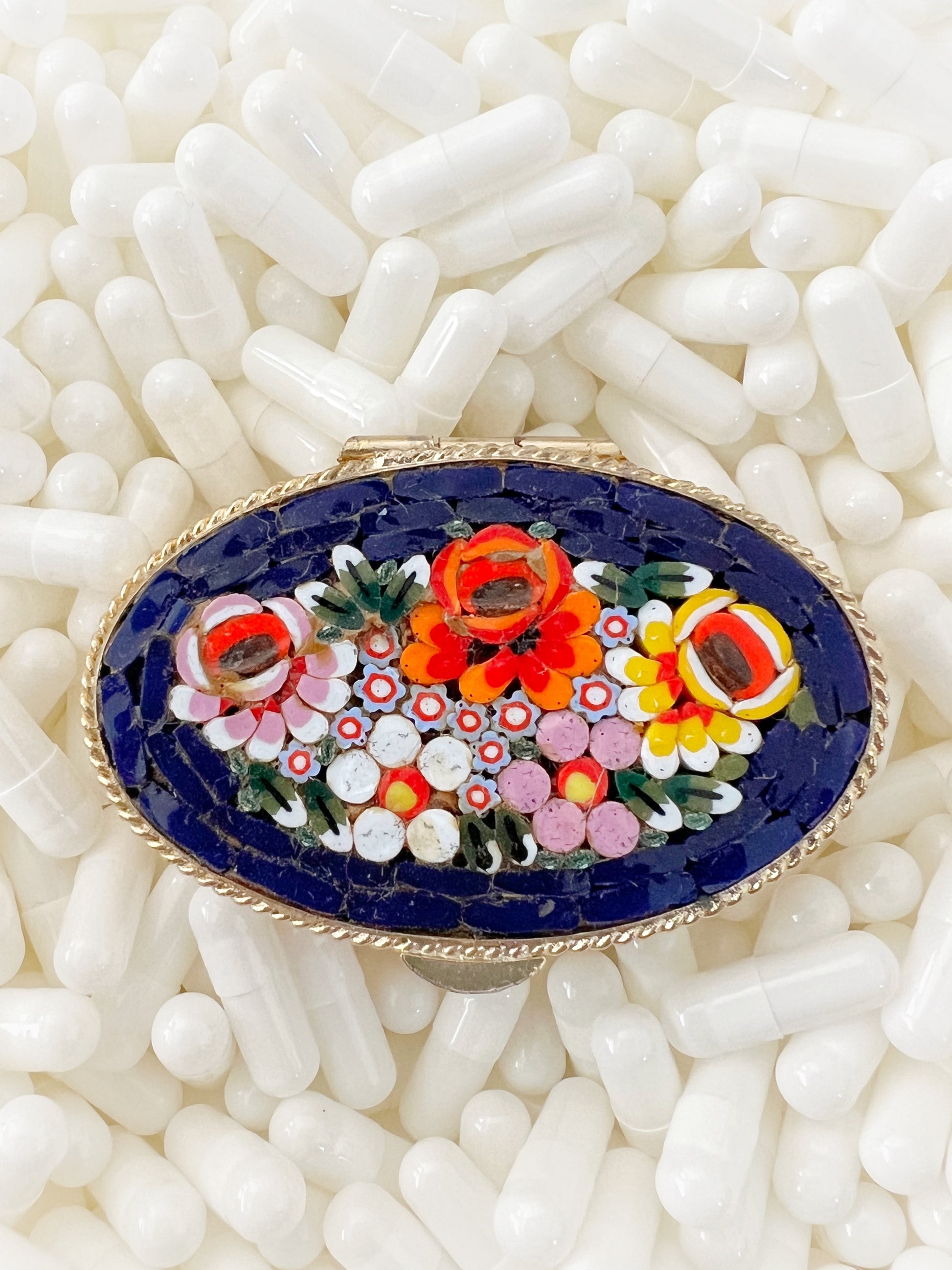 - Materials: Hand-cut glass tesserae inlaid on a navy ground, gilt metal pill box frame.