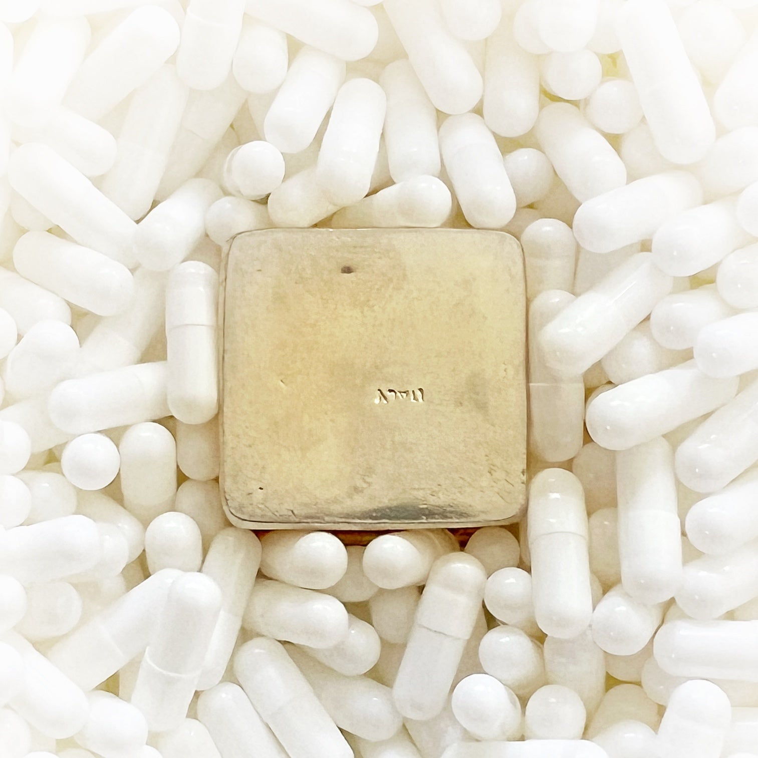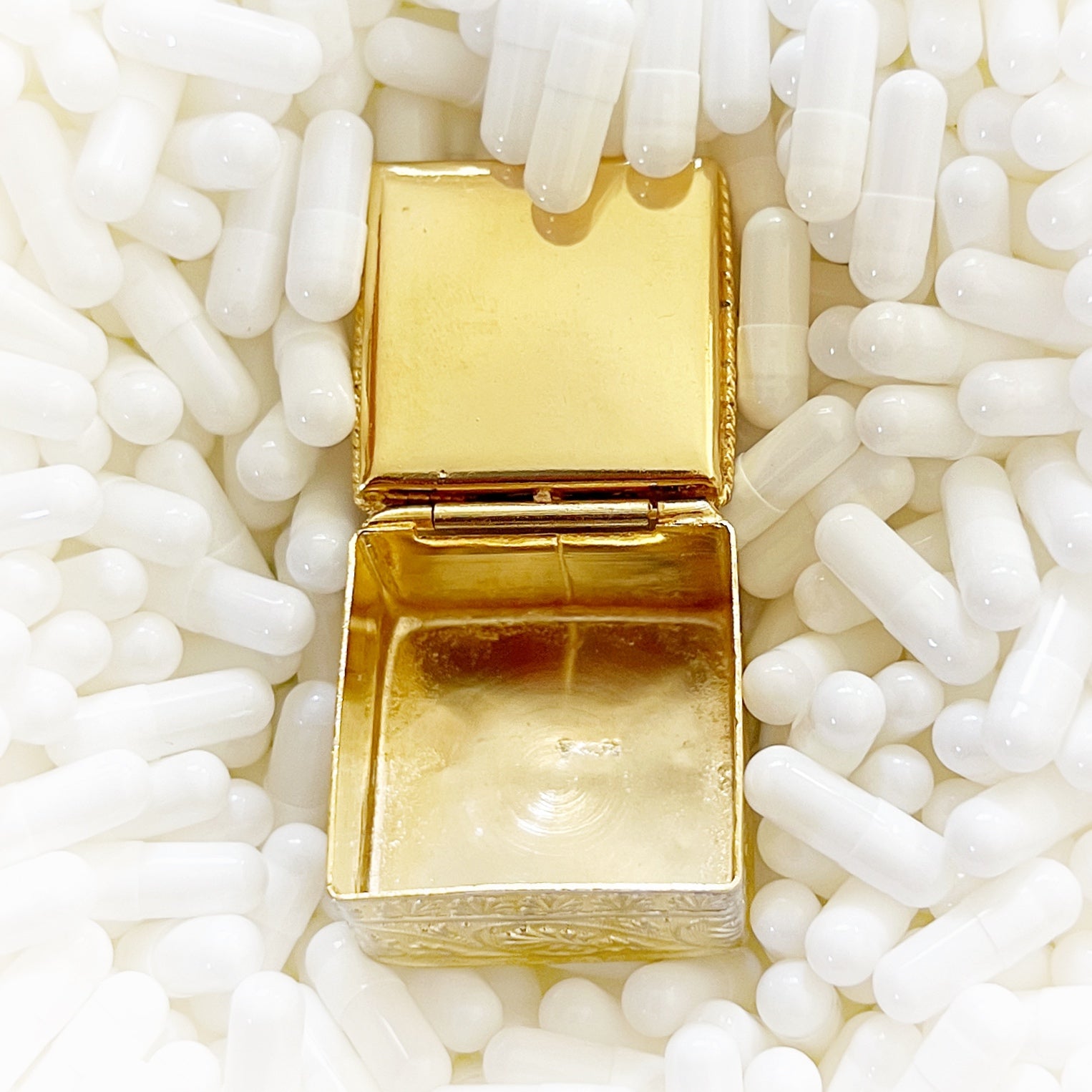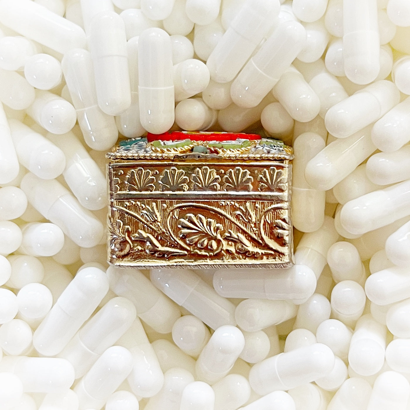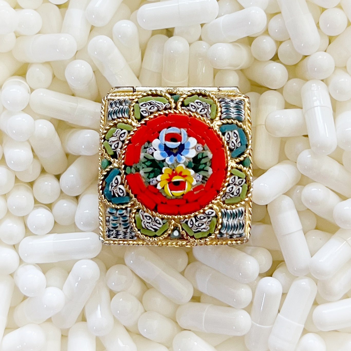 - Materials: Hand-cut glass tesserae set in gilt metal pill box.