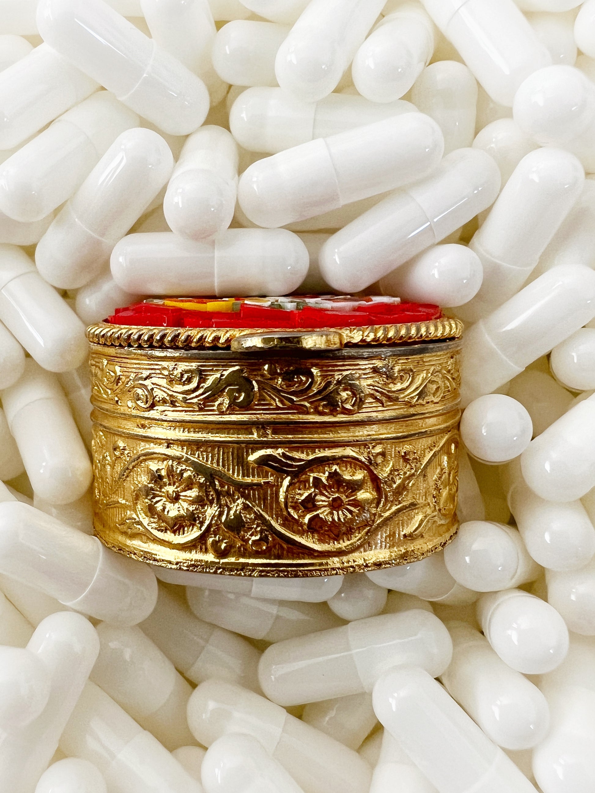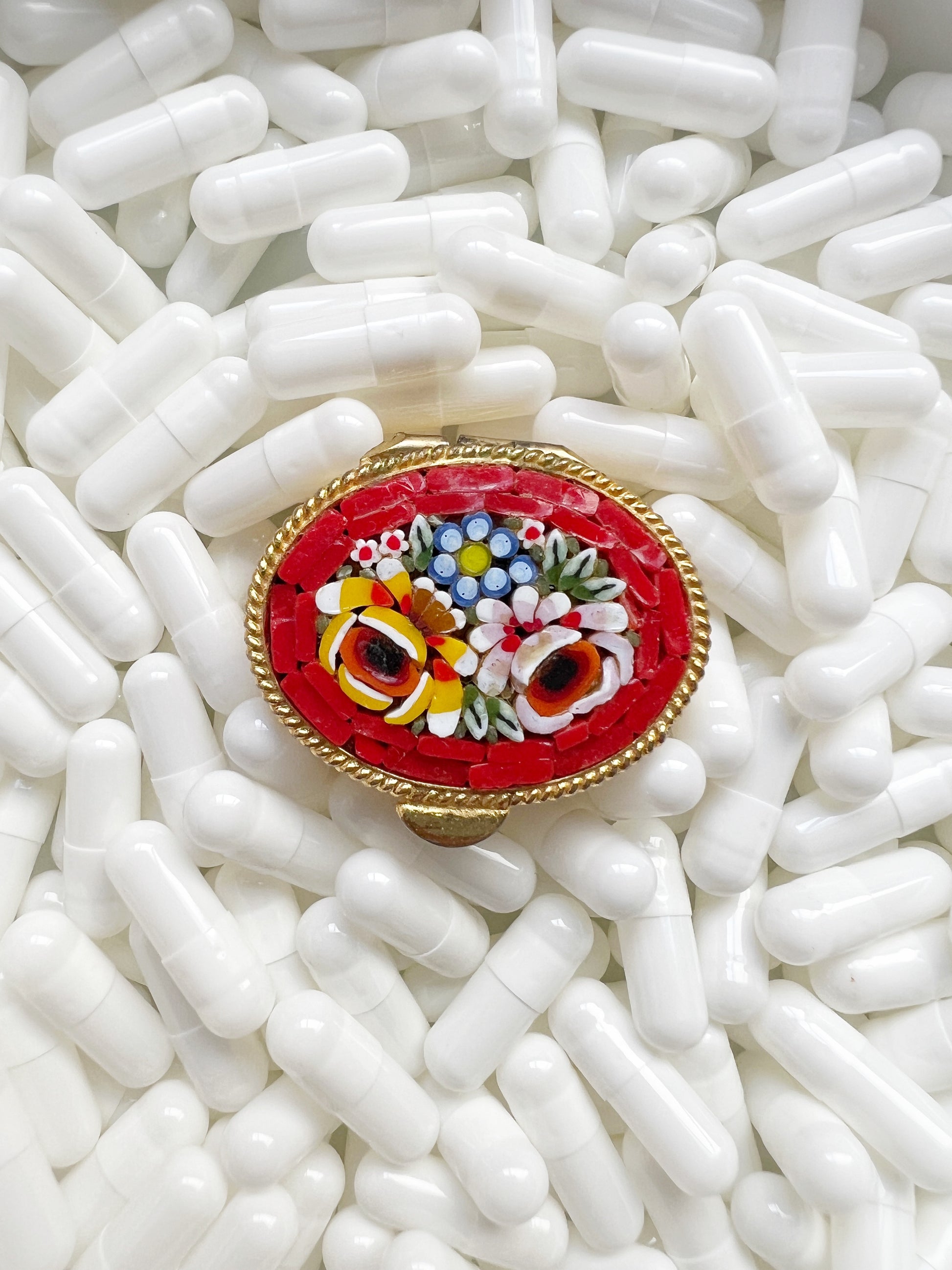 Petite yet radiant, this vintage Italian micro mosaic pill box captures the spirit of Italian craftsmanship in miniature. Its oval lid is set with a vibrant red ground, upon which a bright bouquet of pink, yellow, white, and blue blossoms bloom, accented with tiny pink and red wax flowers. Each petal and leaf is formed from tiny, hand-cut glass tesserae, individually placed to create a jewel-like surface that glows with color and life.