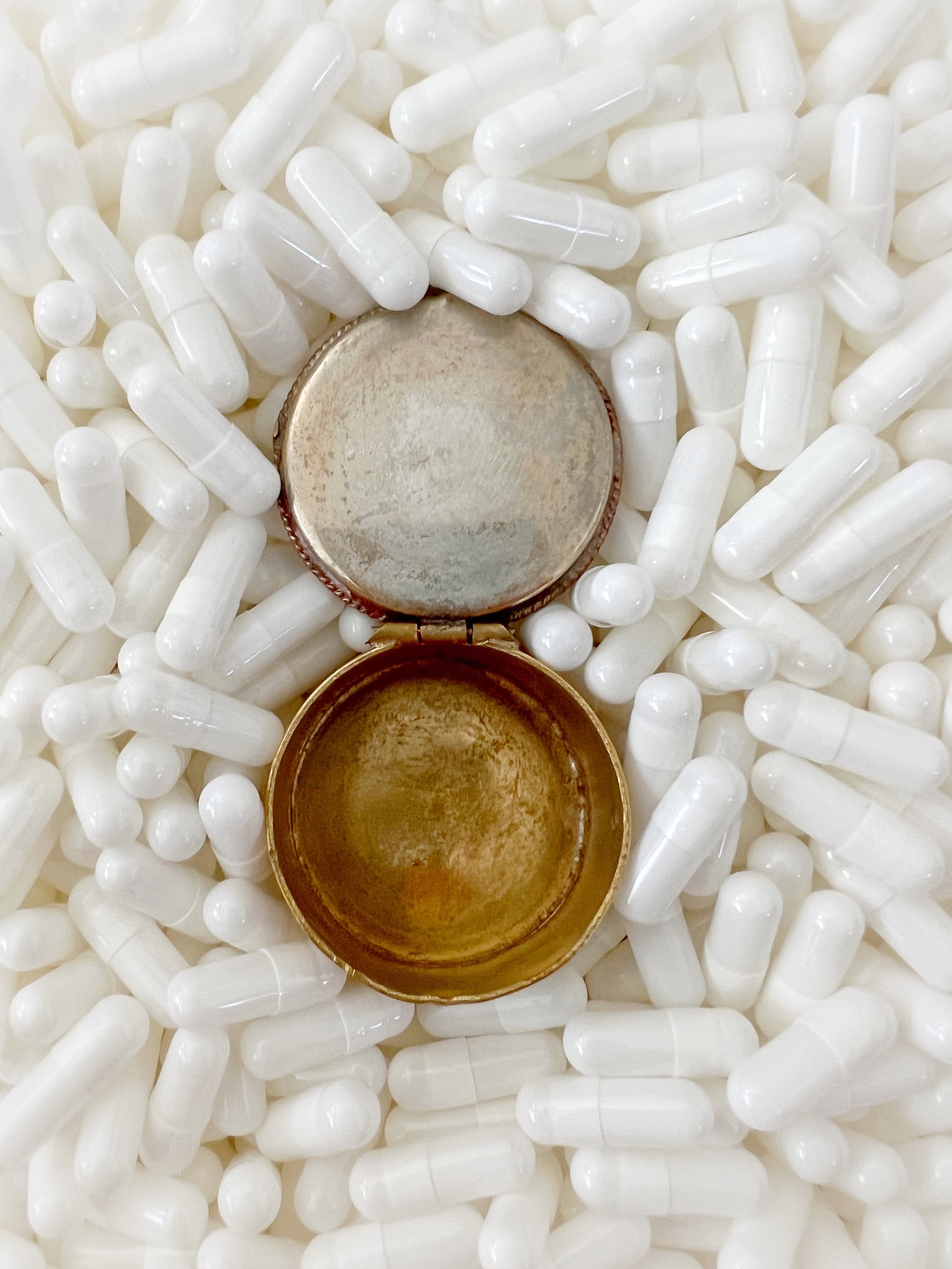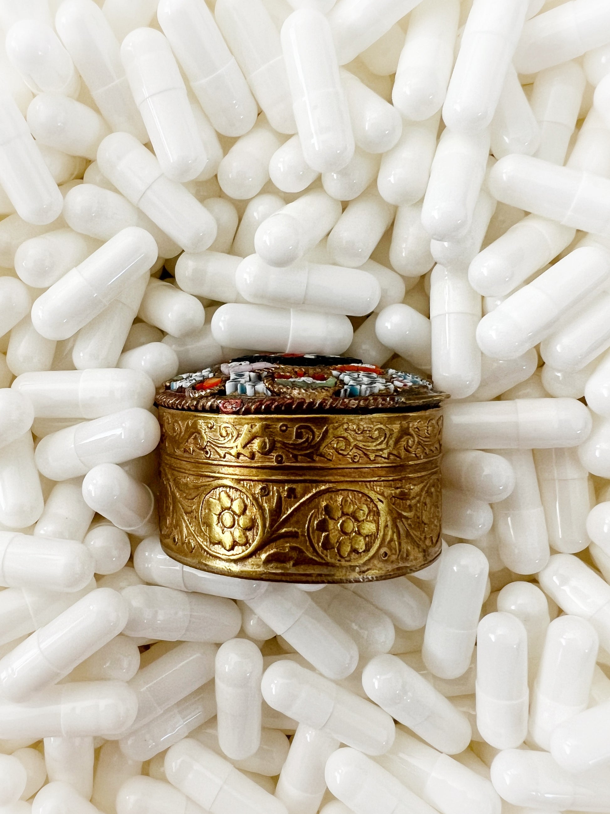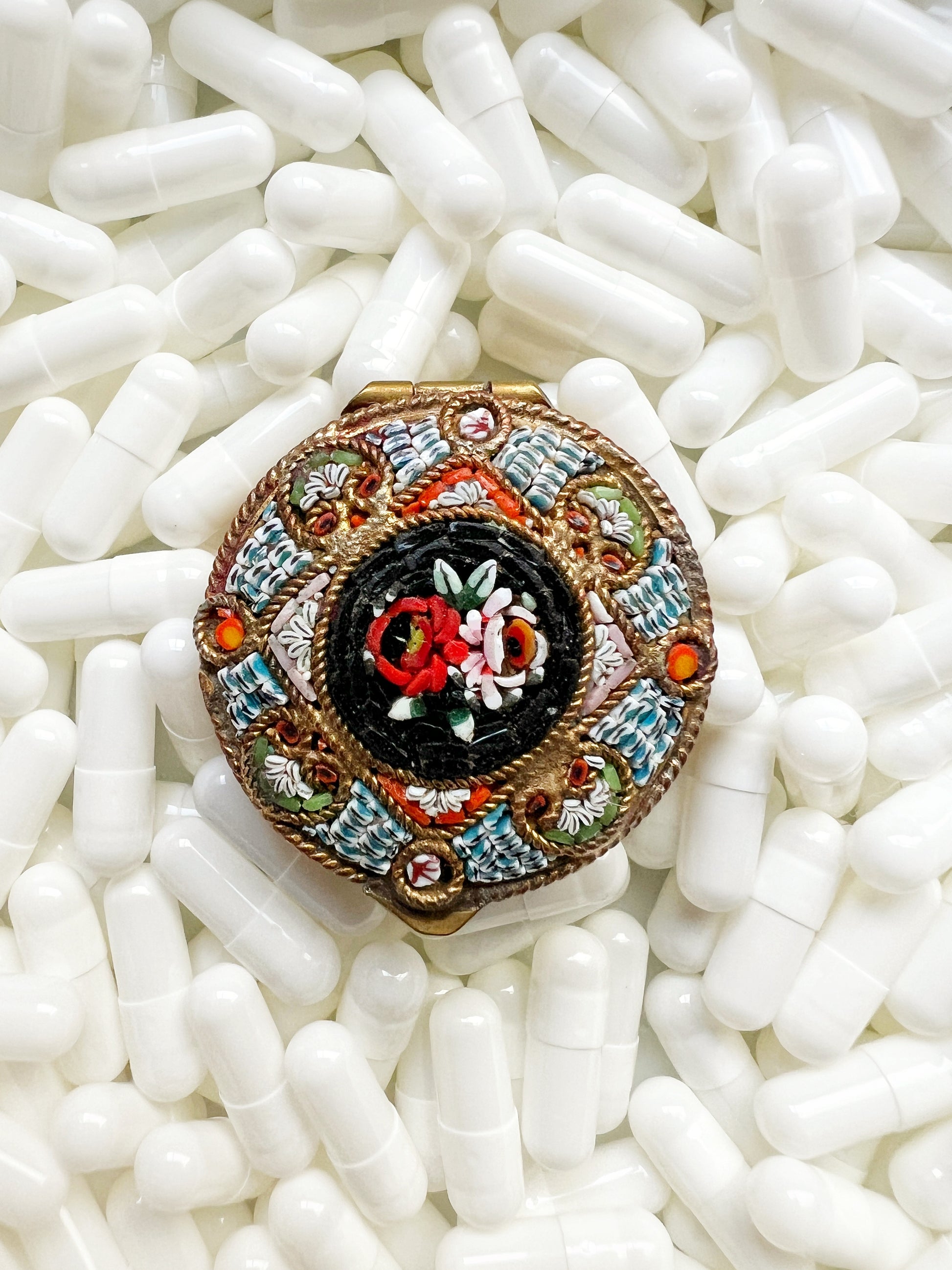 - Materials: Hand-cut glass tesserae set in gilt metal pill box.
