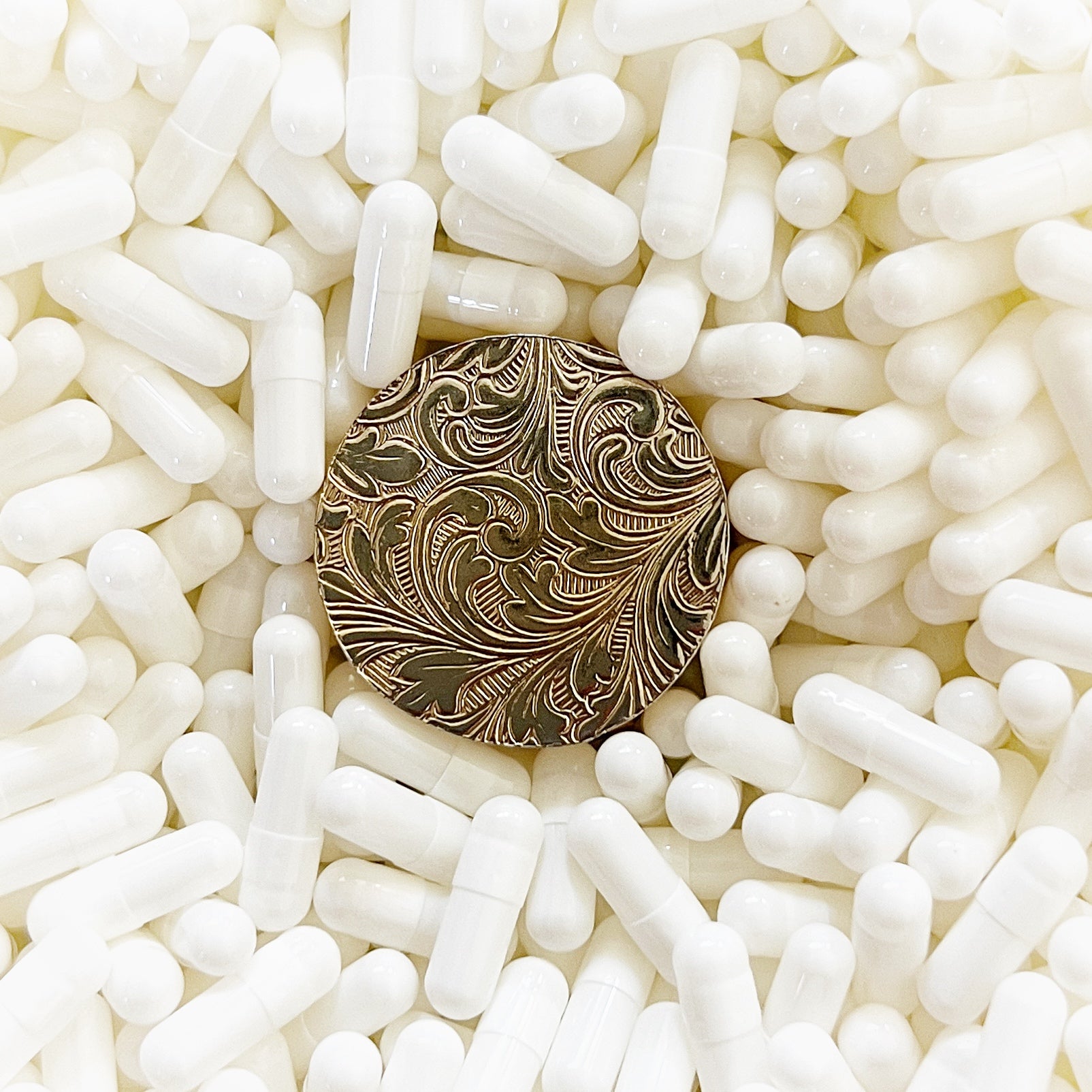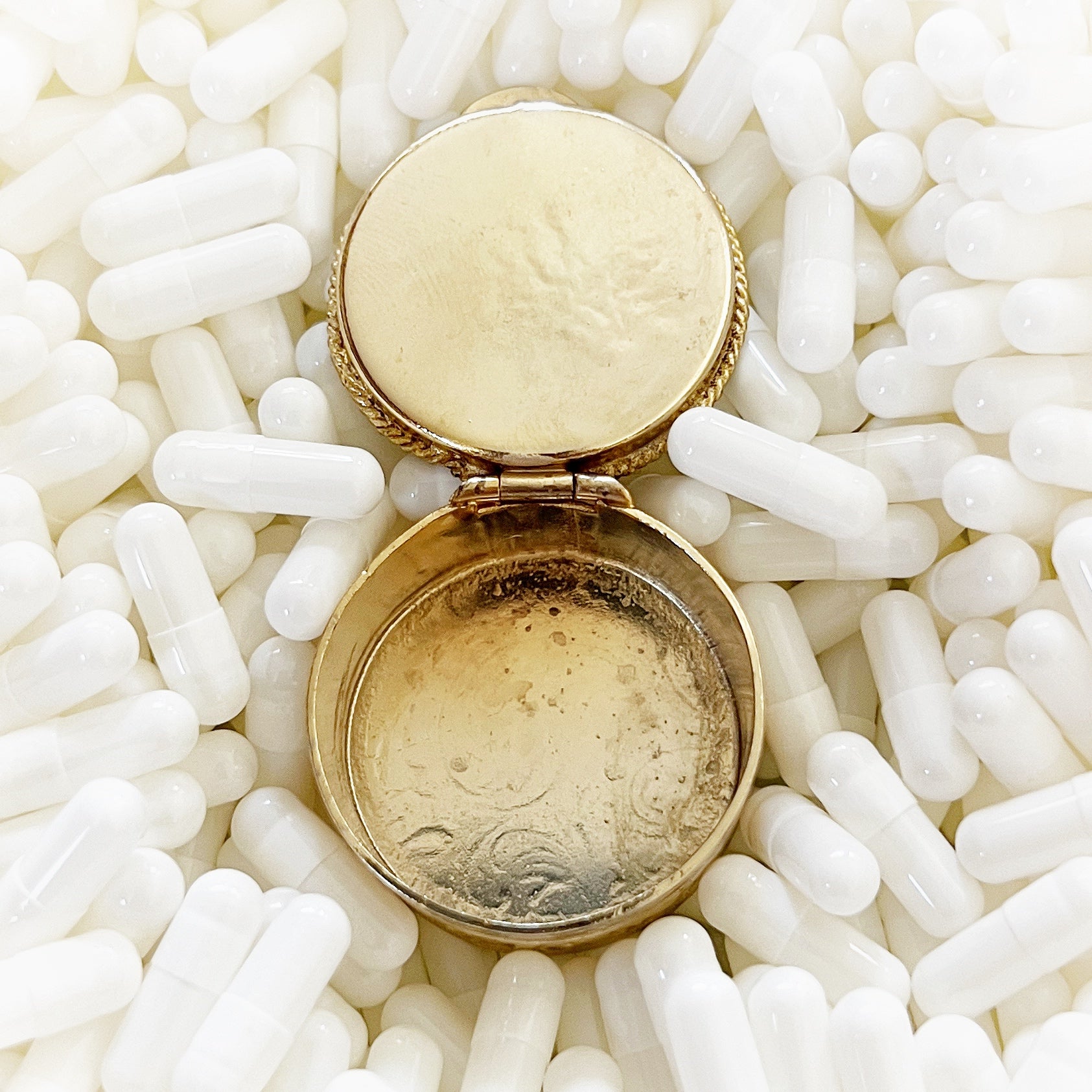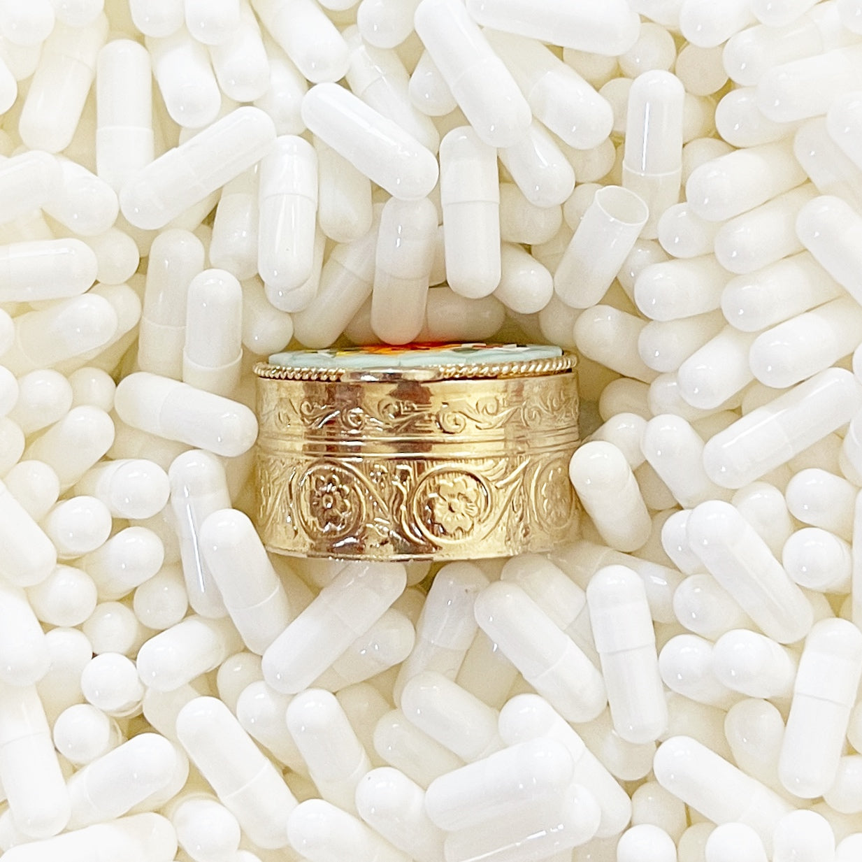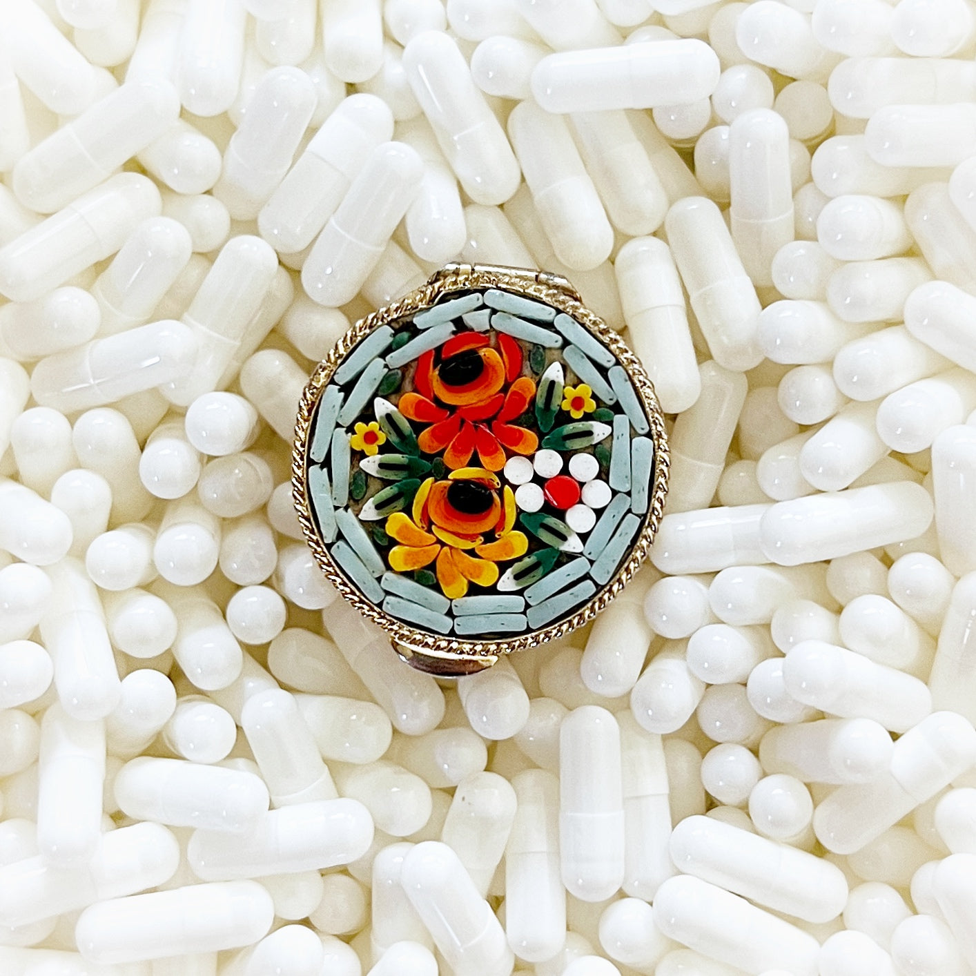 - Materials: Hand-cut glass tesserae set in gilt metal pill box.