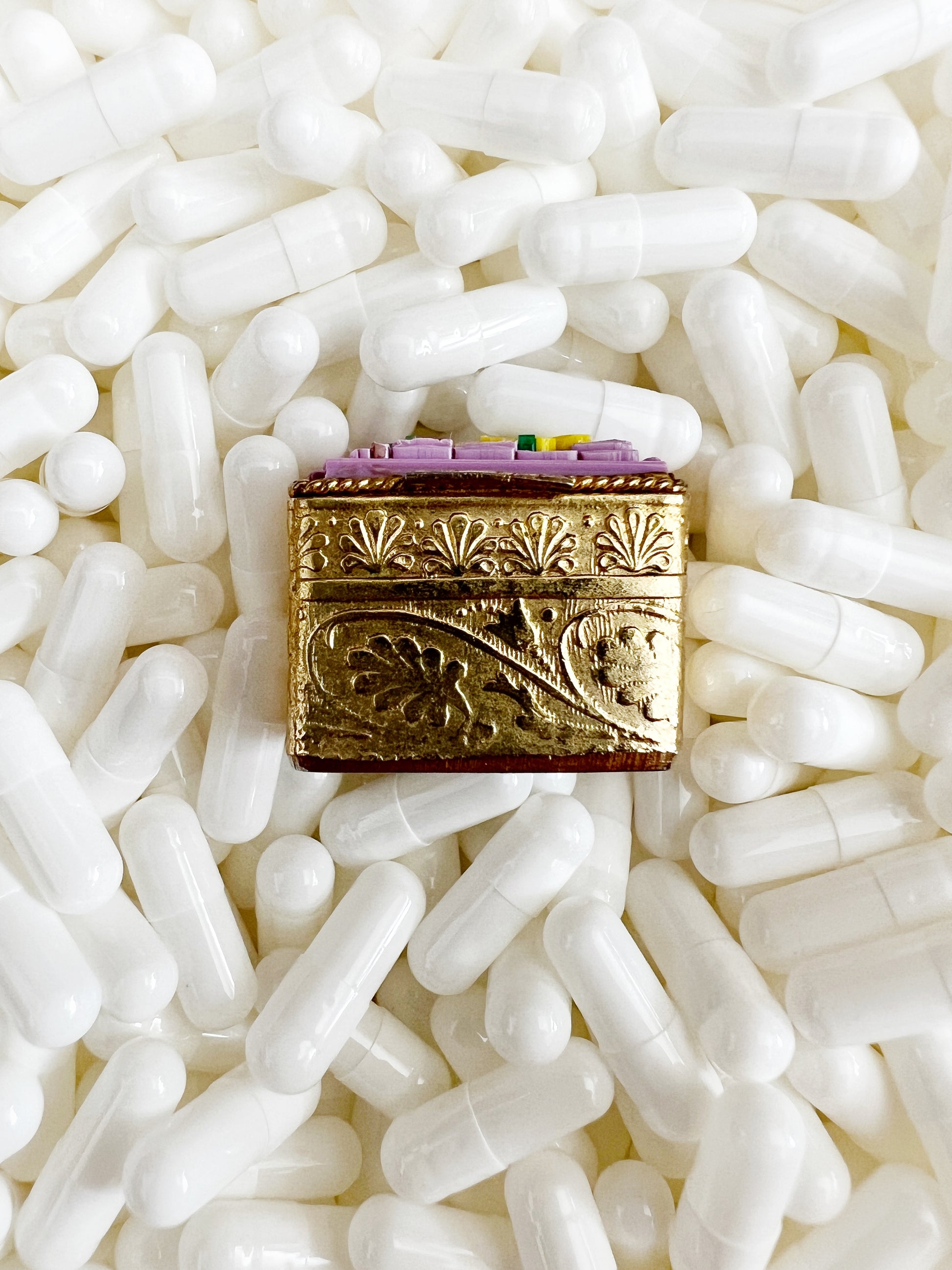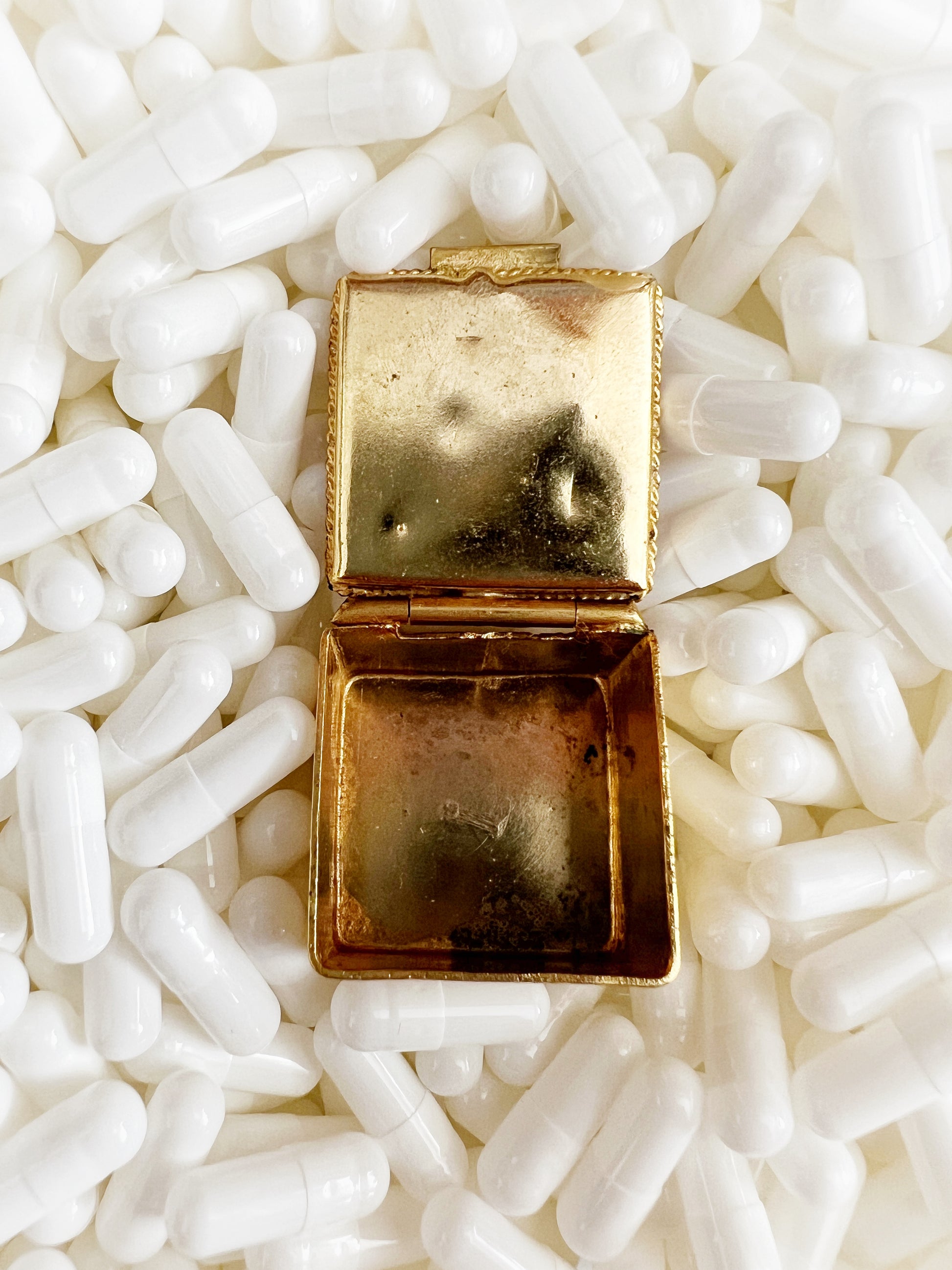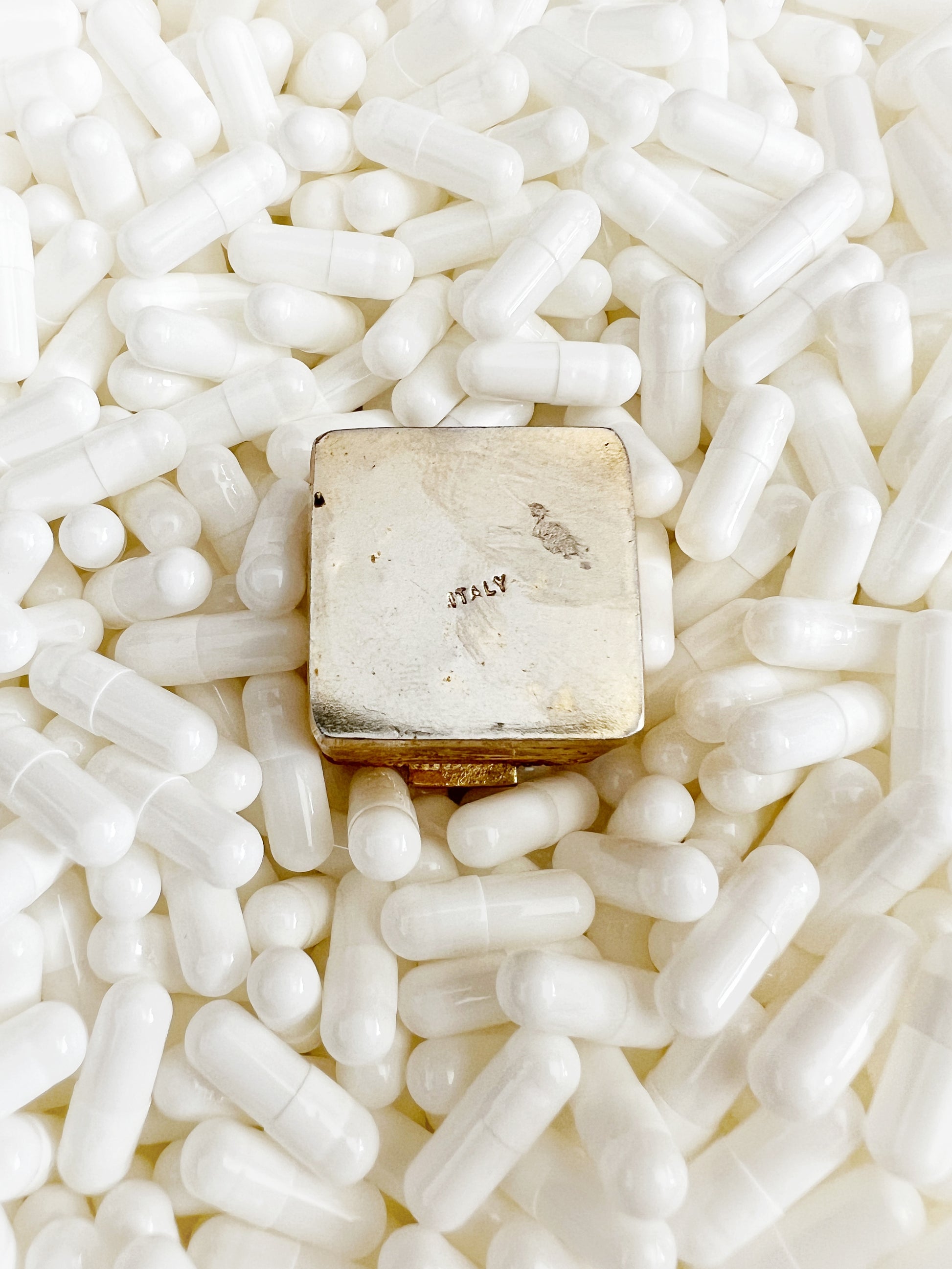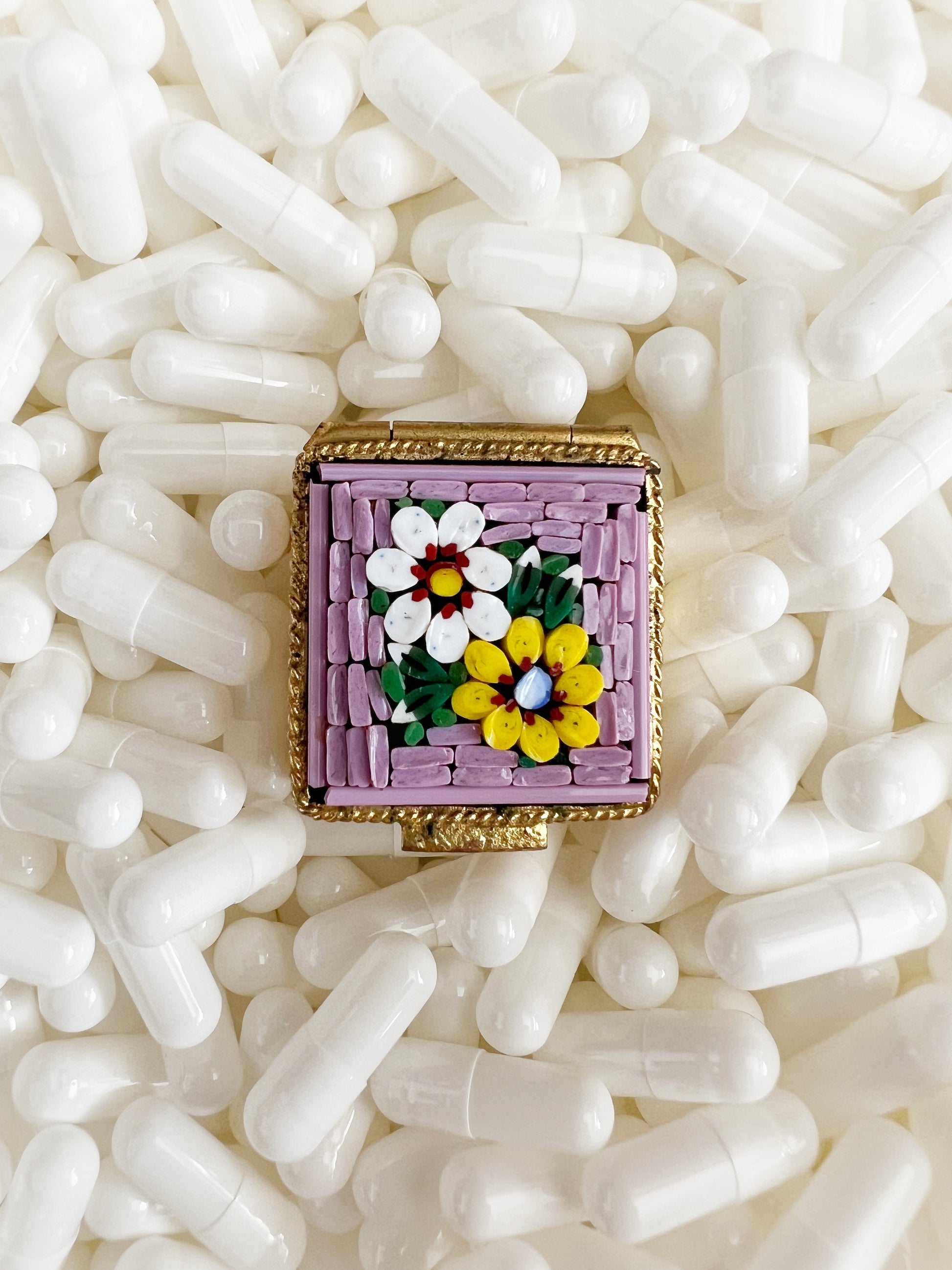 - Materials: Hand-cut glass tesserae set in gilt metal pill box.