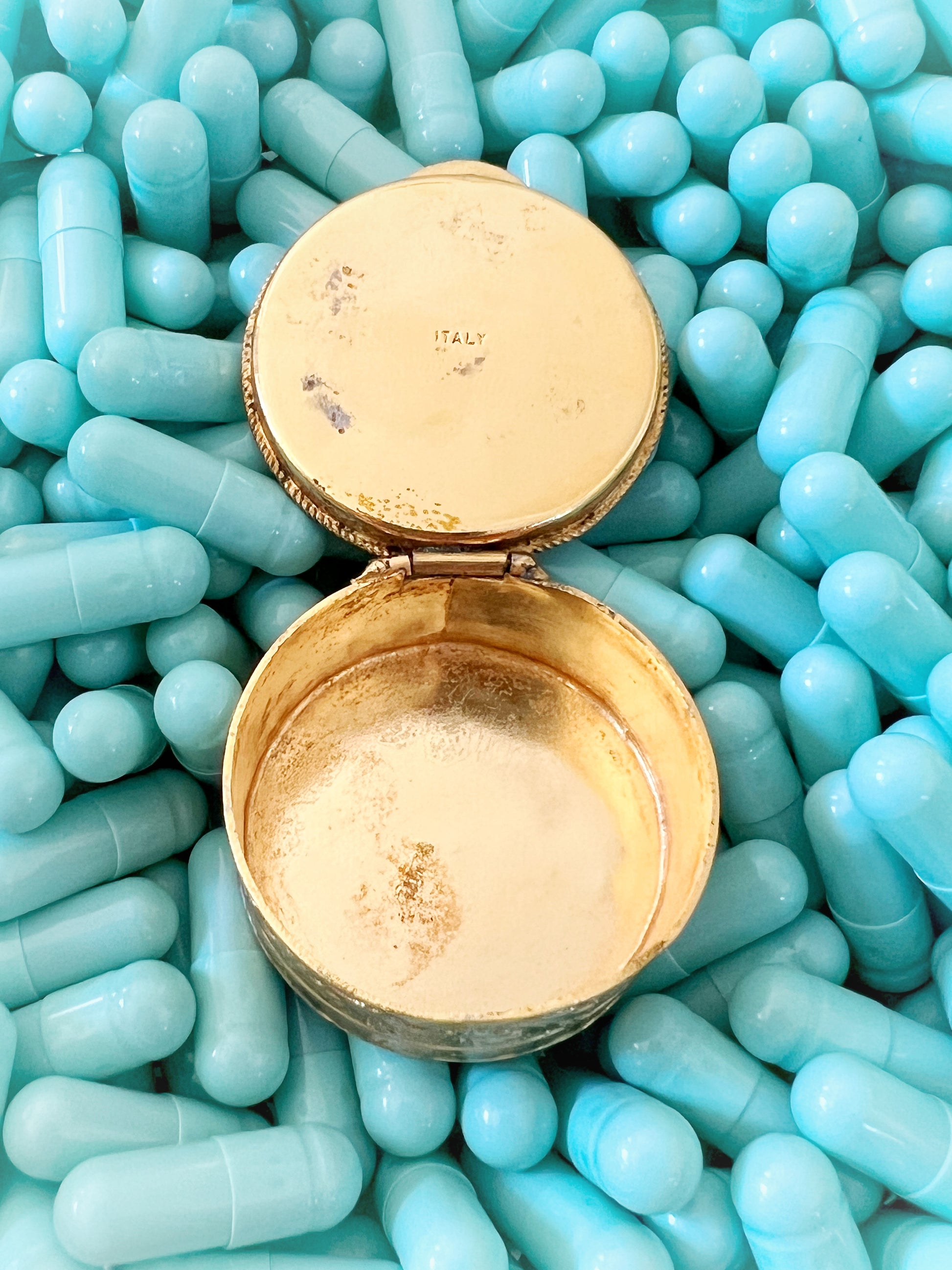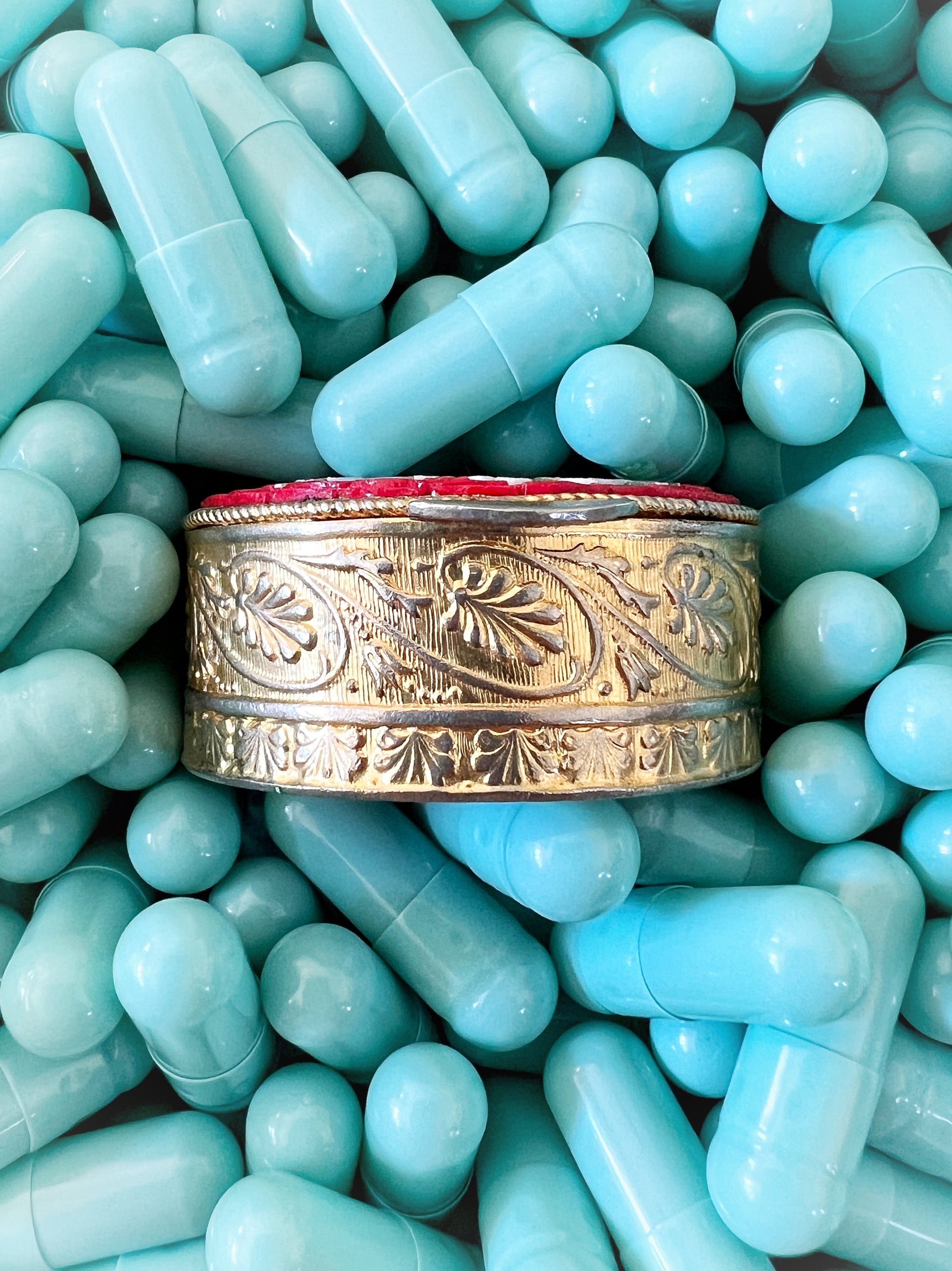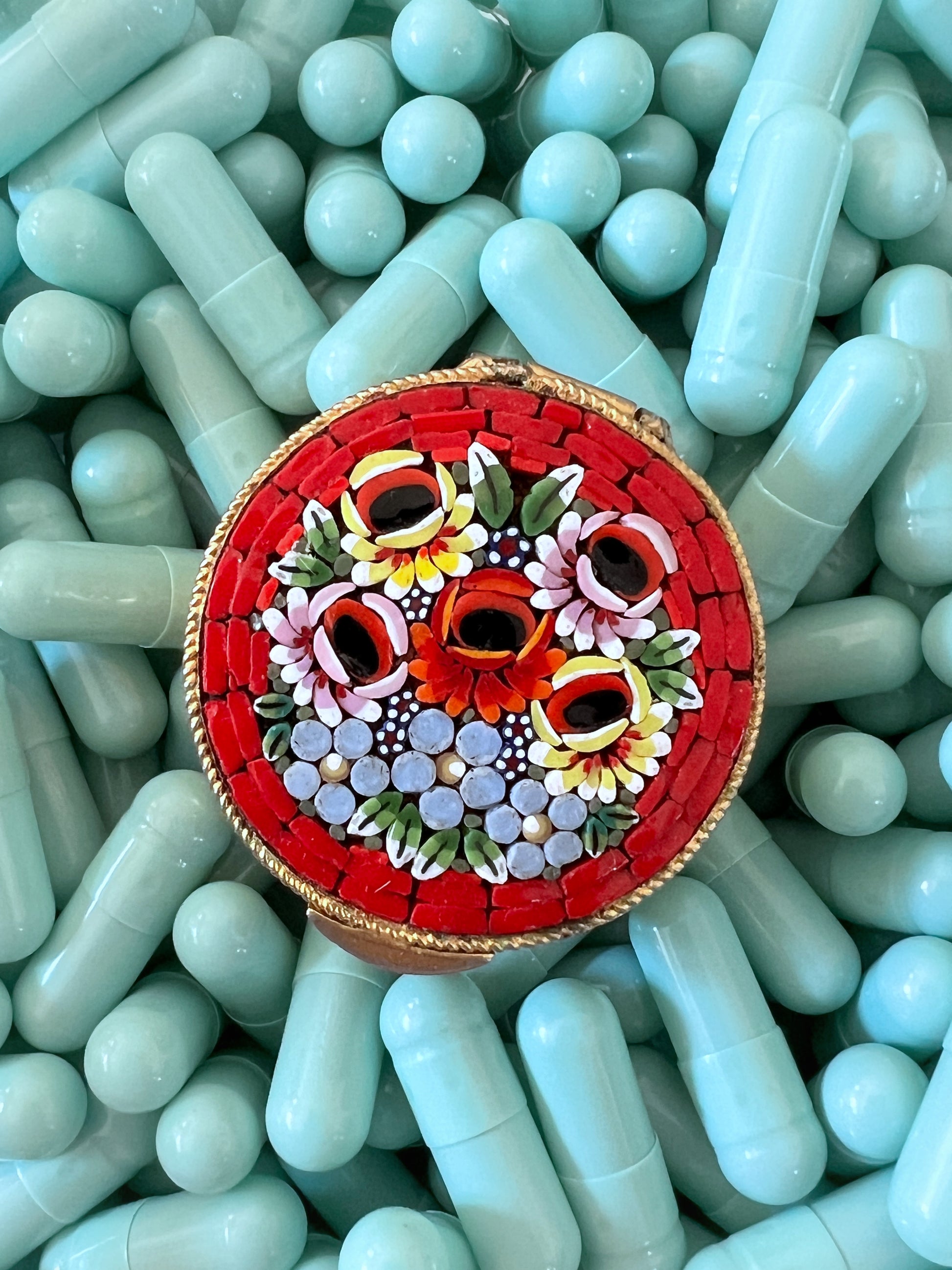 - Materials: Hand-cut glass tesserae on a red ground, gilt metal pill box frame.