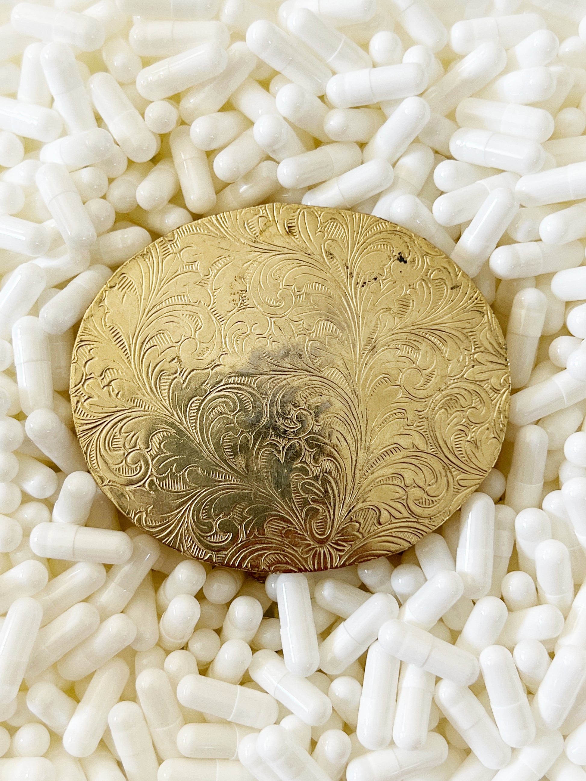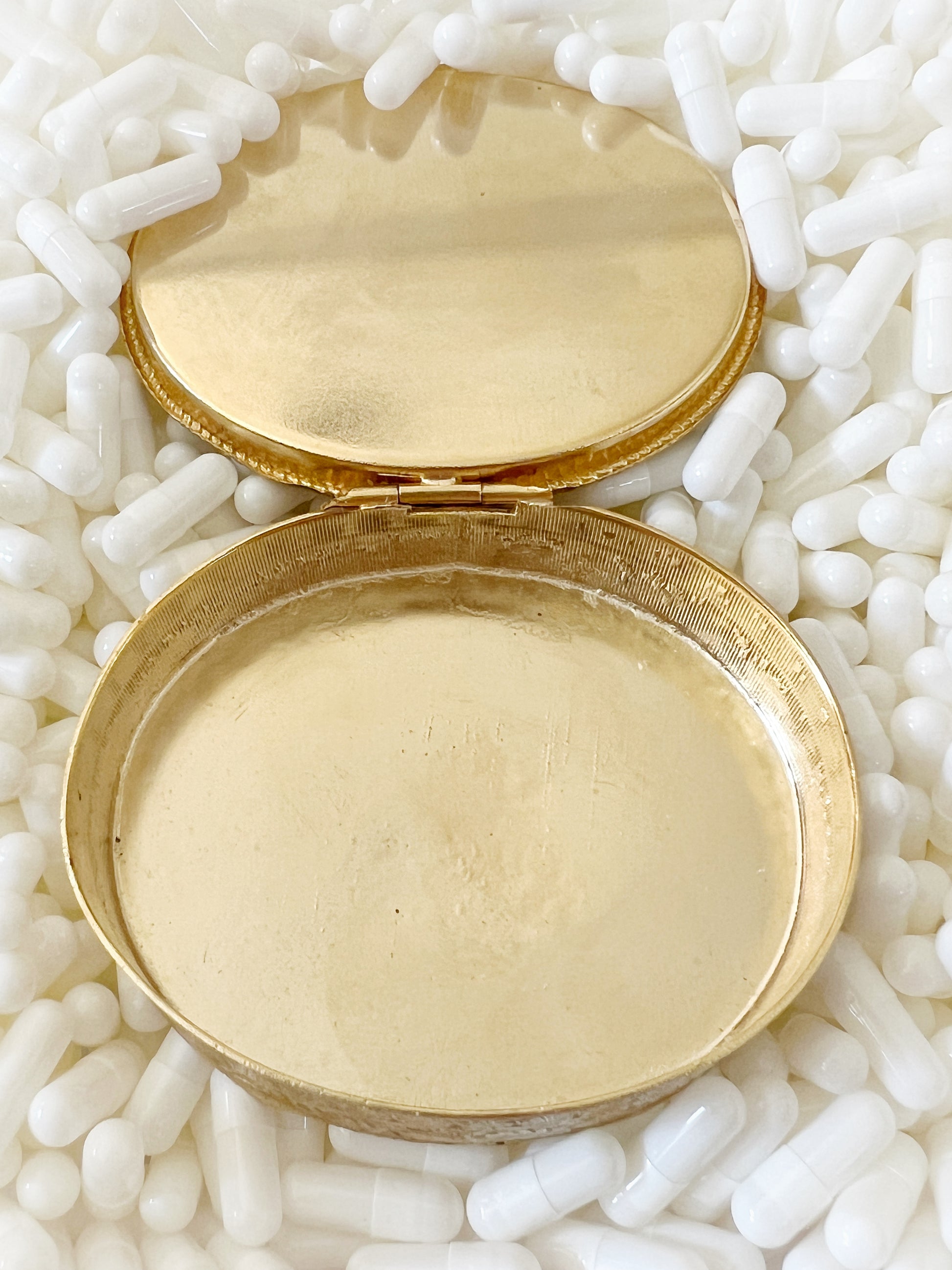 - Materials: Hand-cut glass tesserae set in gilt metal pill box.