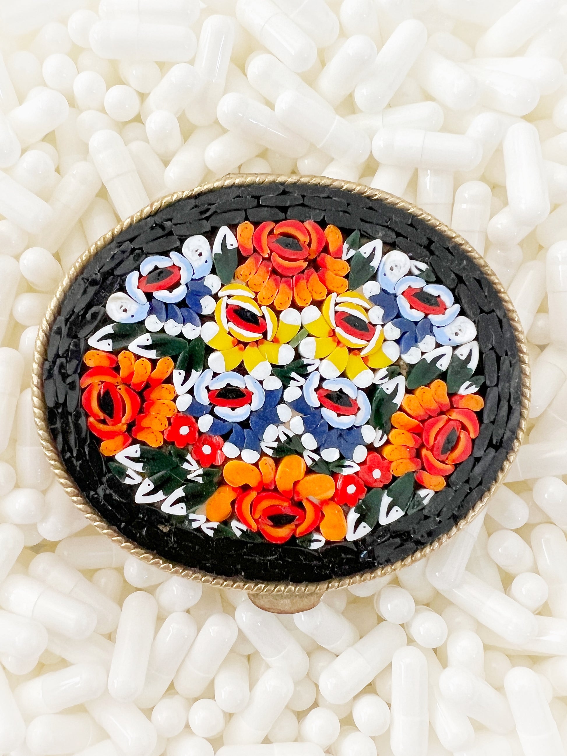 Grand and richly detailed, this vintage Italian micro mosaic pill box commands attention with its generous size and vibrant palette. A lush arrangement of scarlet roses, golden blooms, and sky-blue daisies radiates across the surface, each flower meticulously crafted from hand-cut glass tesserae. The bouquet rests against a dramatic black ground, which amplifies the brilliance of the colors and gives the design a jewel-like intensity.