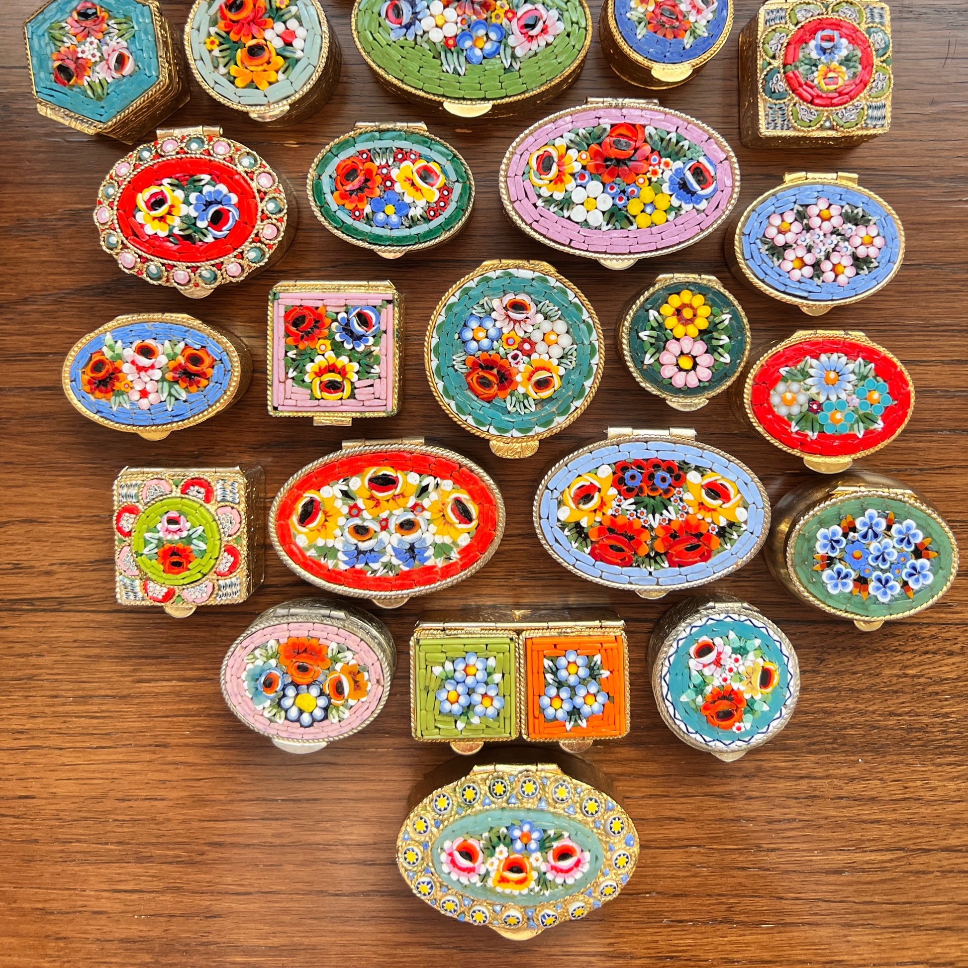 Grand and opulent, this vintage Italian micro mosaic pill box captivates with its scale, detail, and radiant ornamentation. Across the oval face, a bouquet of pink and scarlet roses, golden blooms, and sky-blue daisies bursts forth against a soft green ground, each blossom shaped with remarkable precision. Surrounding the central motif, a border of starry millefiori rosettes twinkles like lanterns strung across a summer piazza, recalling the glamour of 1950s Italy, when evenings stretched long and every corner of Rome and Florence shimmered with light and possibility.