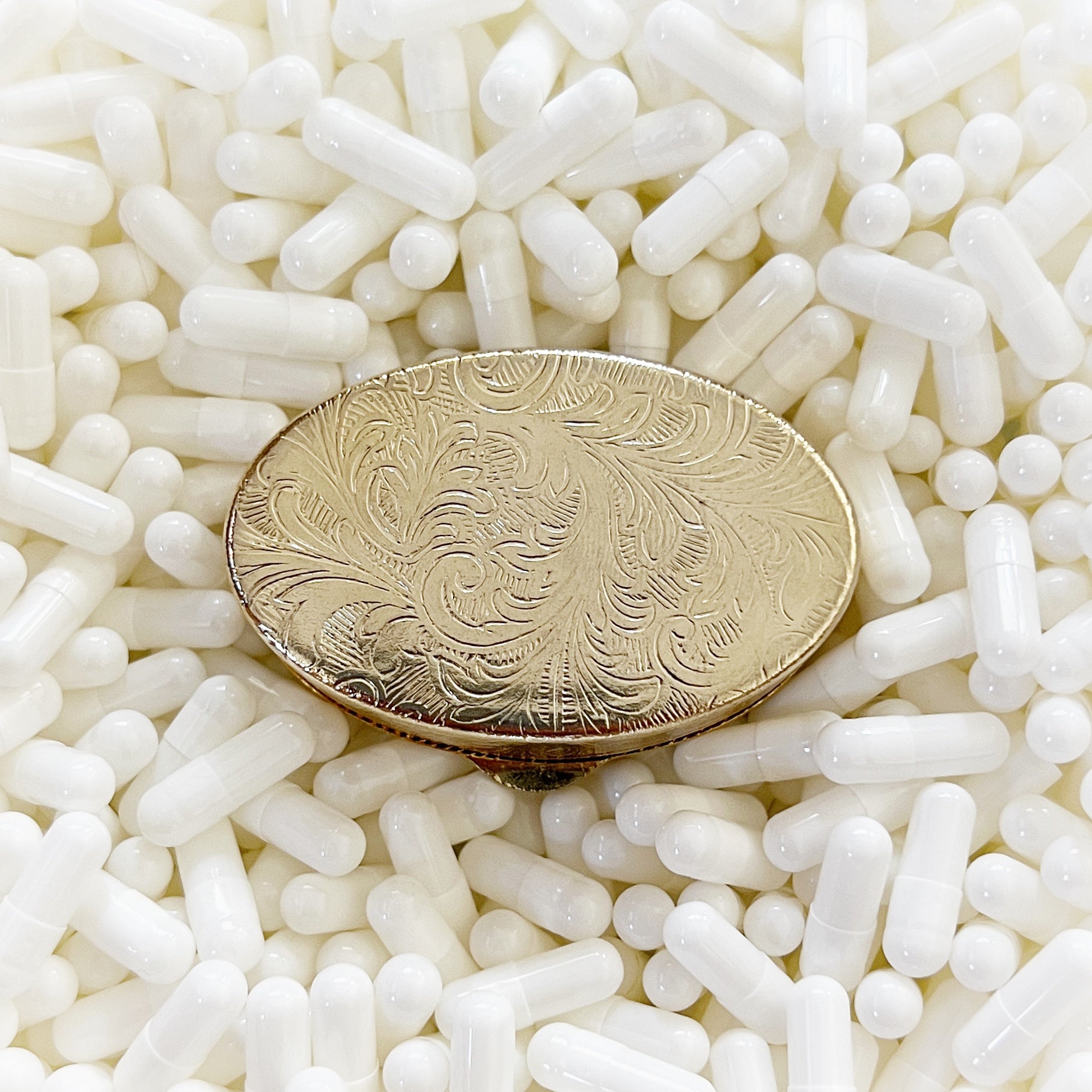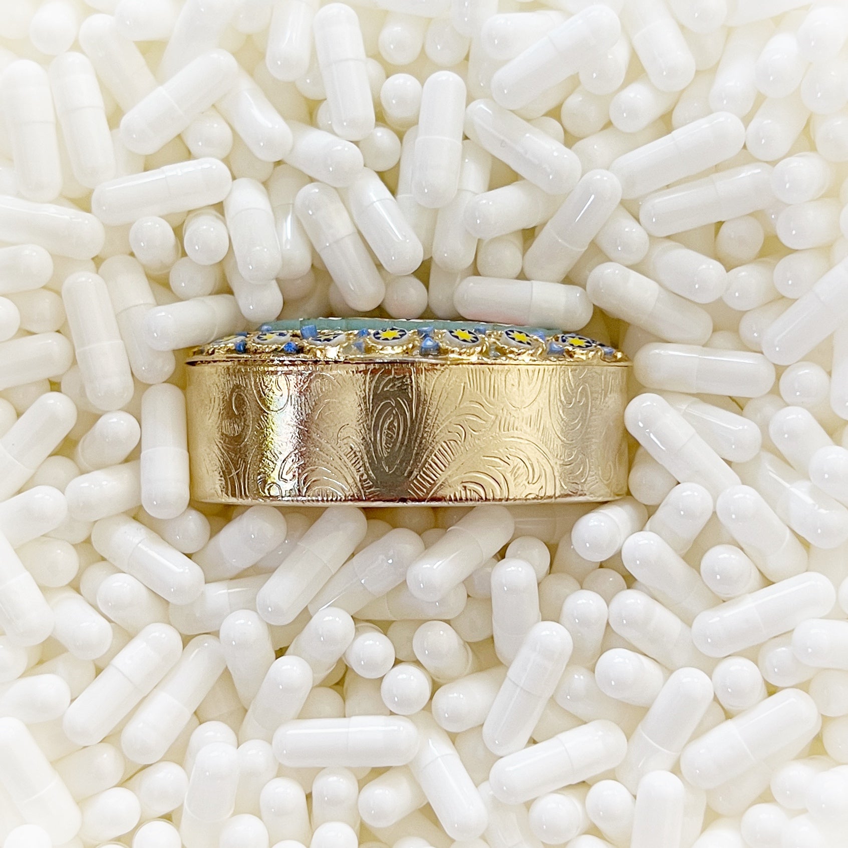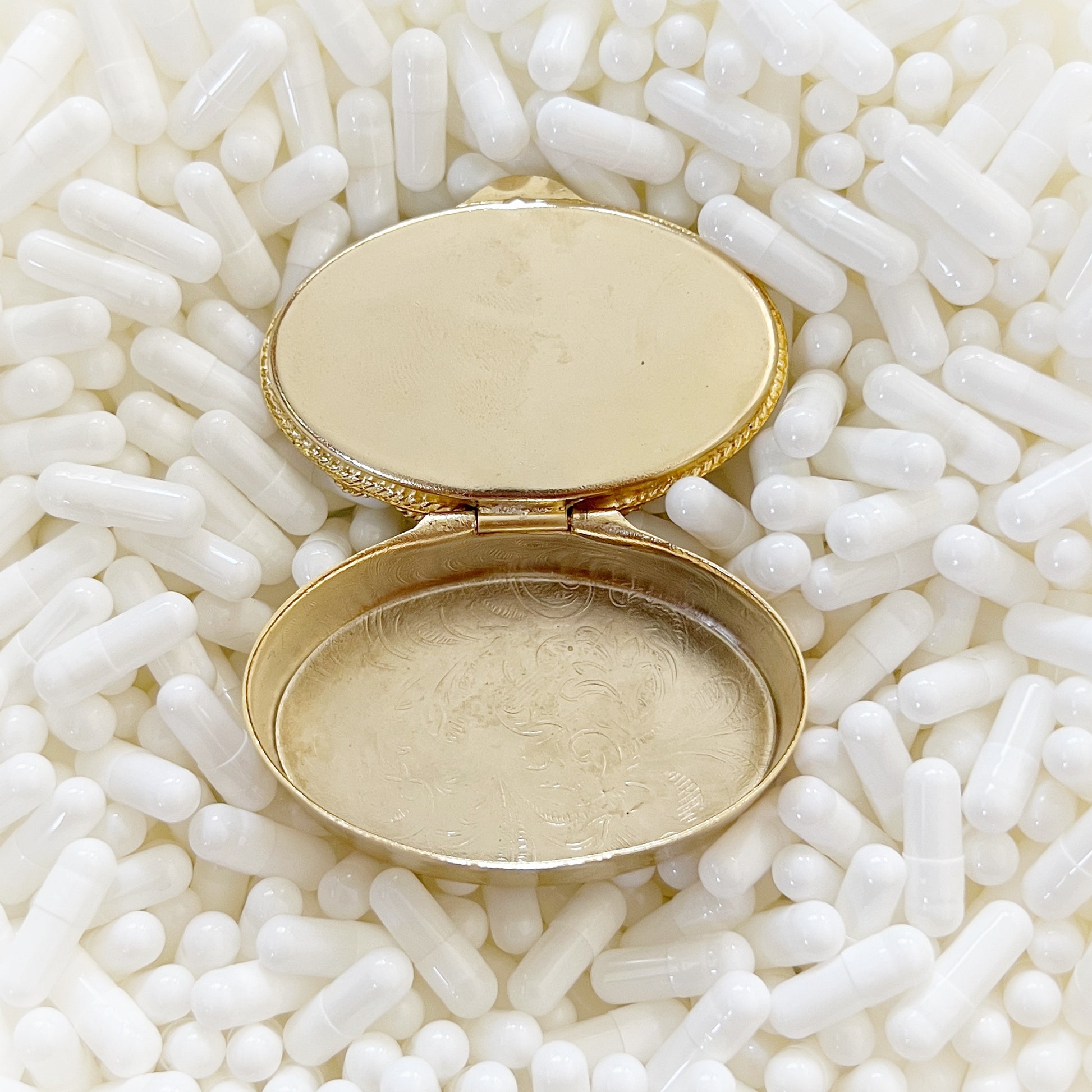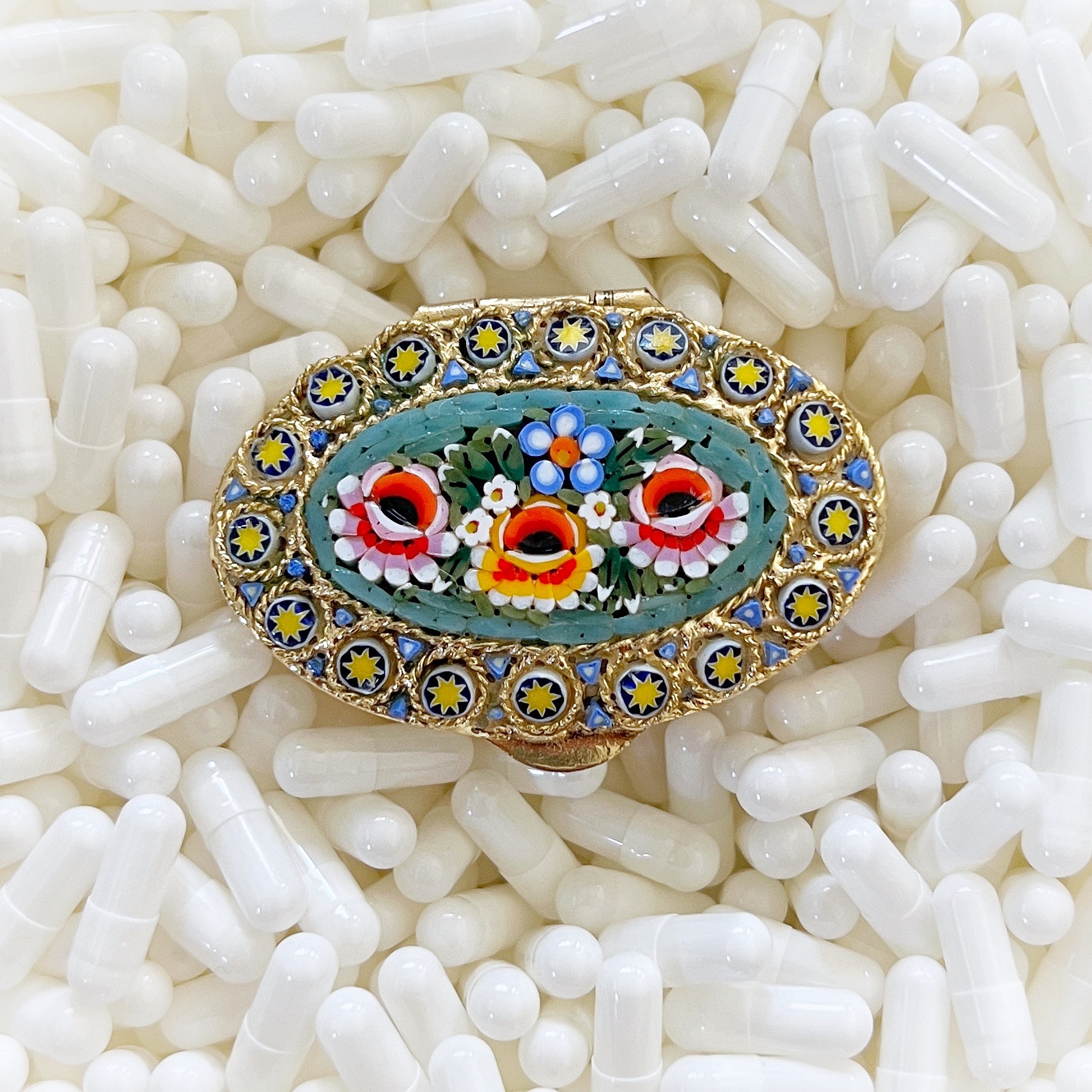 - Materials: Hand-cut glass tesserae set in gilt metal pill box.