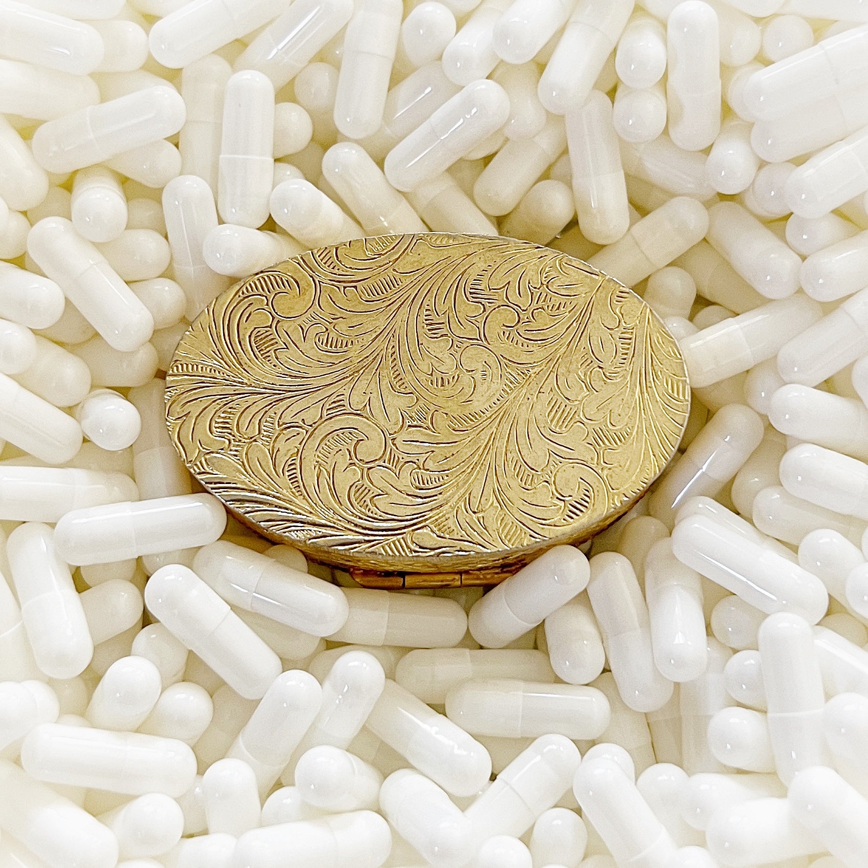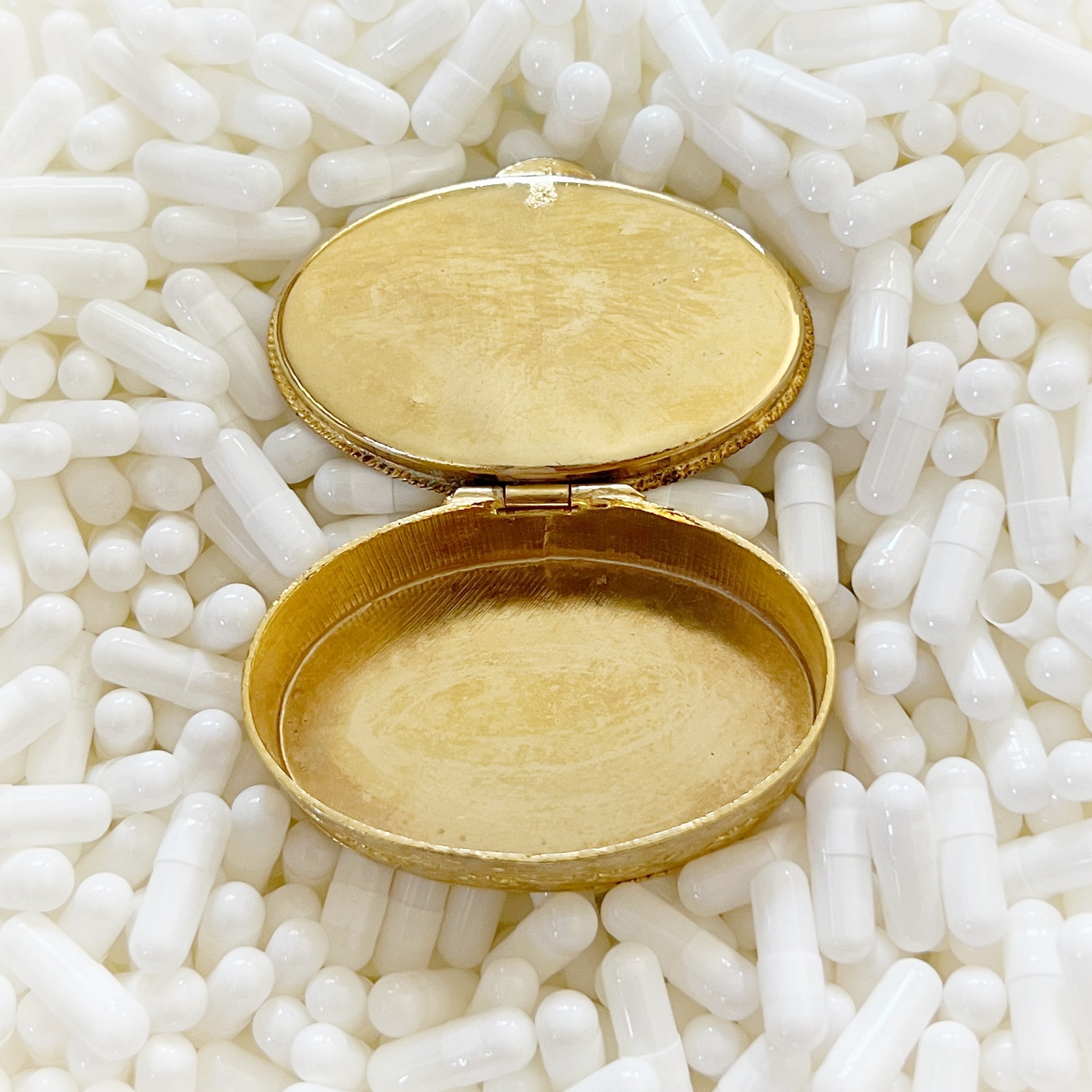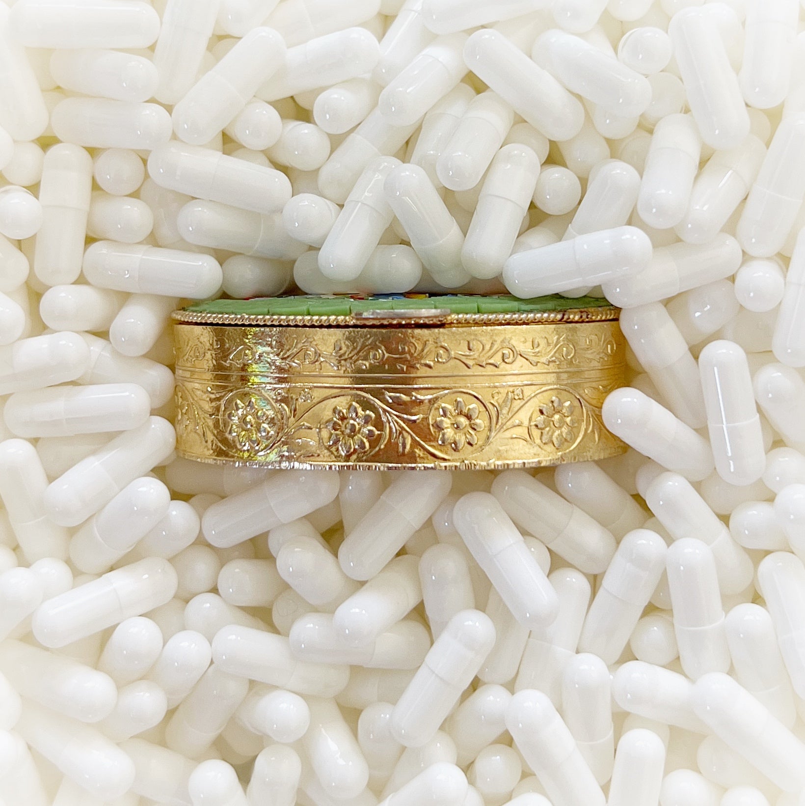 - Materials: Hand-cut glass tesserae set in gilt metal pill box.