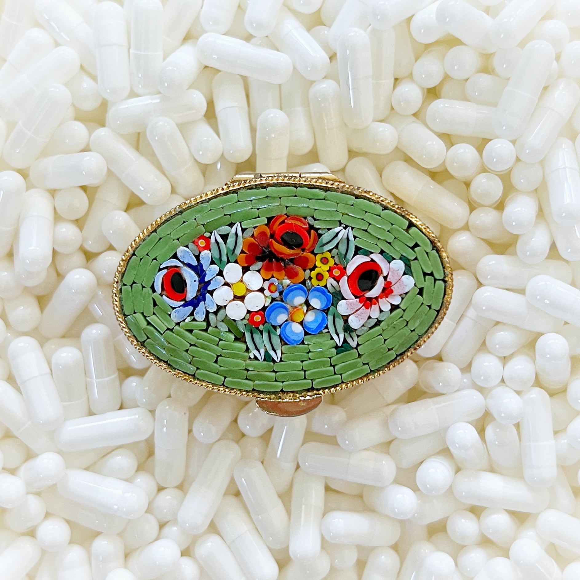 Vivid and expansive, this vintage Italian micro mosaic pill box commands attention with its lush green ground and exuberant bouquet. At the center, scarlet roses, cobalt daisies, golden florets, and snowy white blossoms gather together in a lively spray of color. The florals radiate with a painterly quality, their arrangement recalling the vibrant markets and blooming gardens that line Italy’s historic streets.