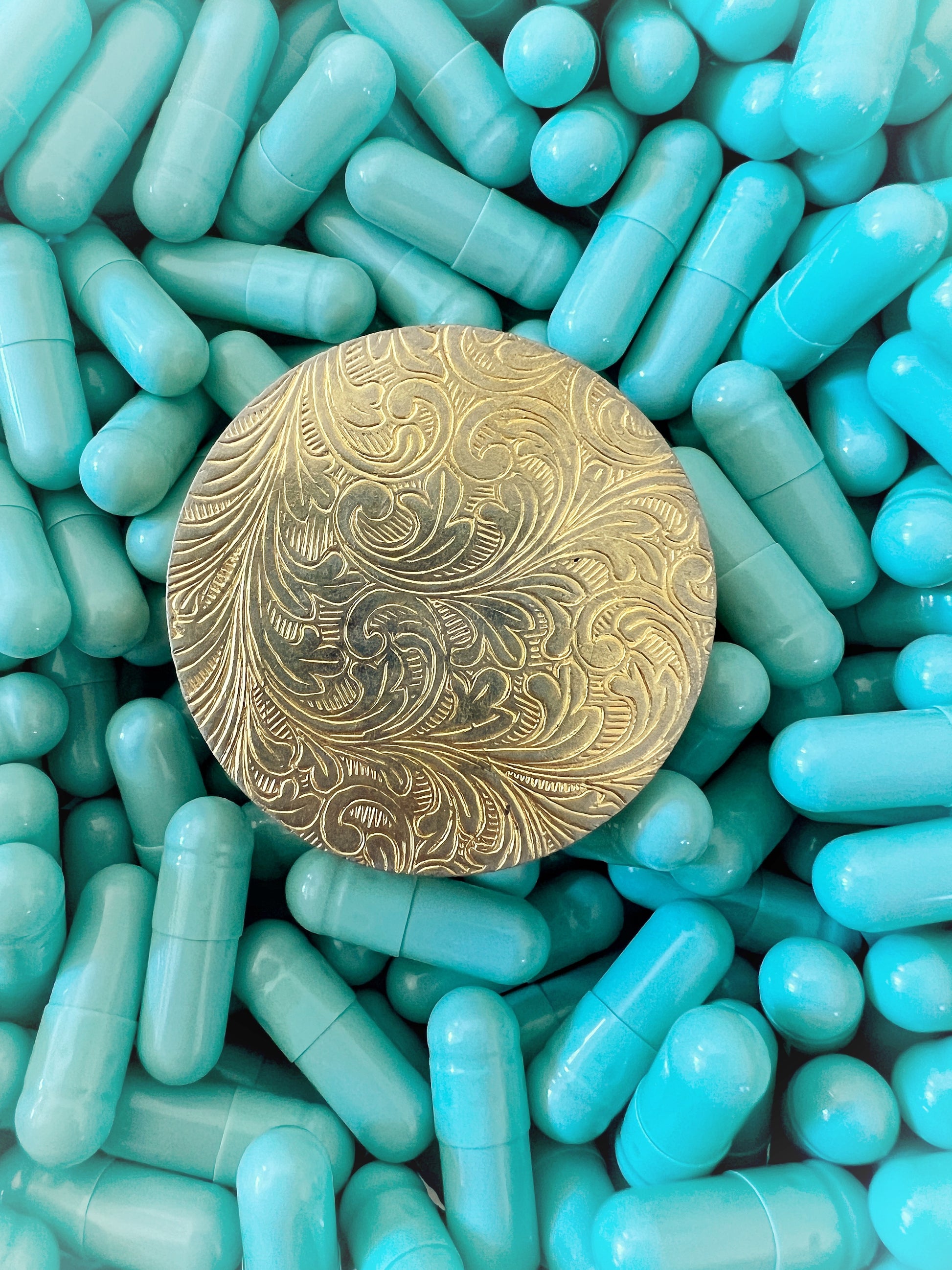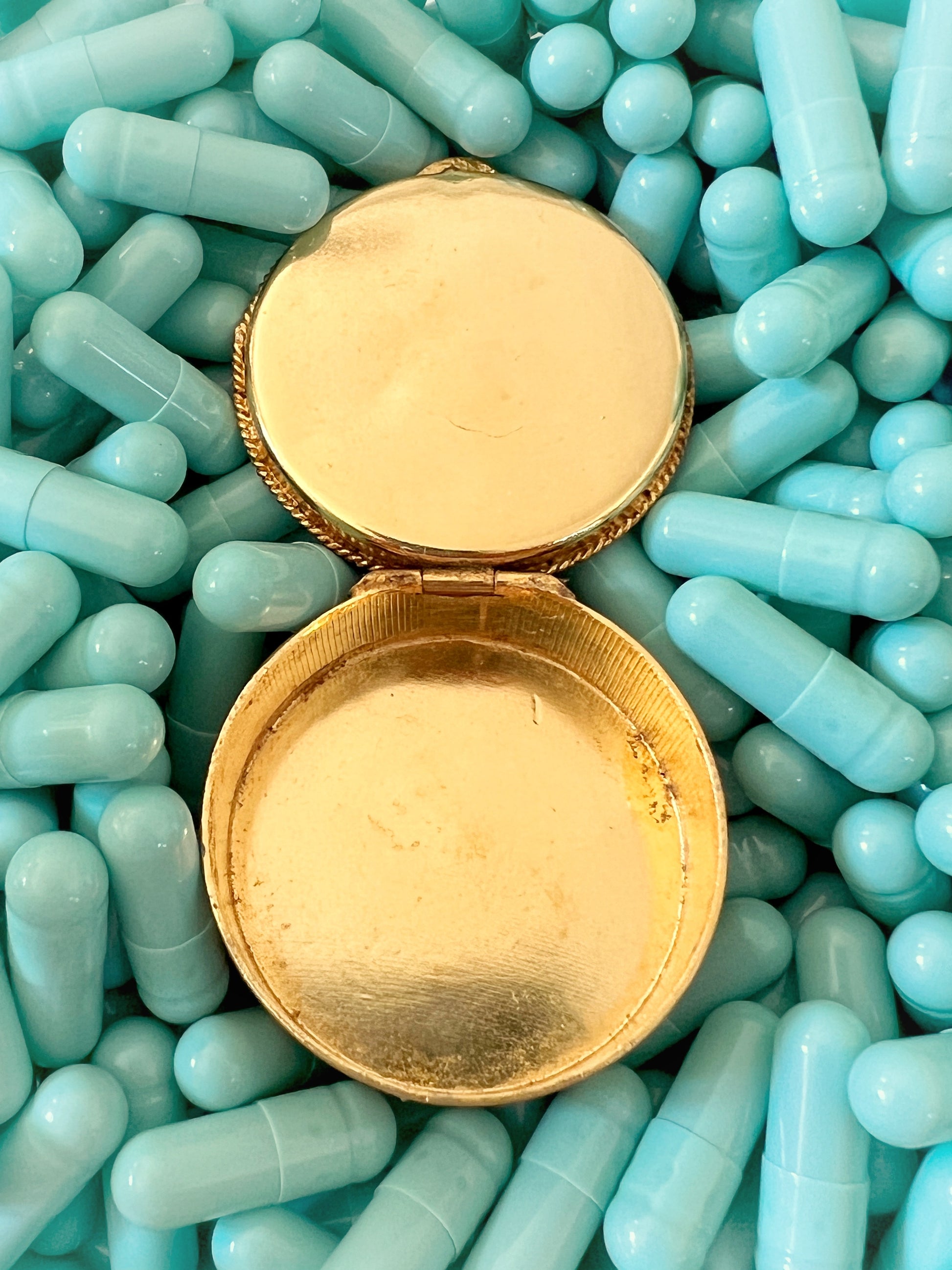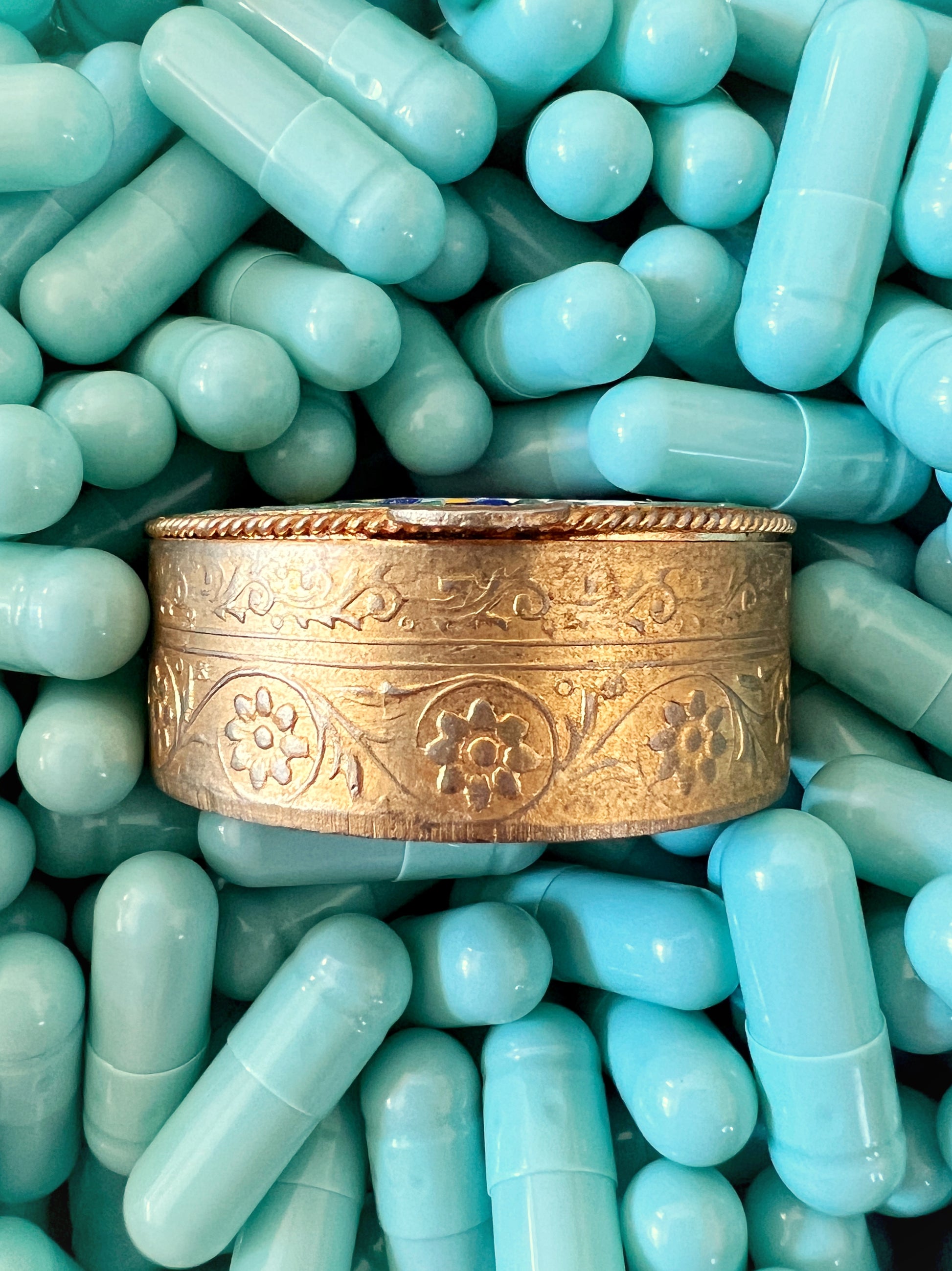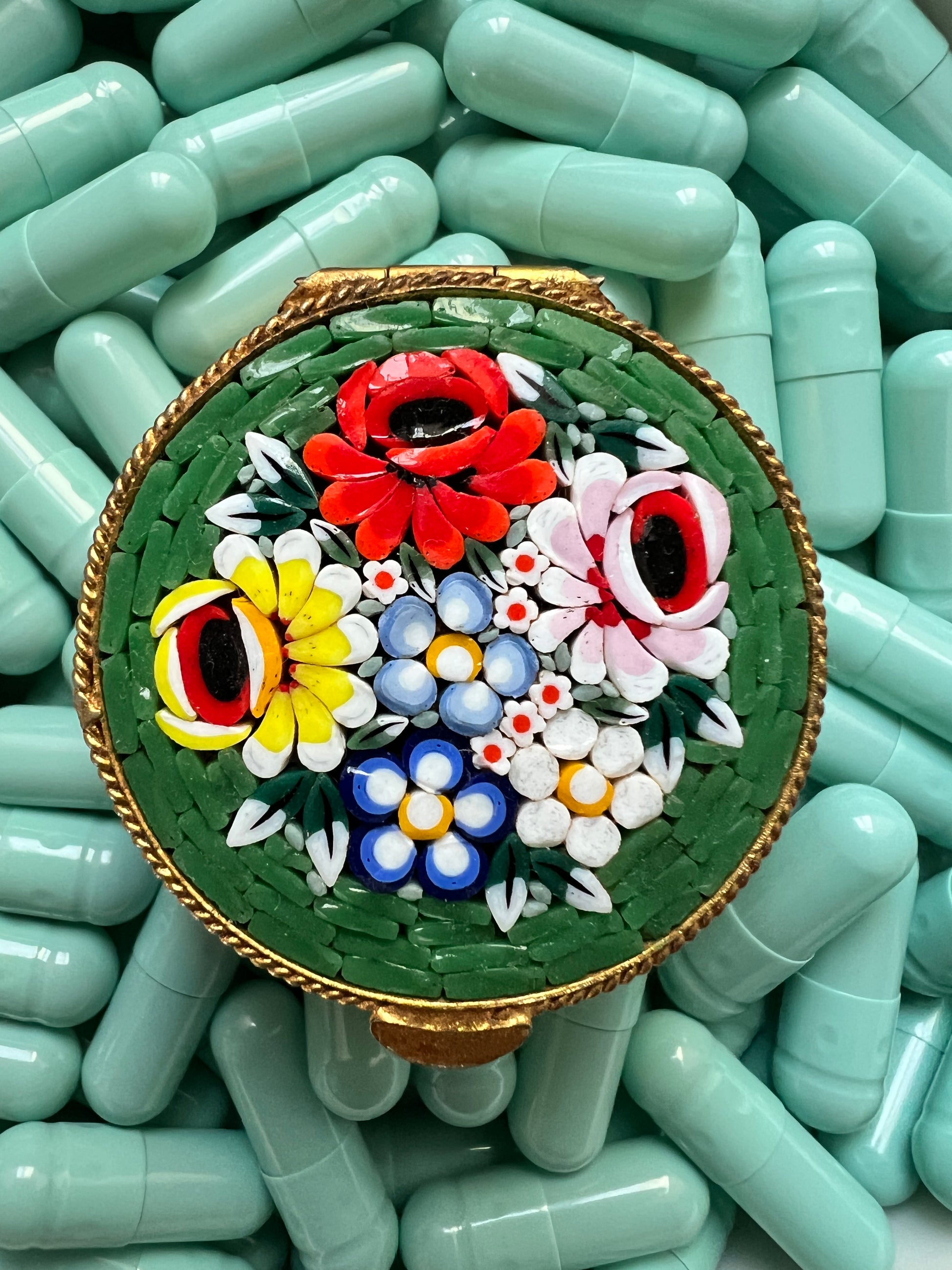 - Materials: Hand-cut glass tesserae inlaid on a green ground, gilt metal pill box frame.