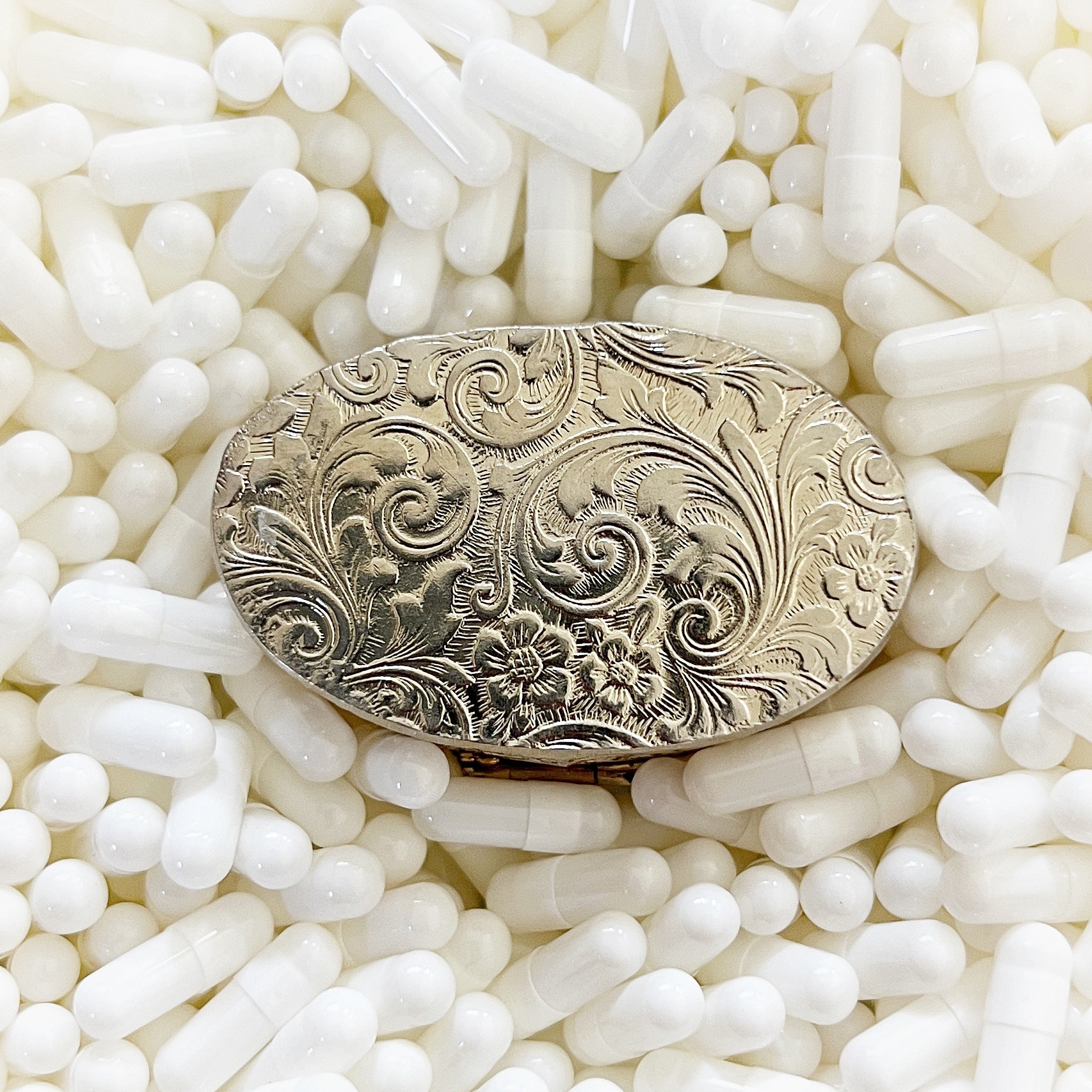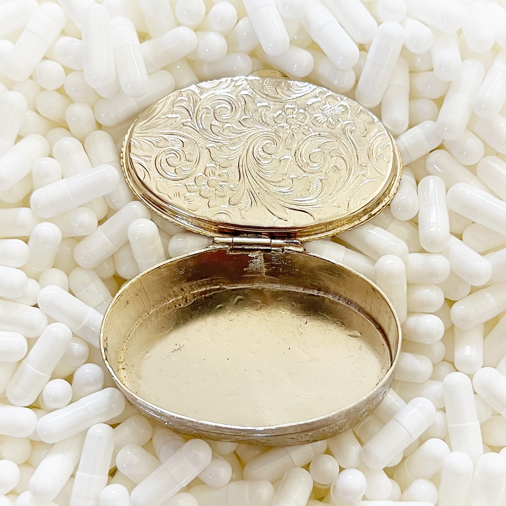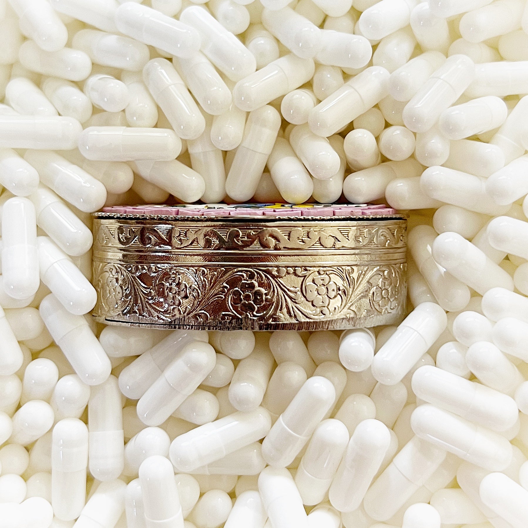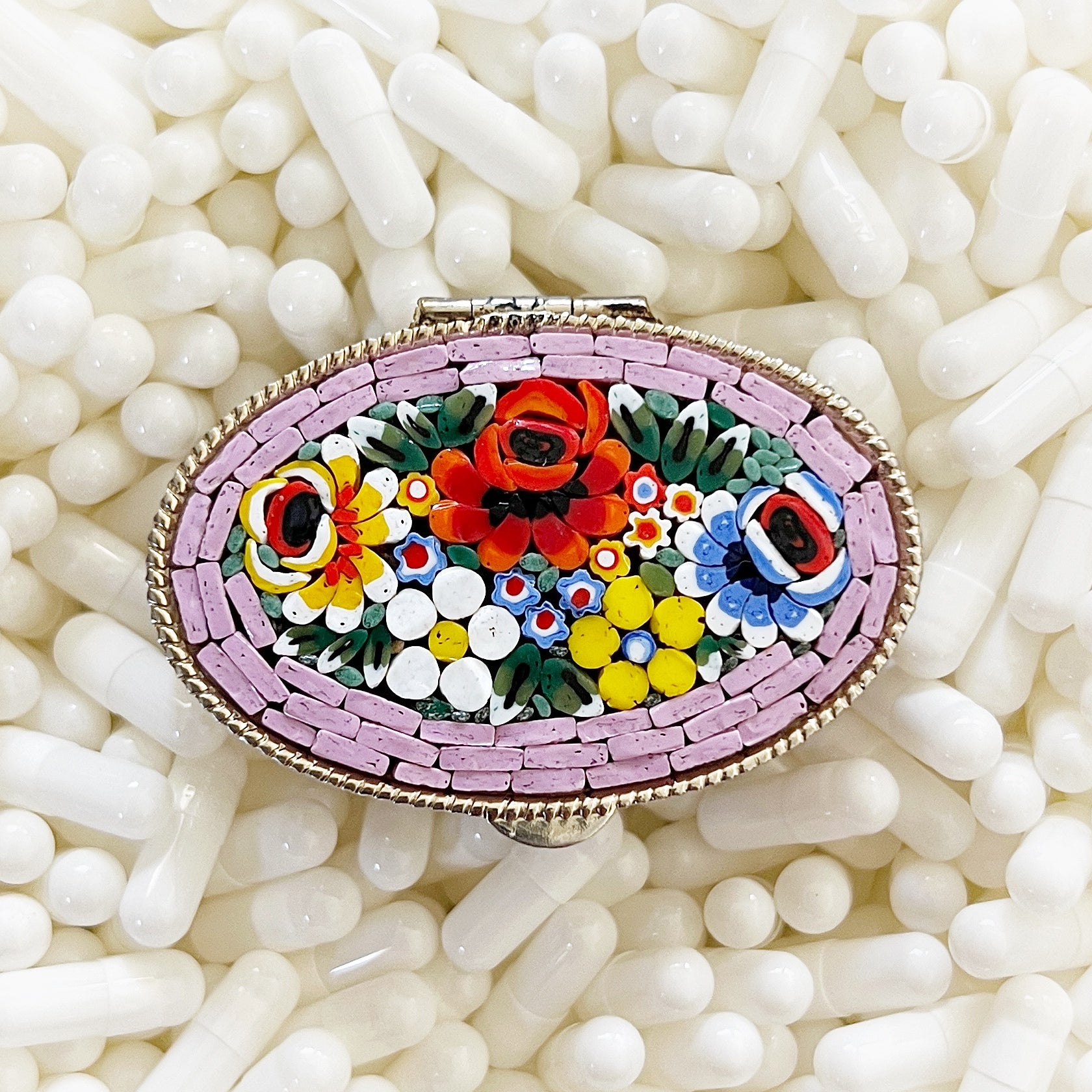- Materials: Hand-cut glass tesserae set in gilt metal pill box.