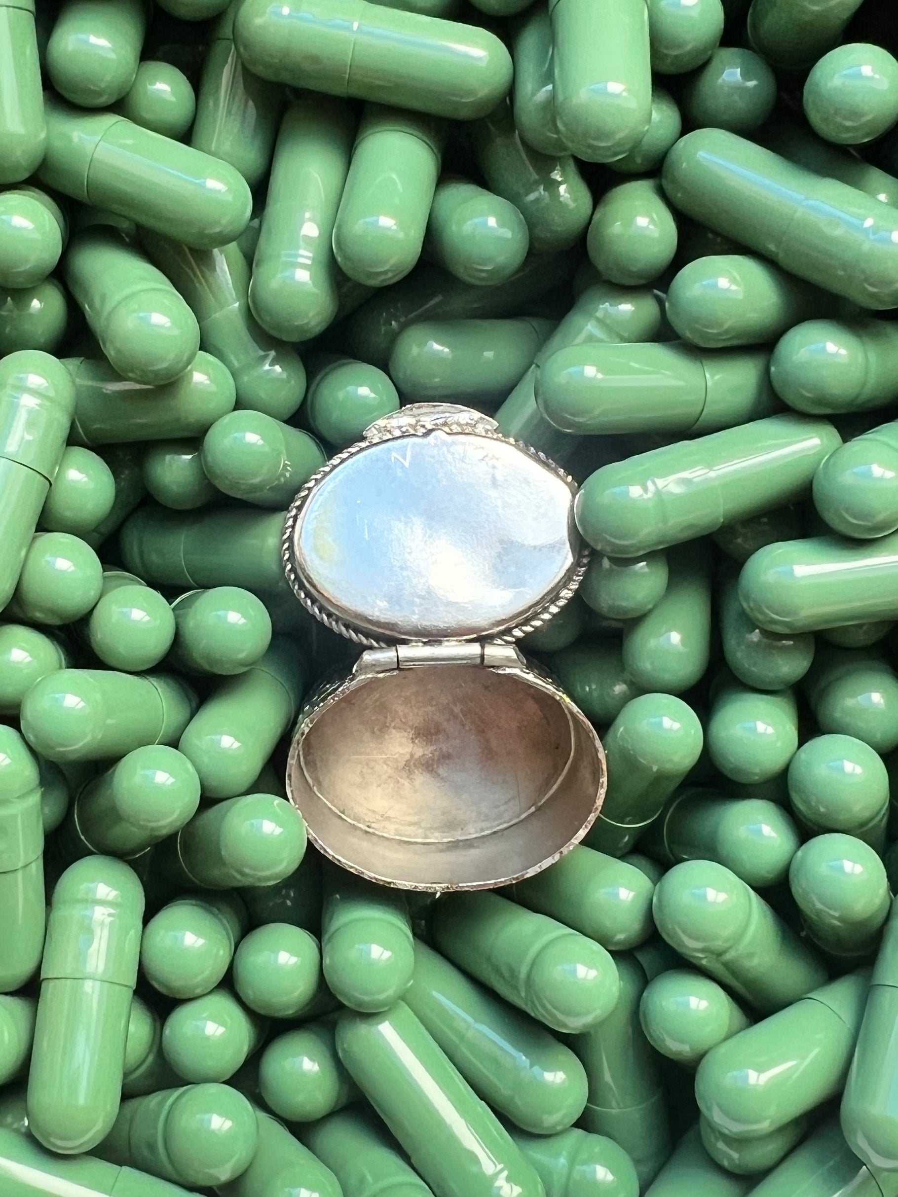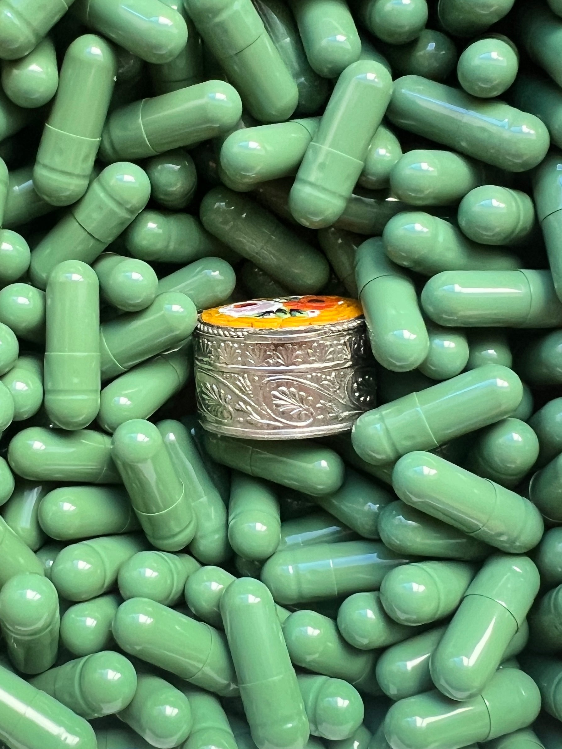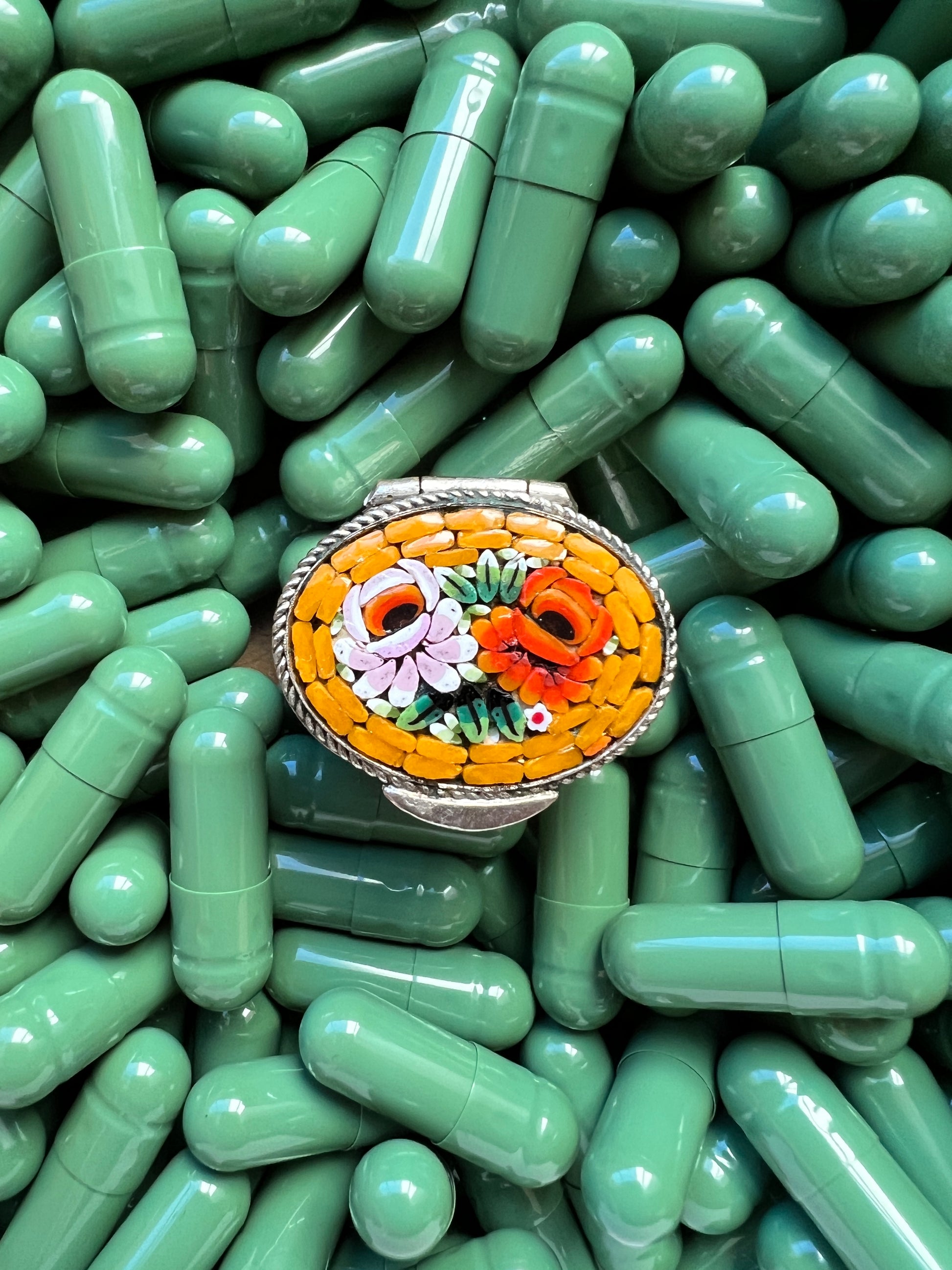- Materials: Hand-cut glass tesserae set in gilt metal pill box.