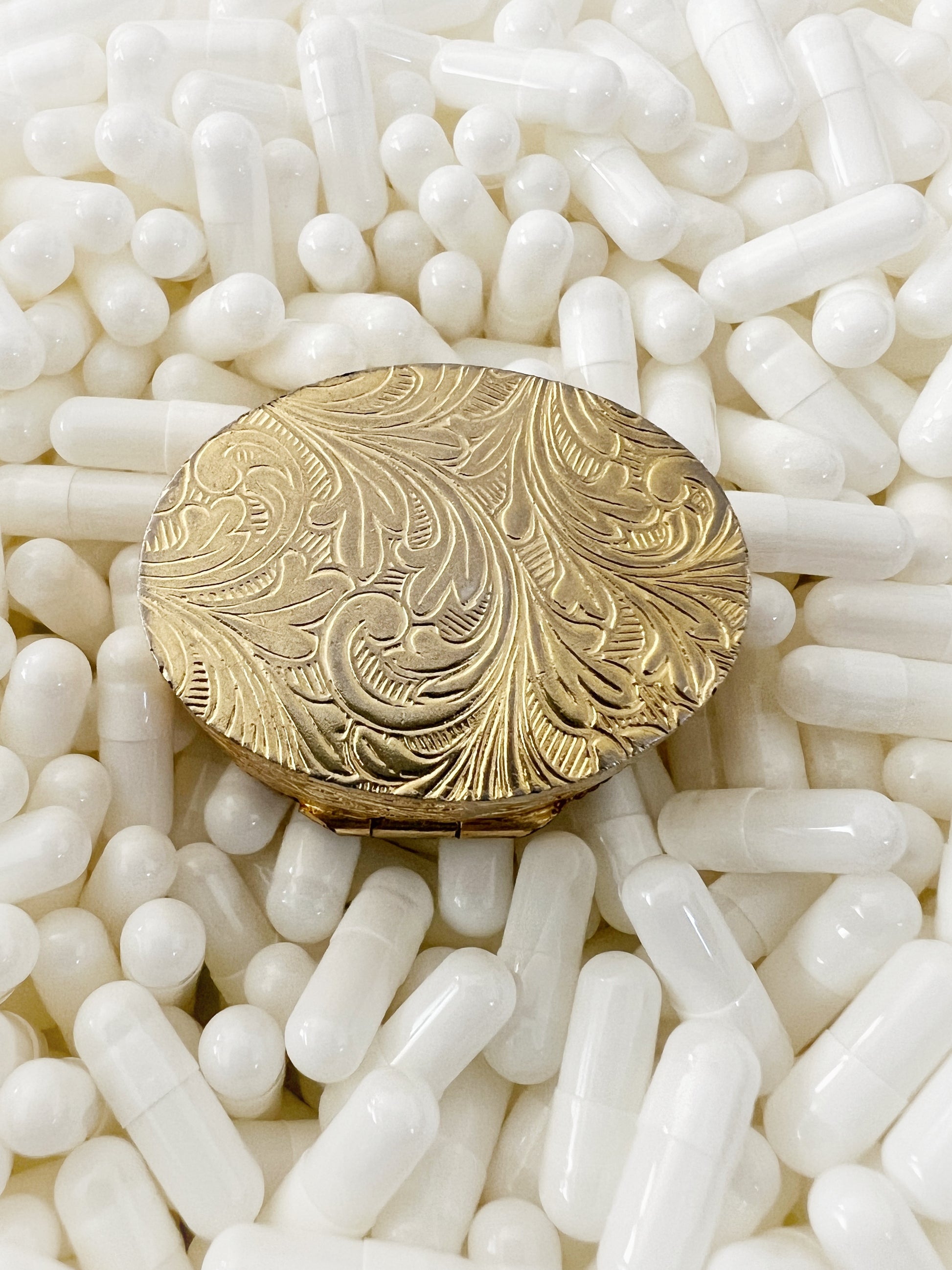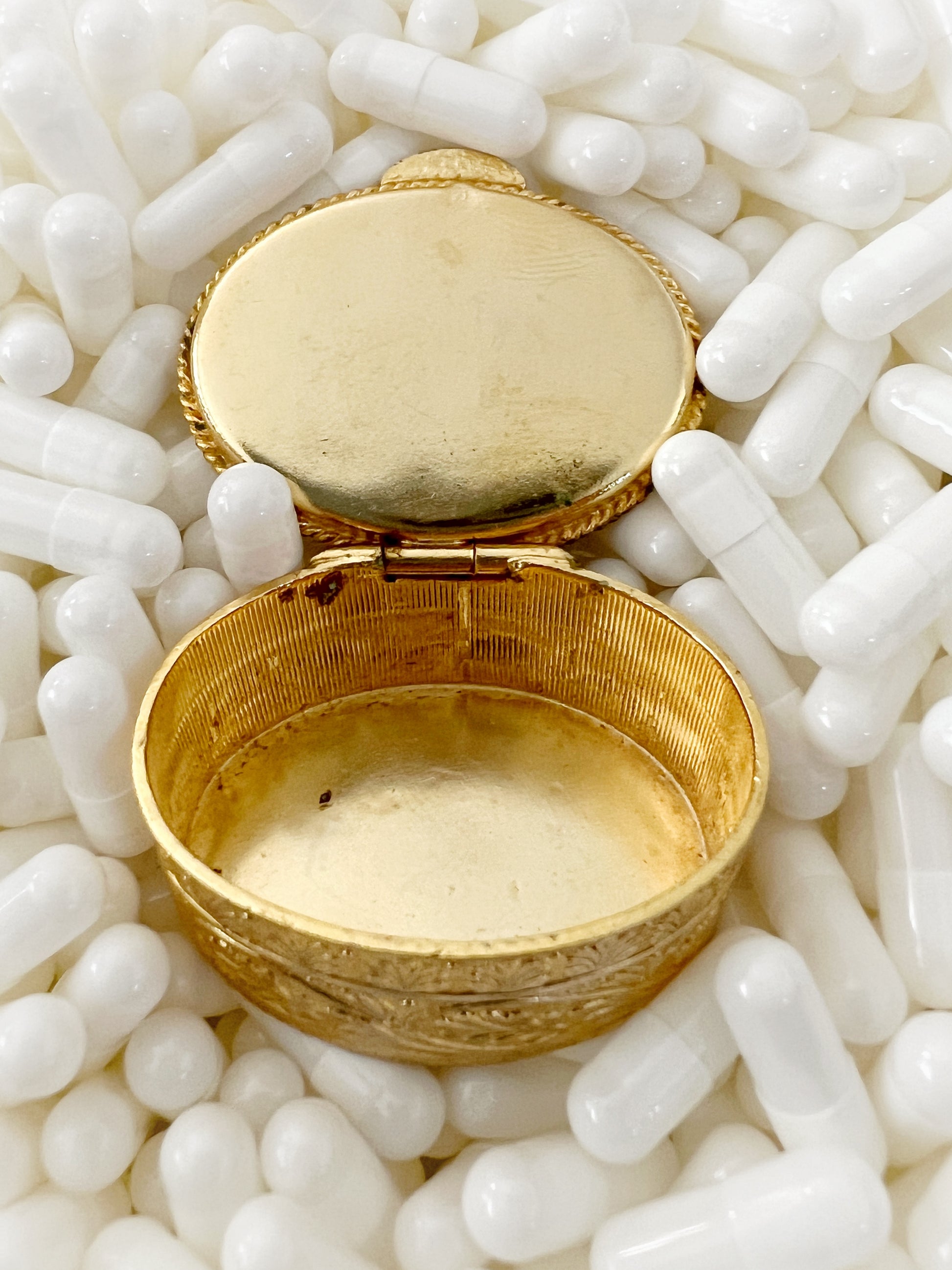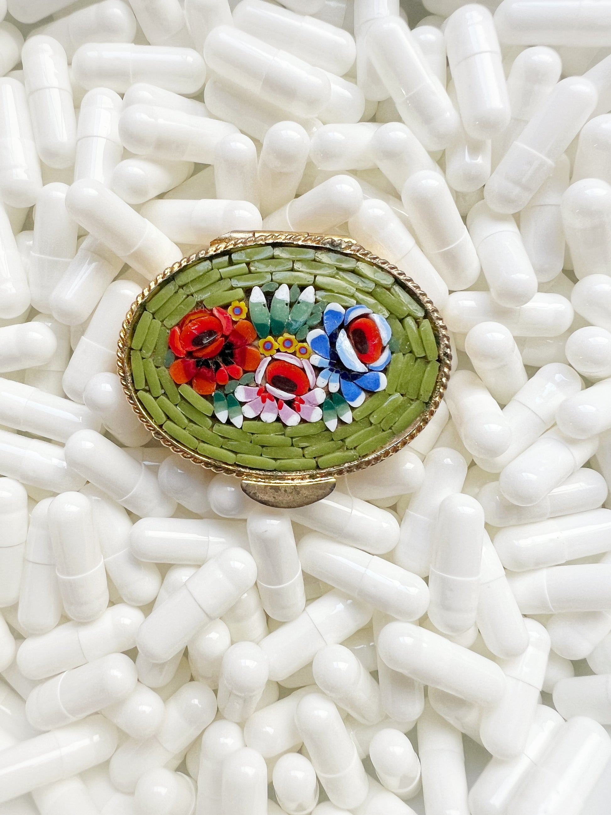 - Materials: Hand-cut glass tesserae on green ground, gilt metal pill box frame.