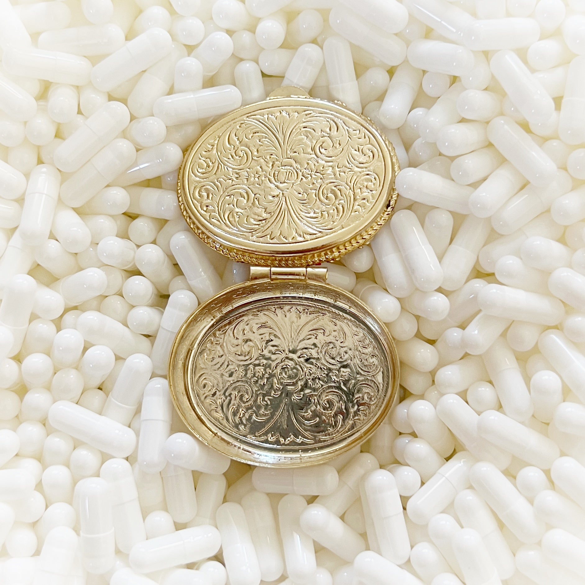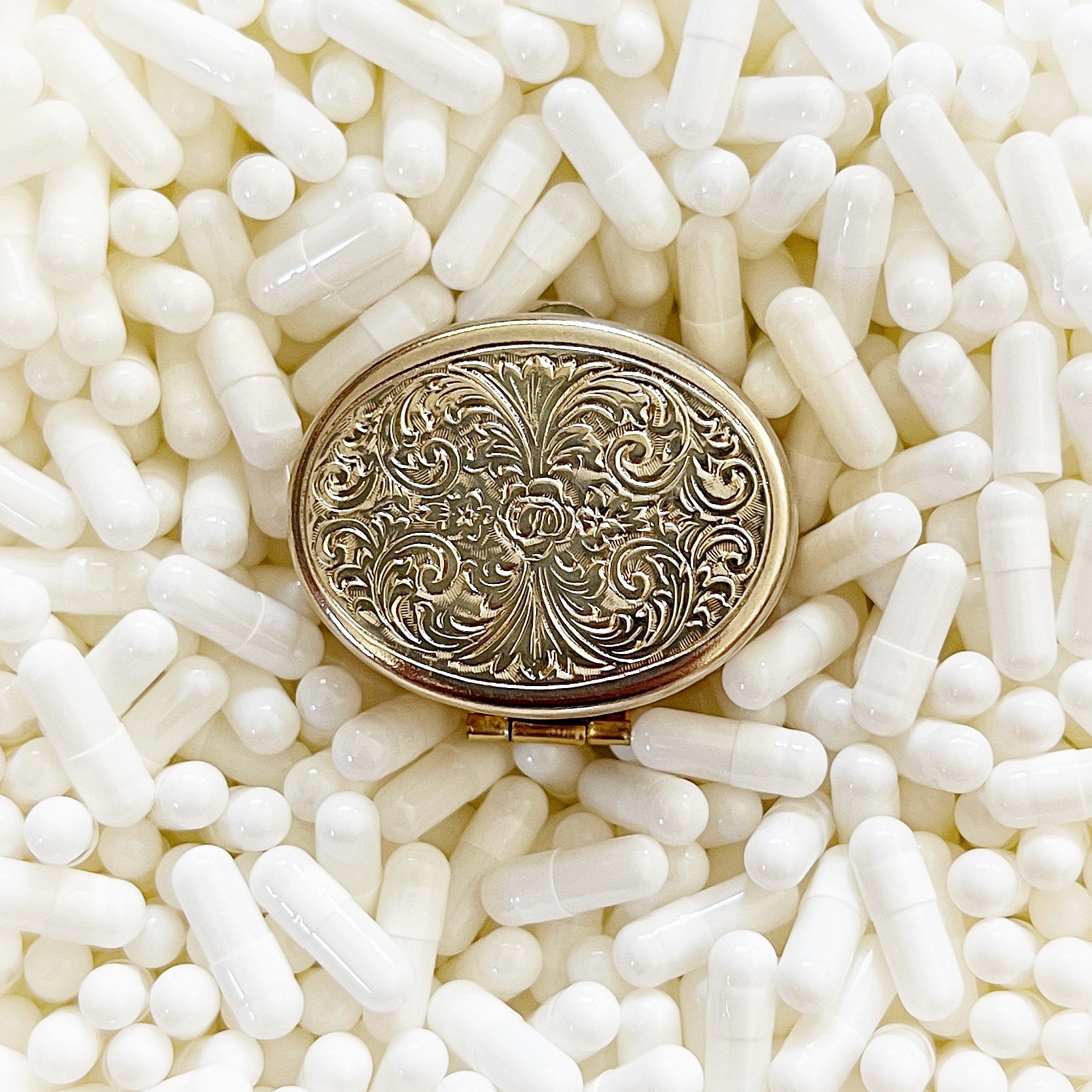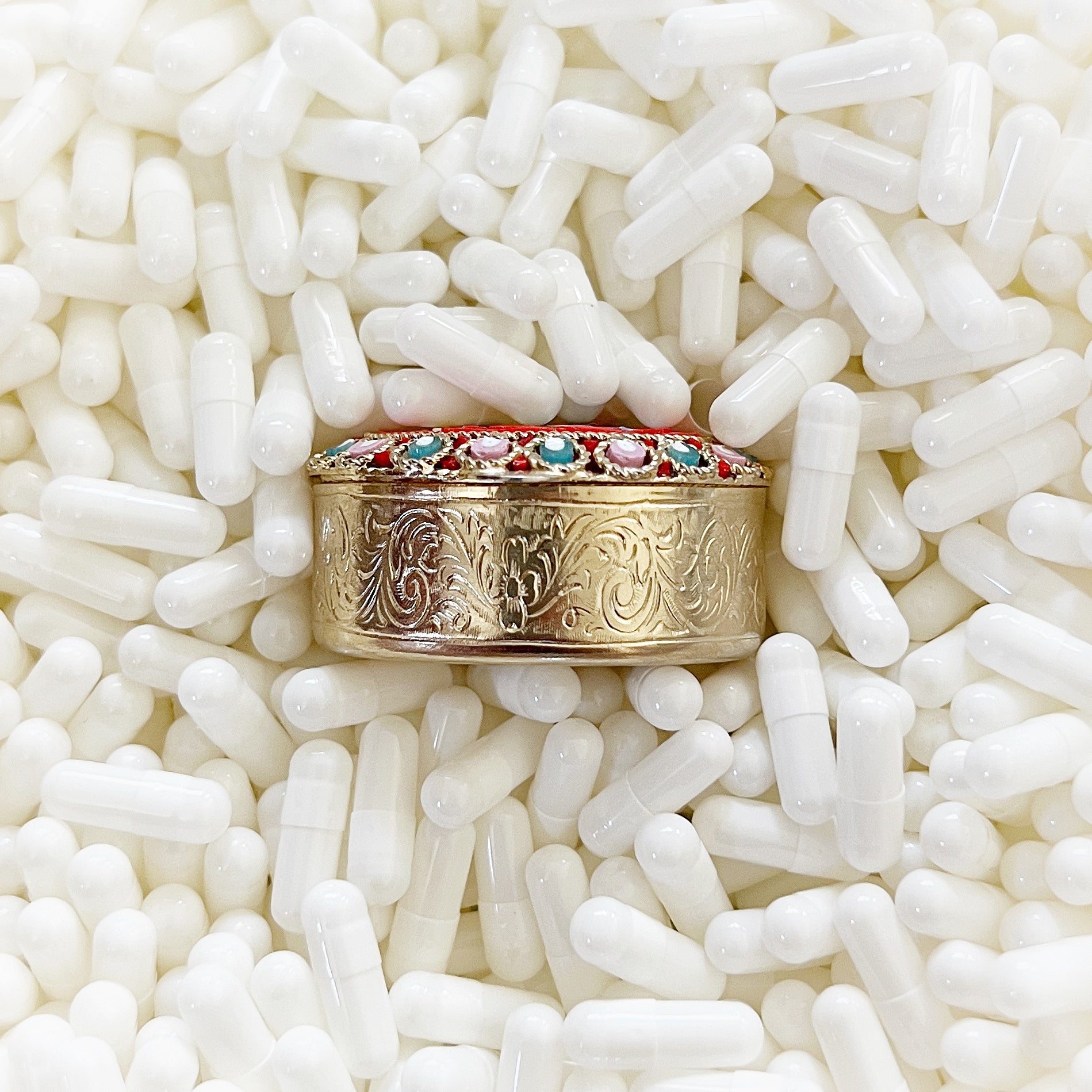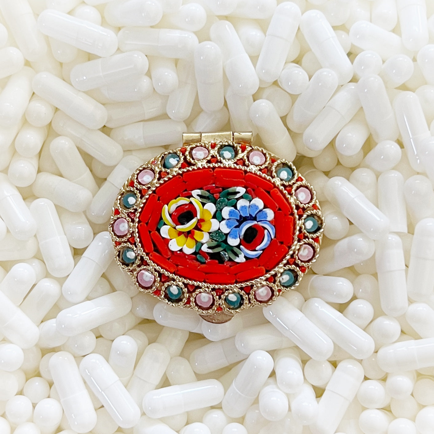 - Materials: Hand-cut glass tesserae set in gilt metal pill box.