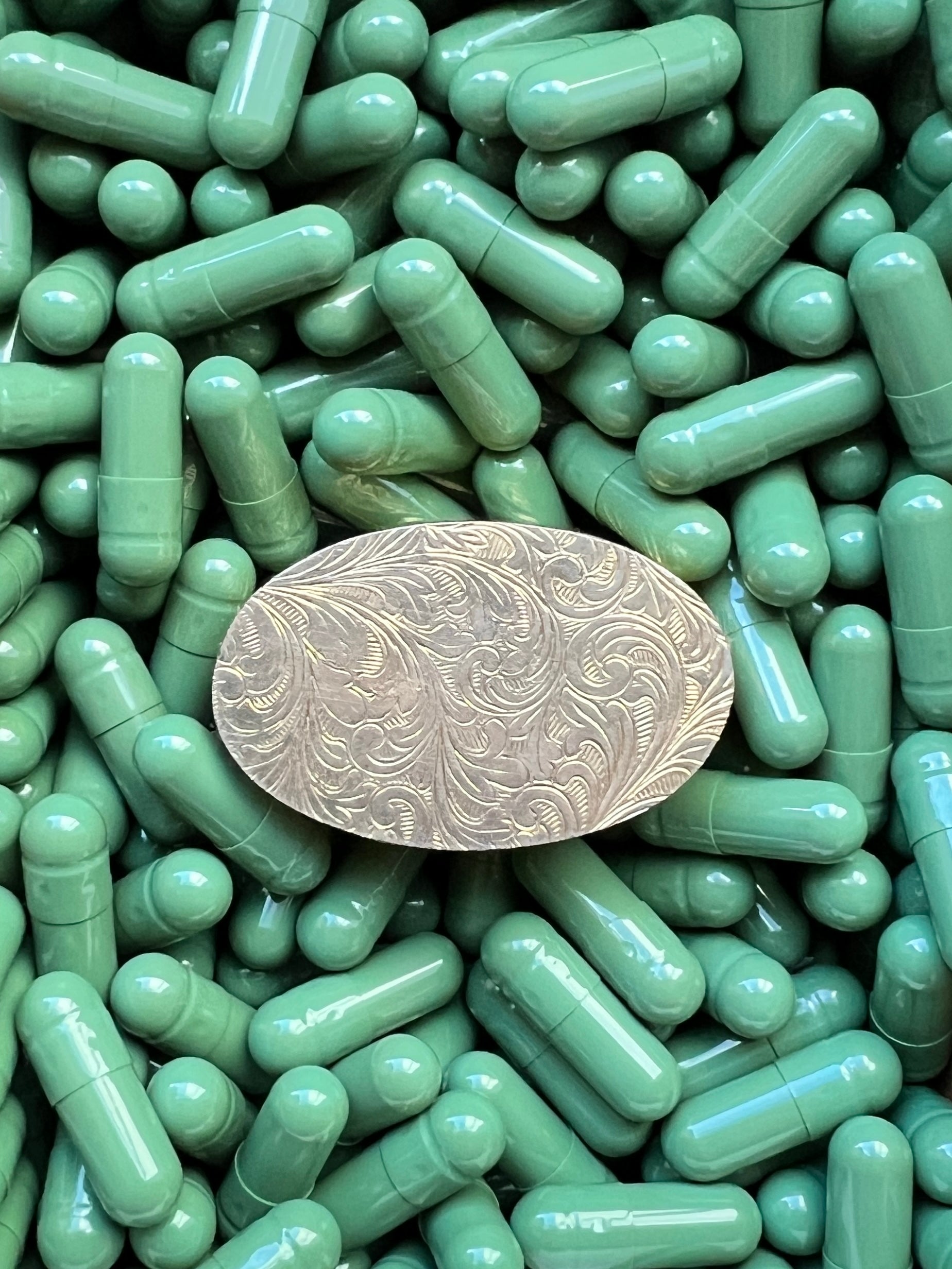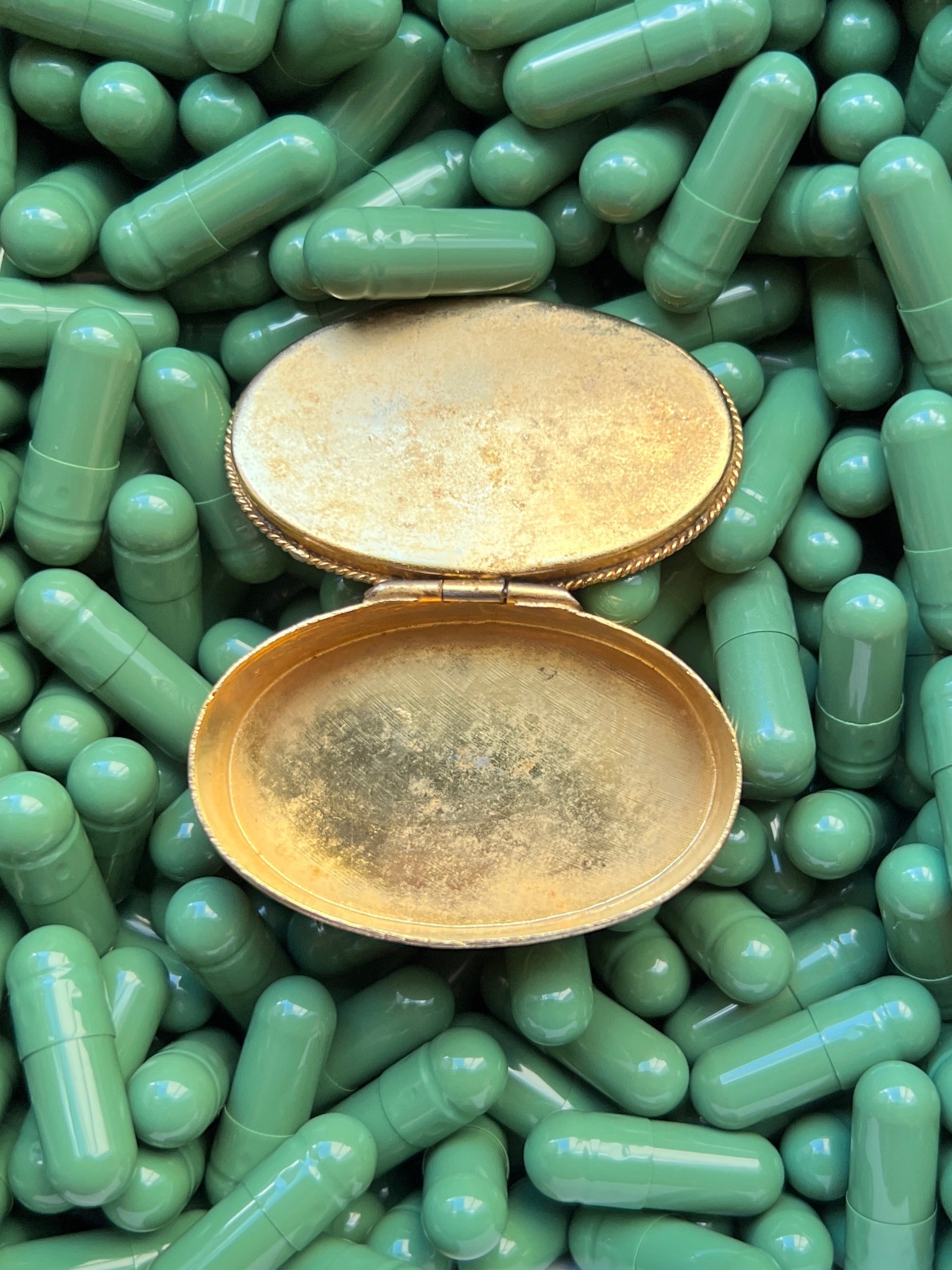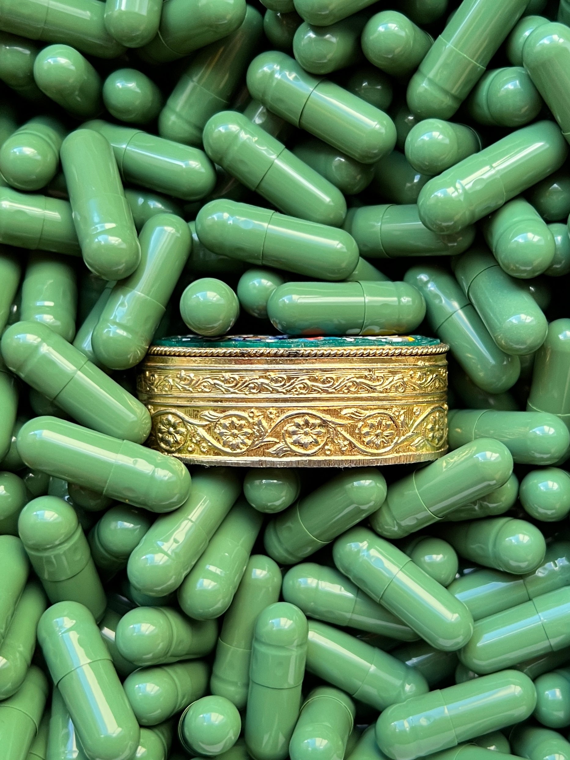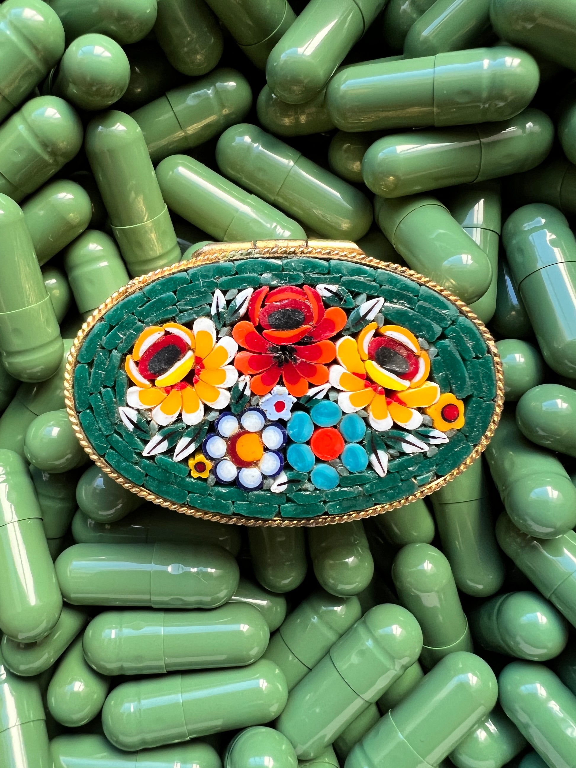 - Materials: Hand-cut glass tesserae set in gilt metal pill box.