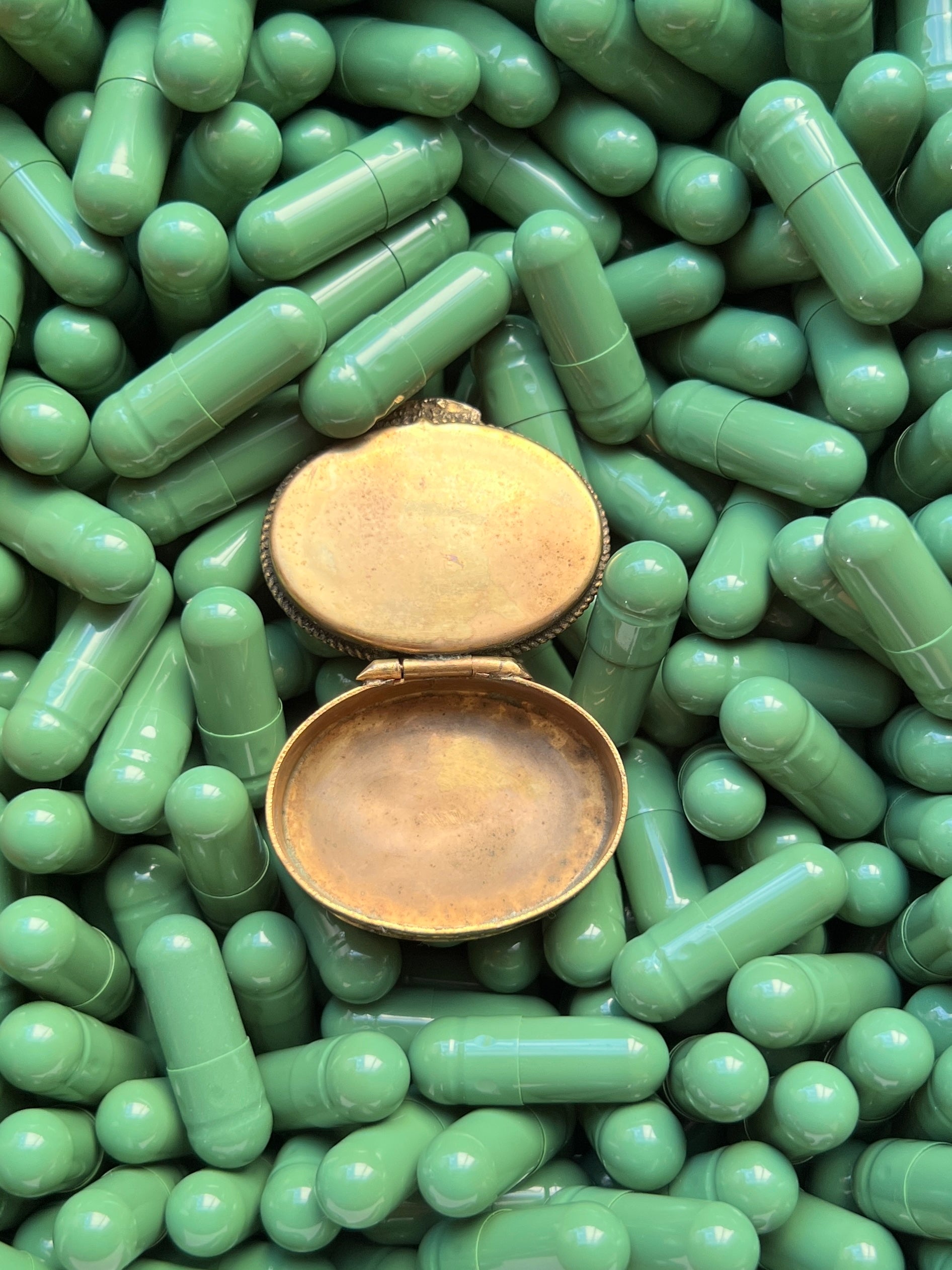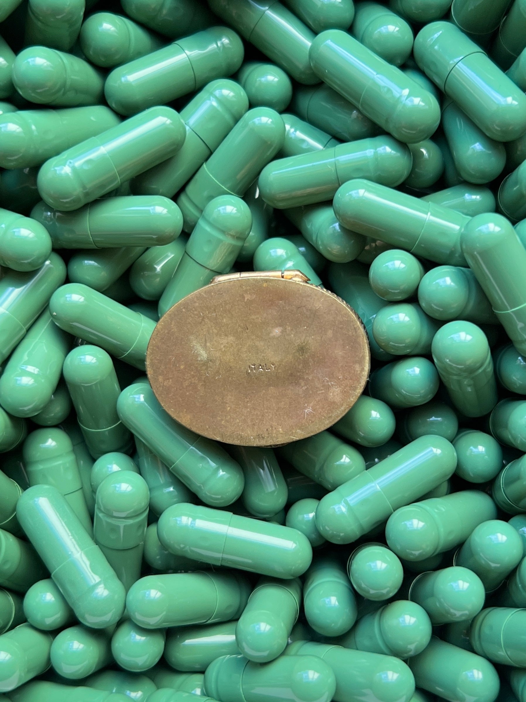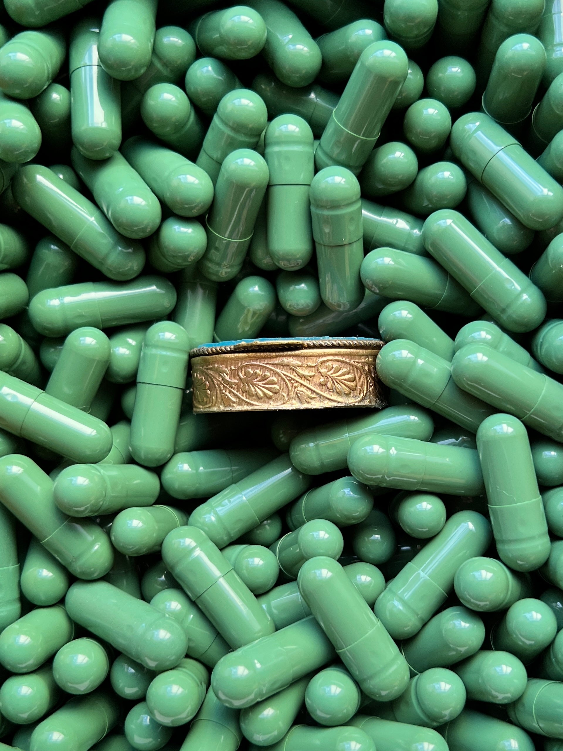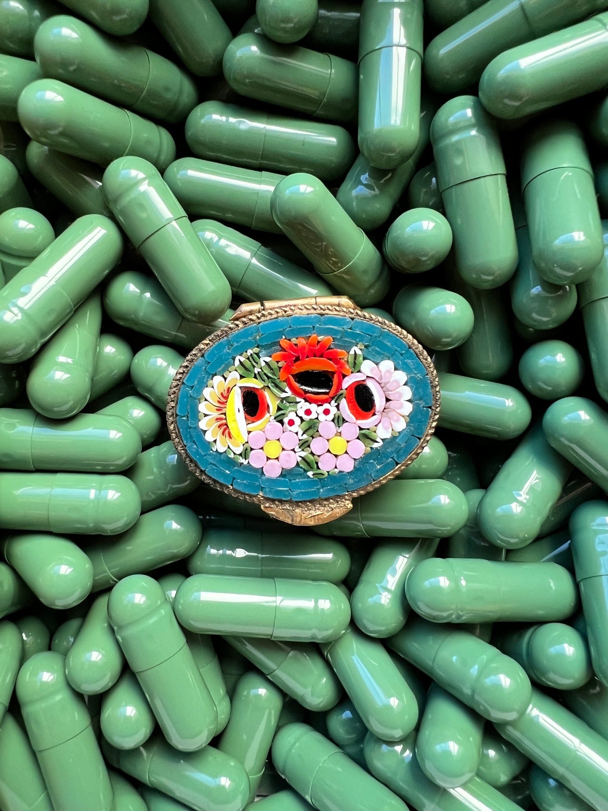 - Materials: Hand-cut glass tesserae set in gilt metal pill box.