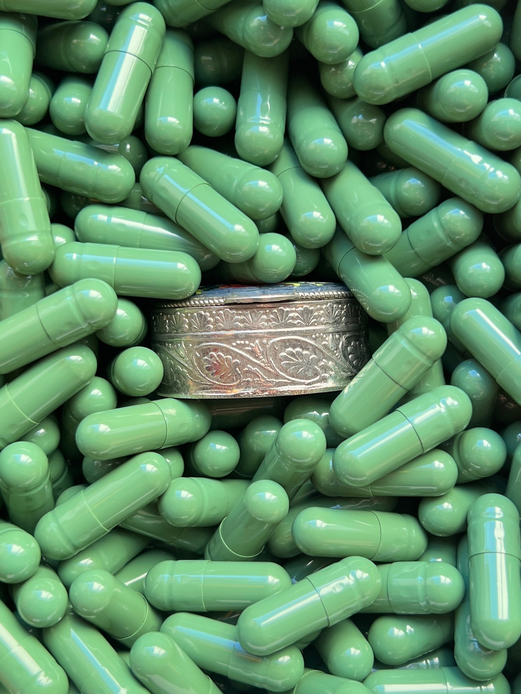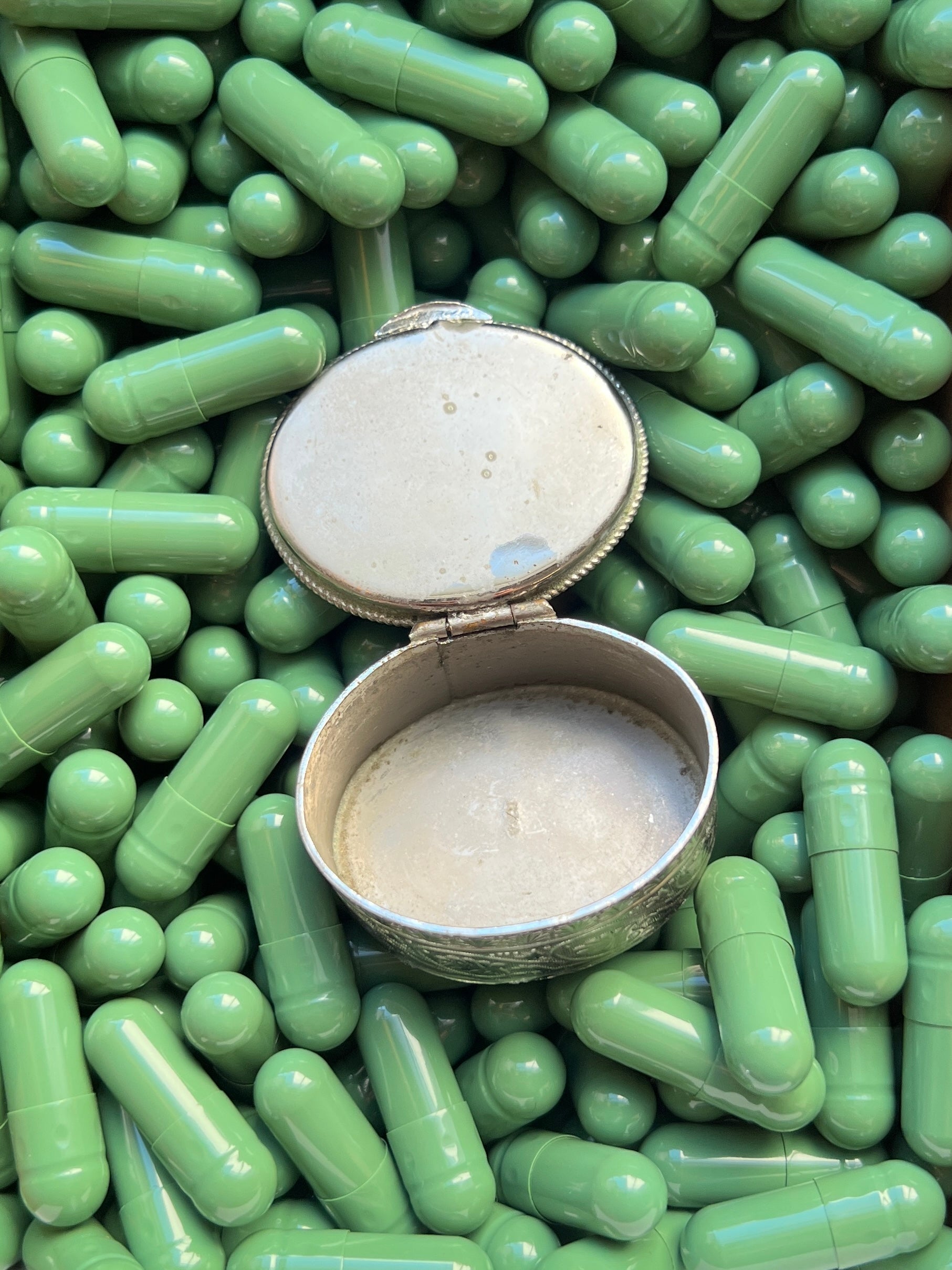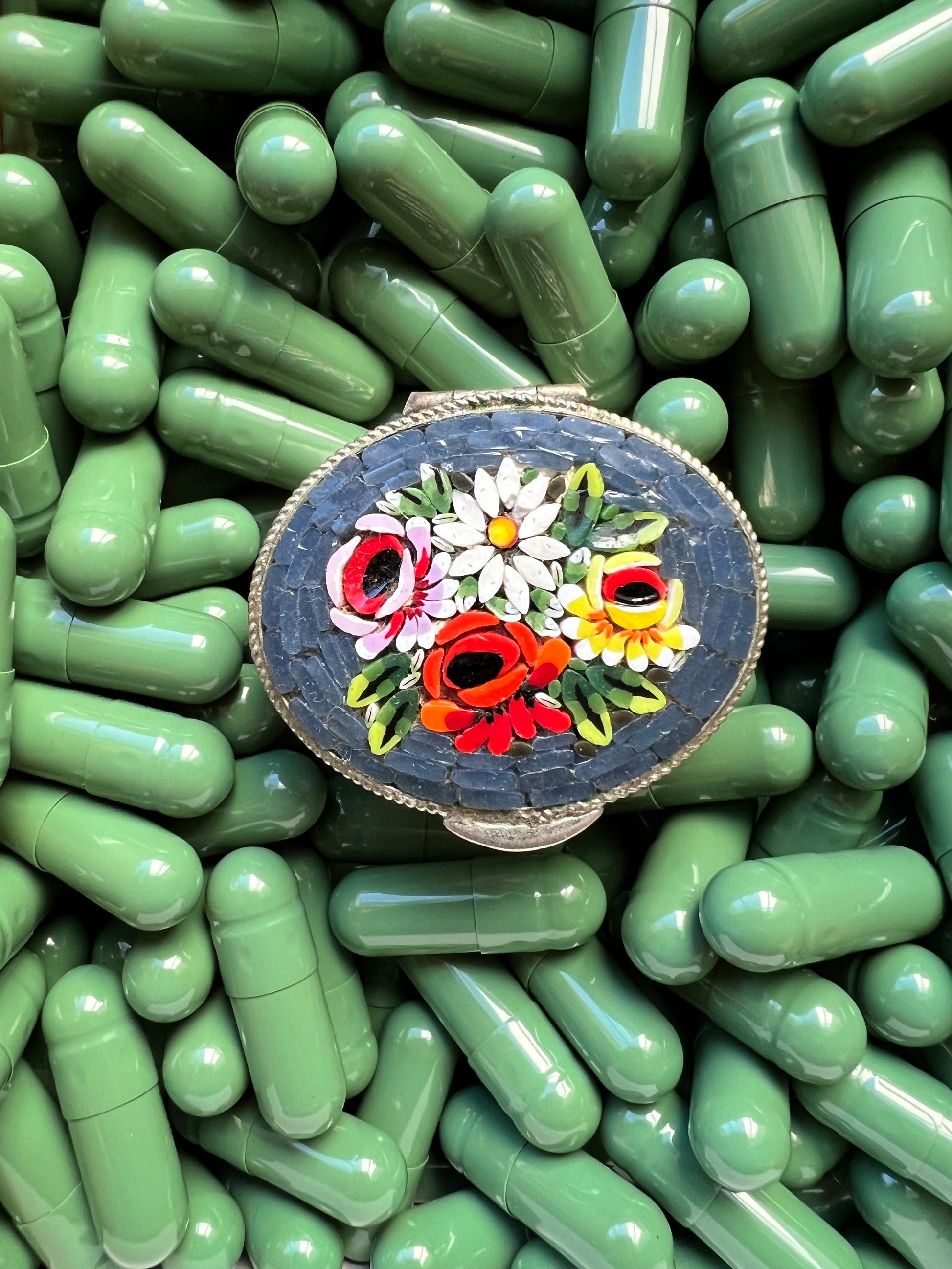 - Materials: Hand-cut glass tesserae set in gilt metal pill box.