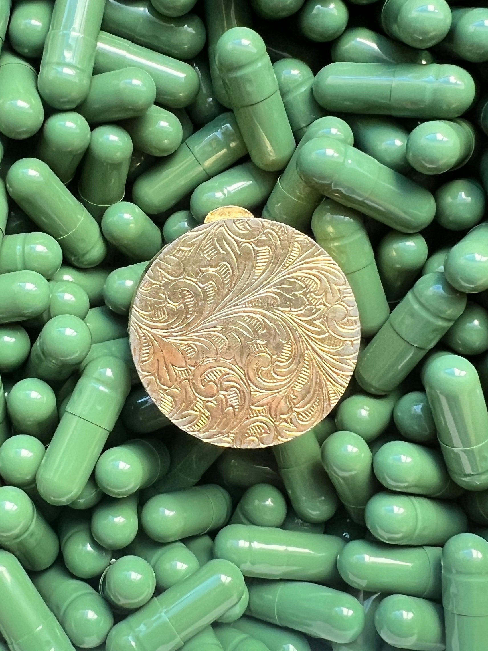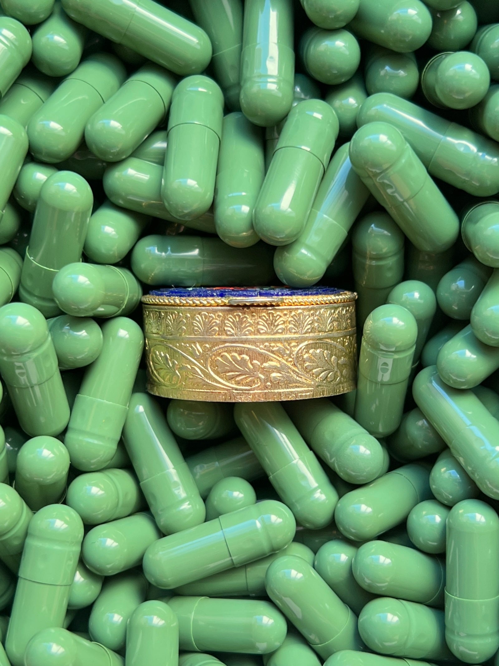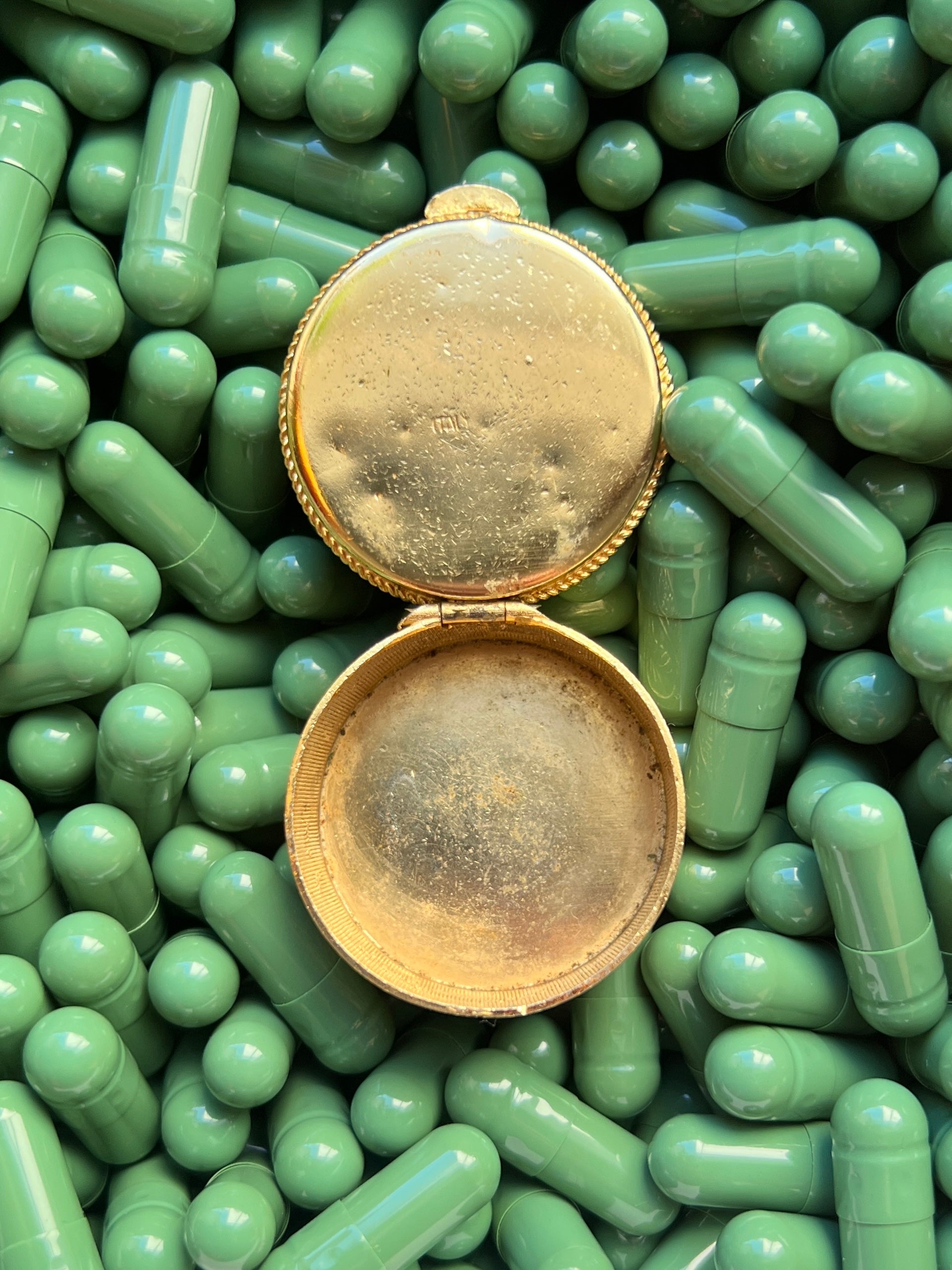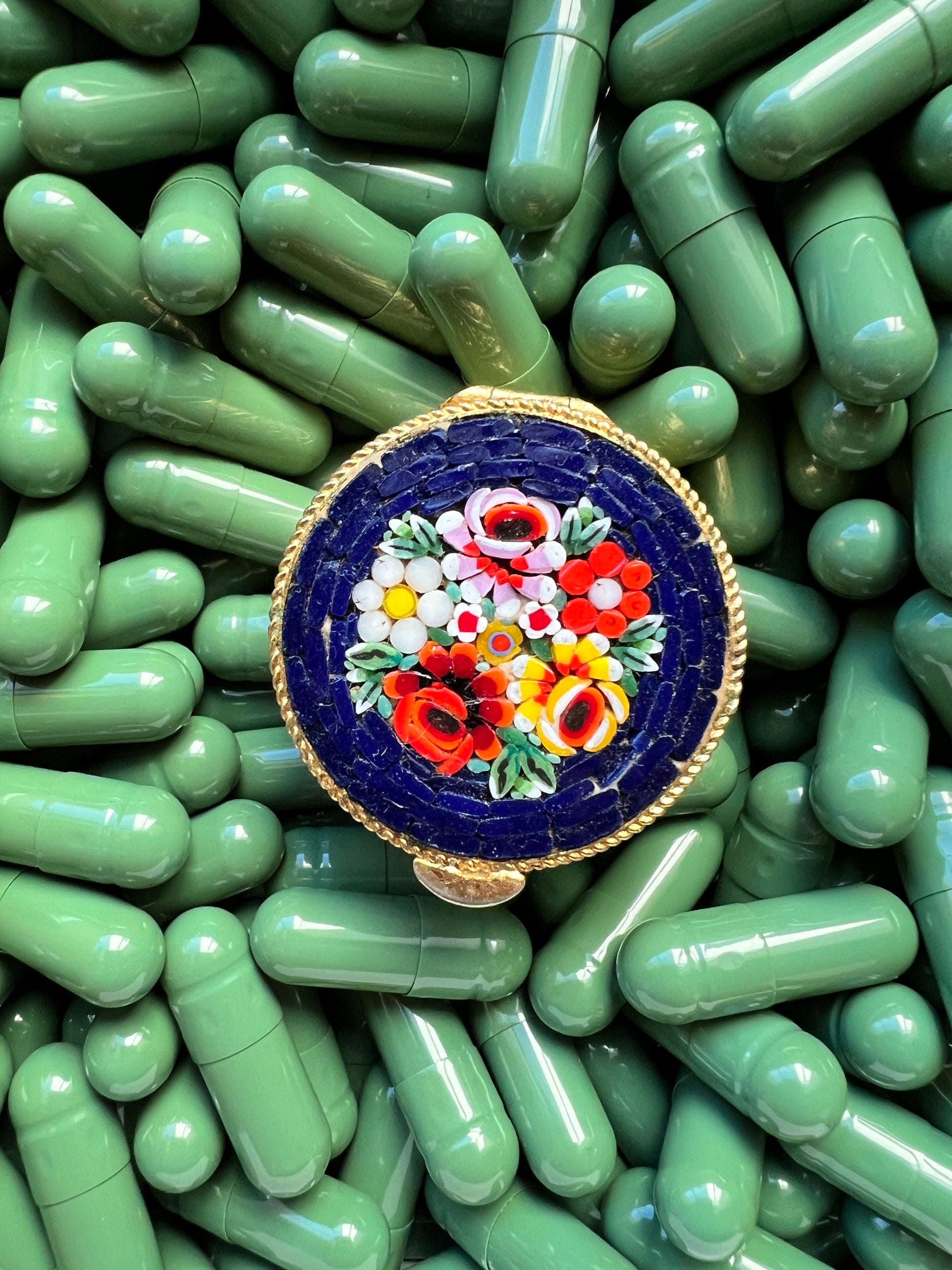 - Materials: Hand-cut glass tesserae set in gilt metal pill box.