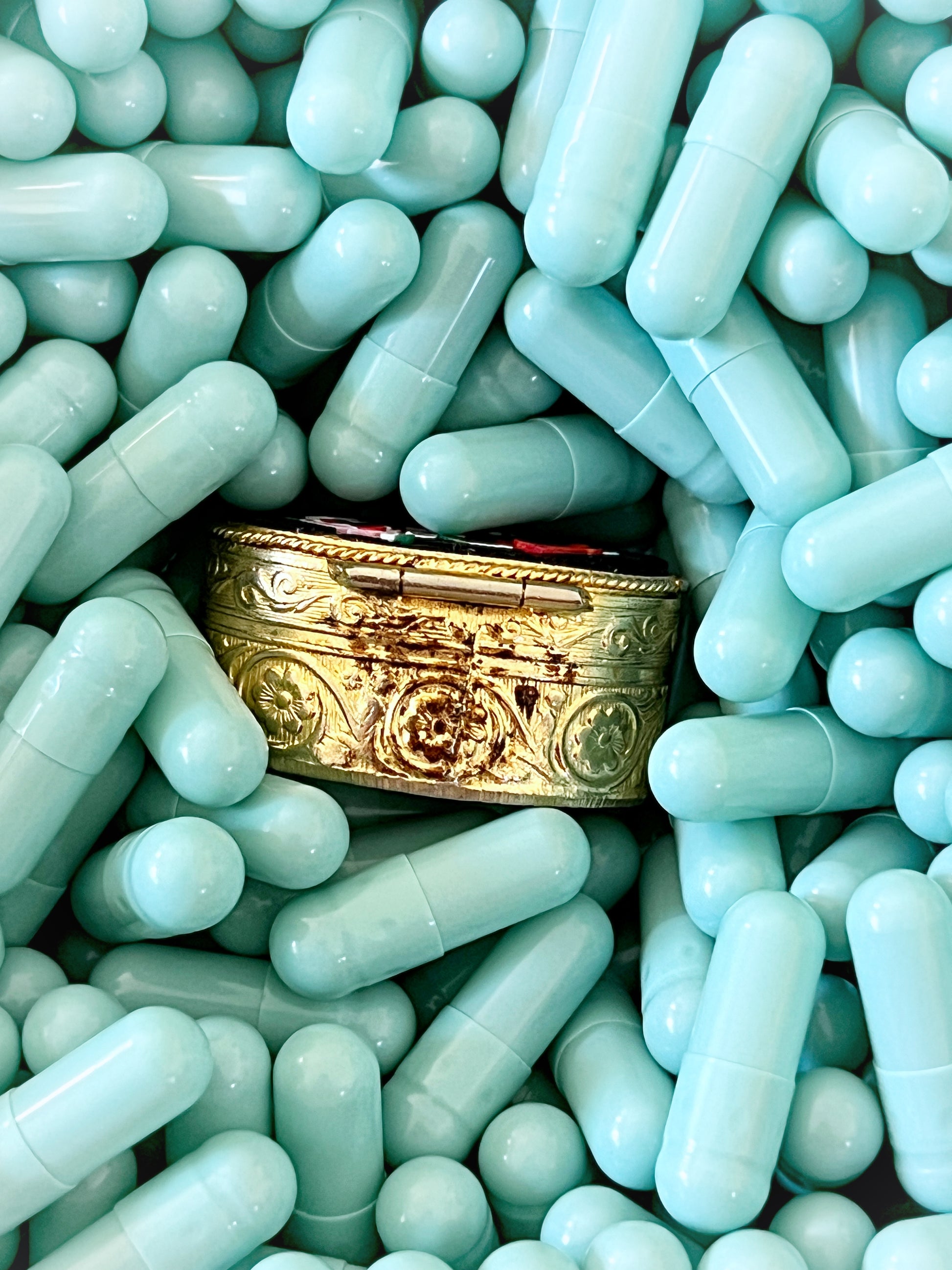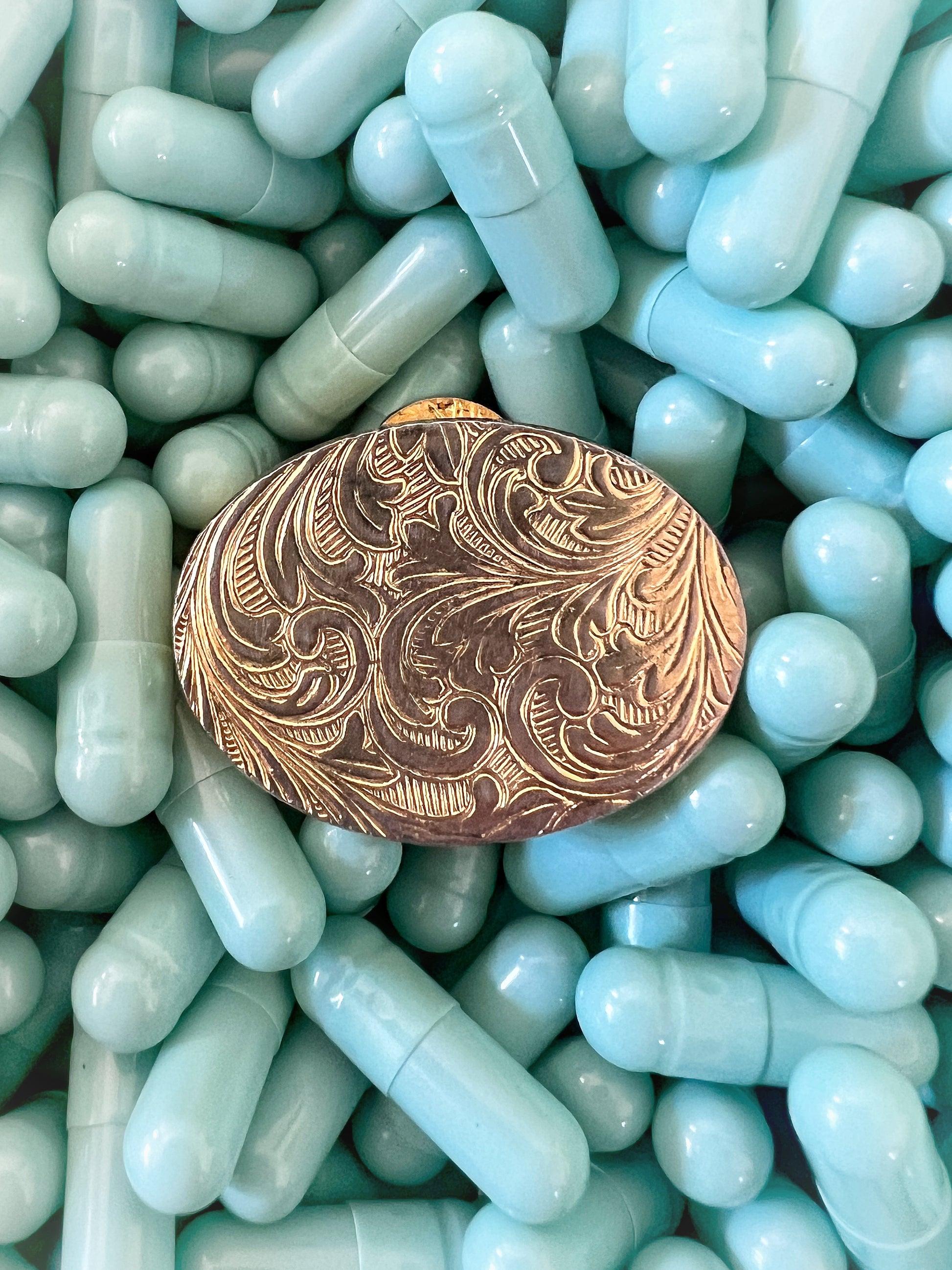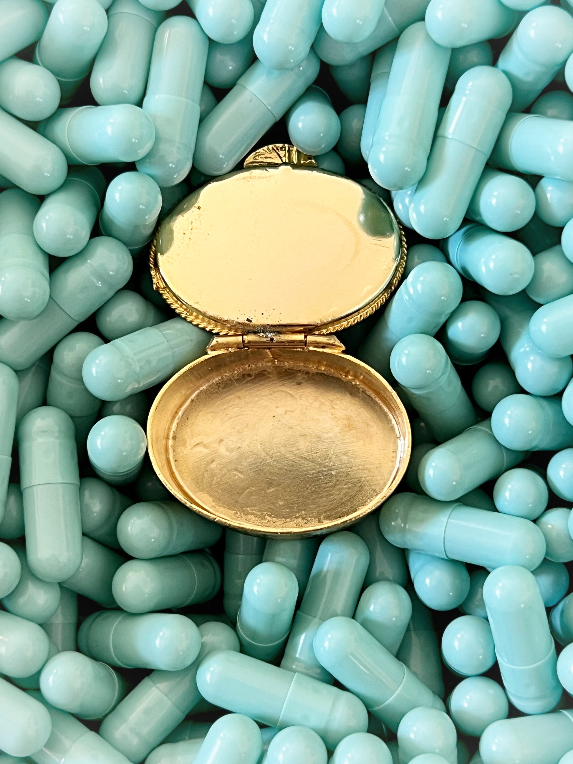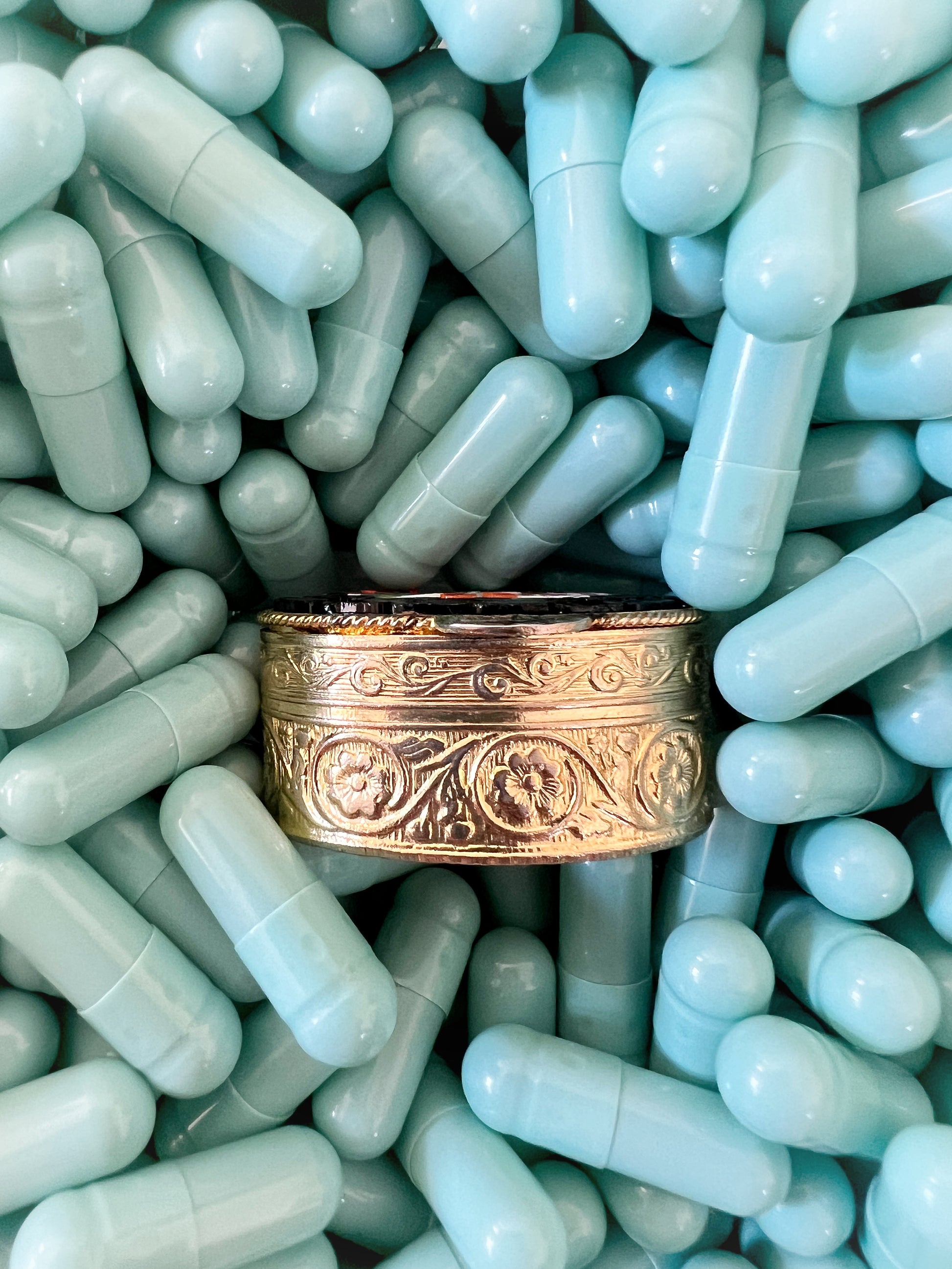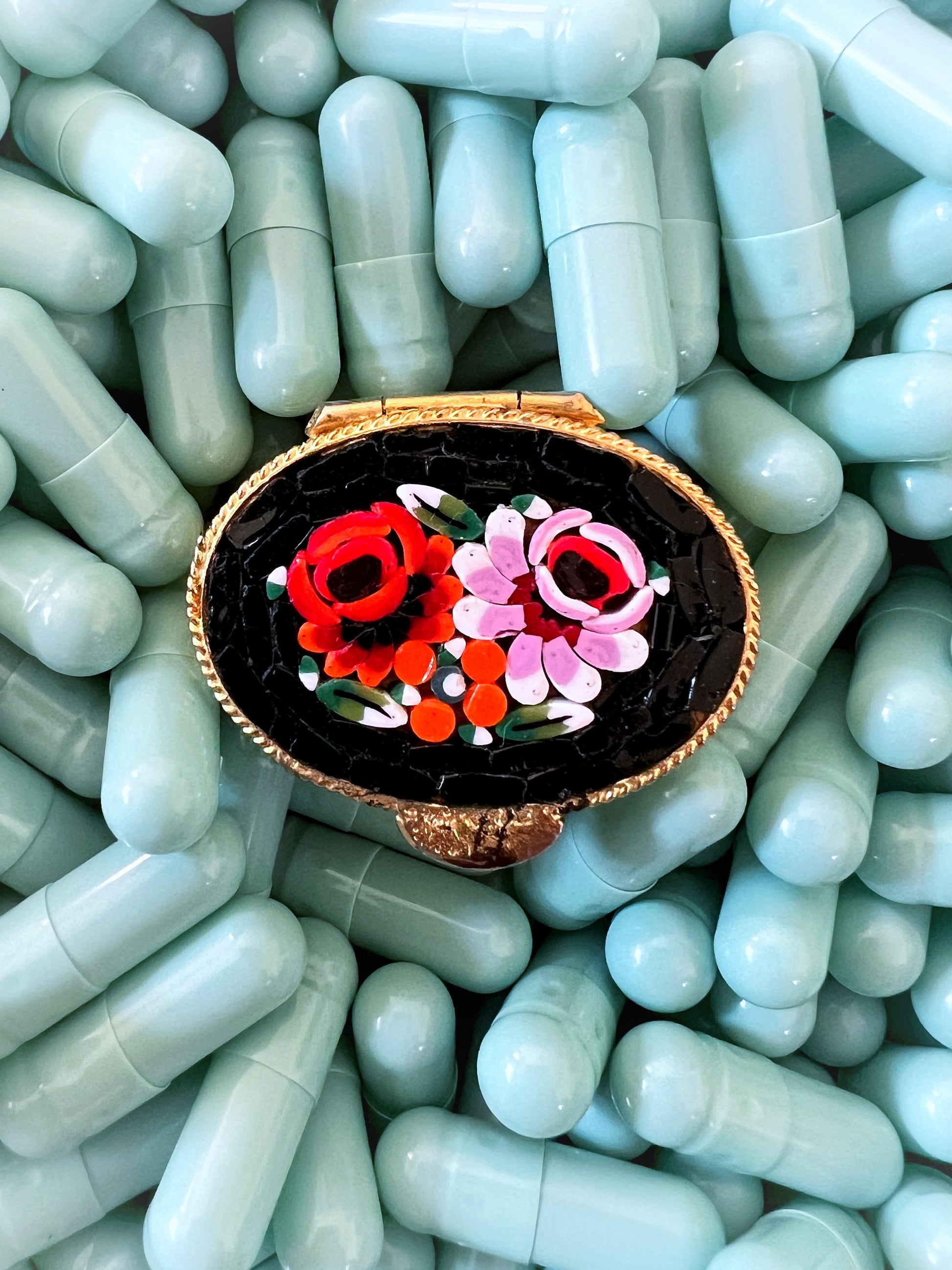 A dramatic bloom of Italian artistry, this pill box embodies the elegance and romance of a bygone era.