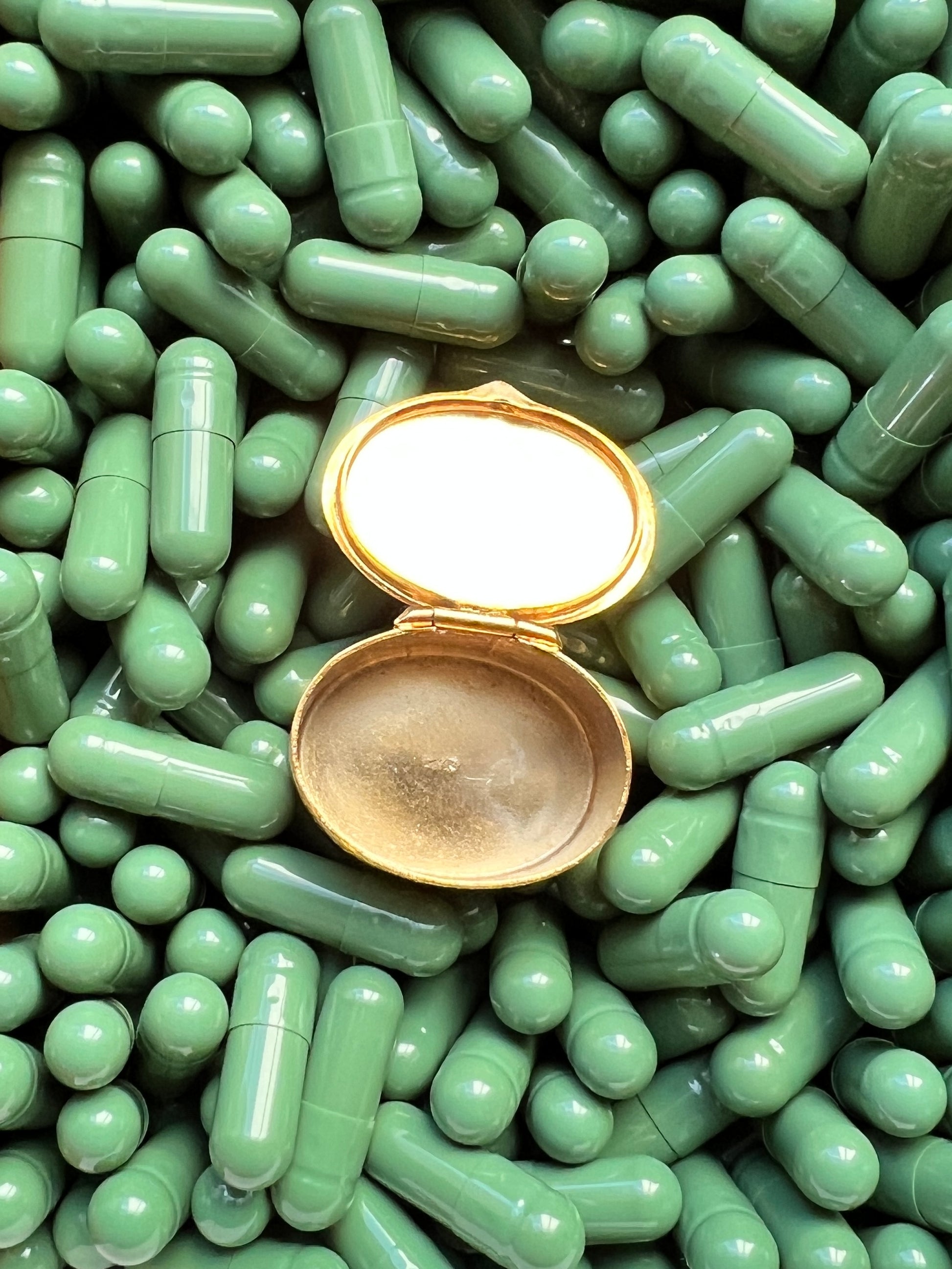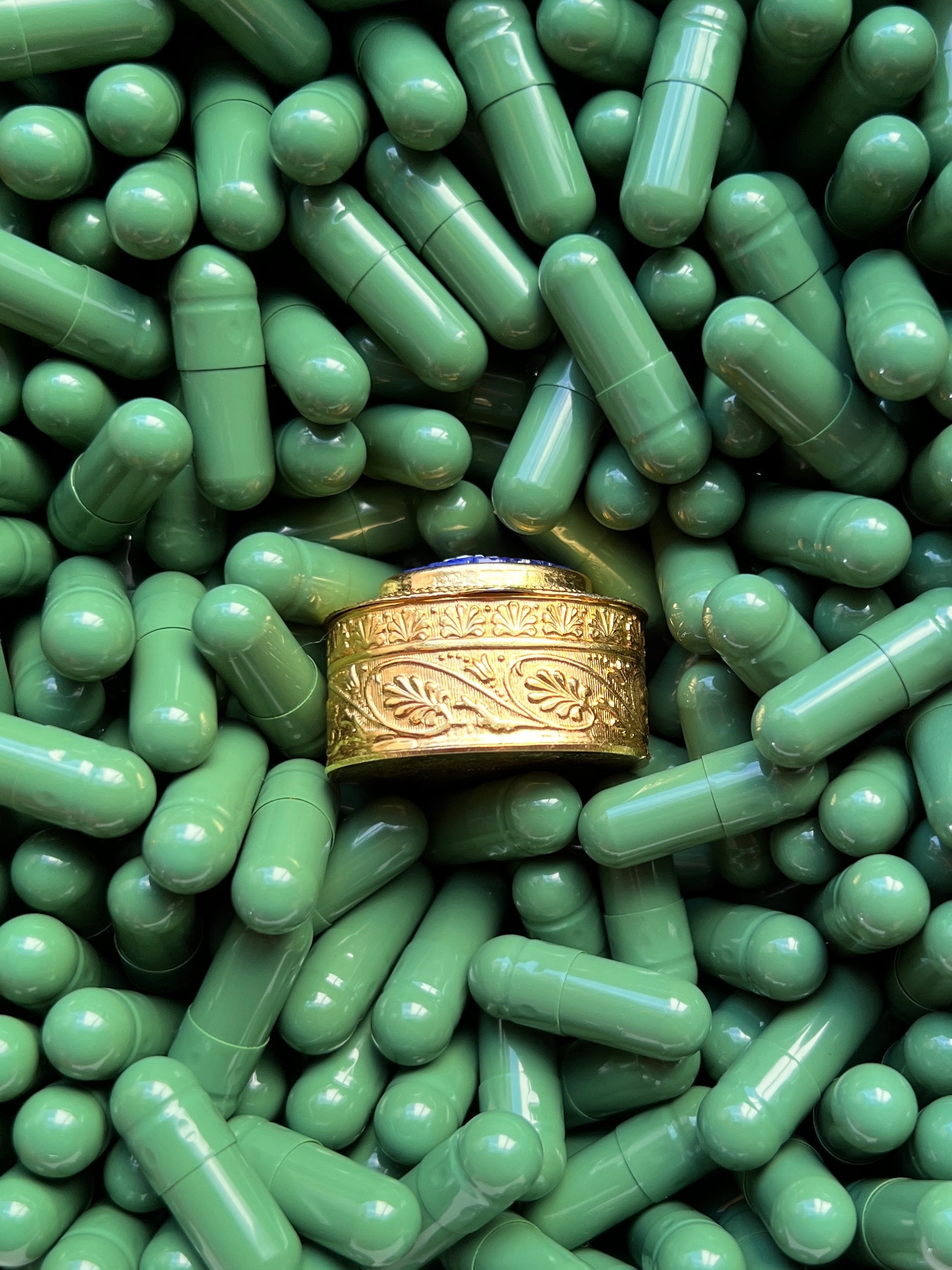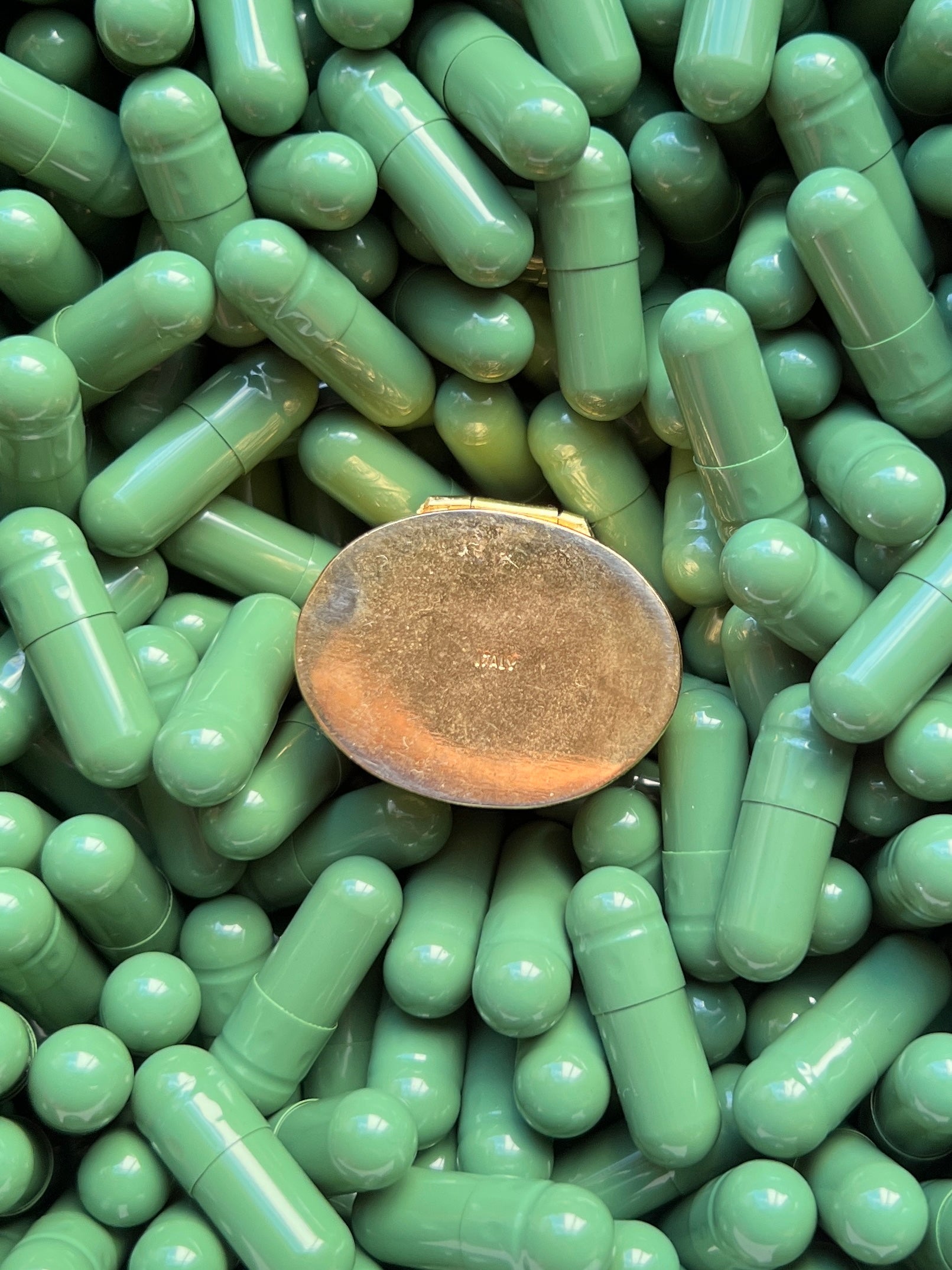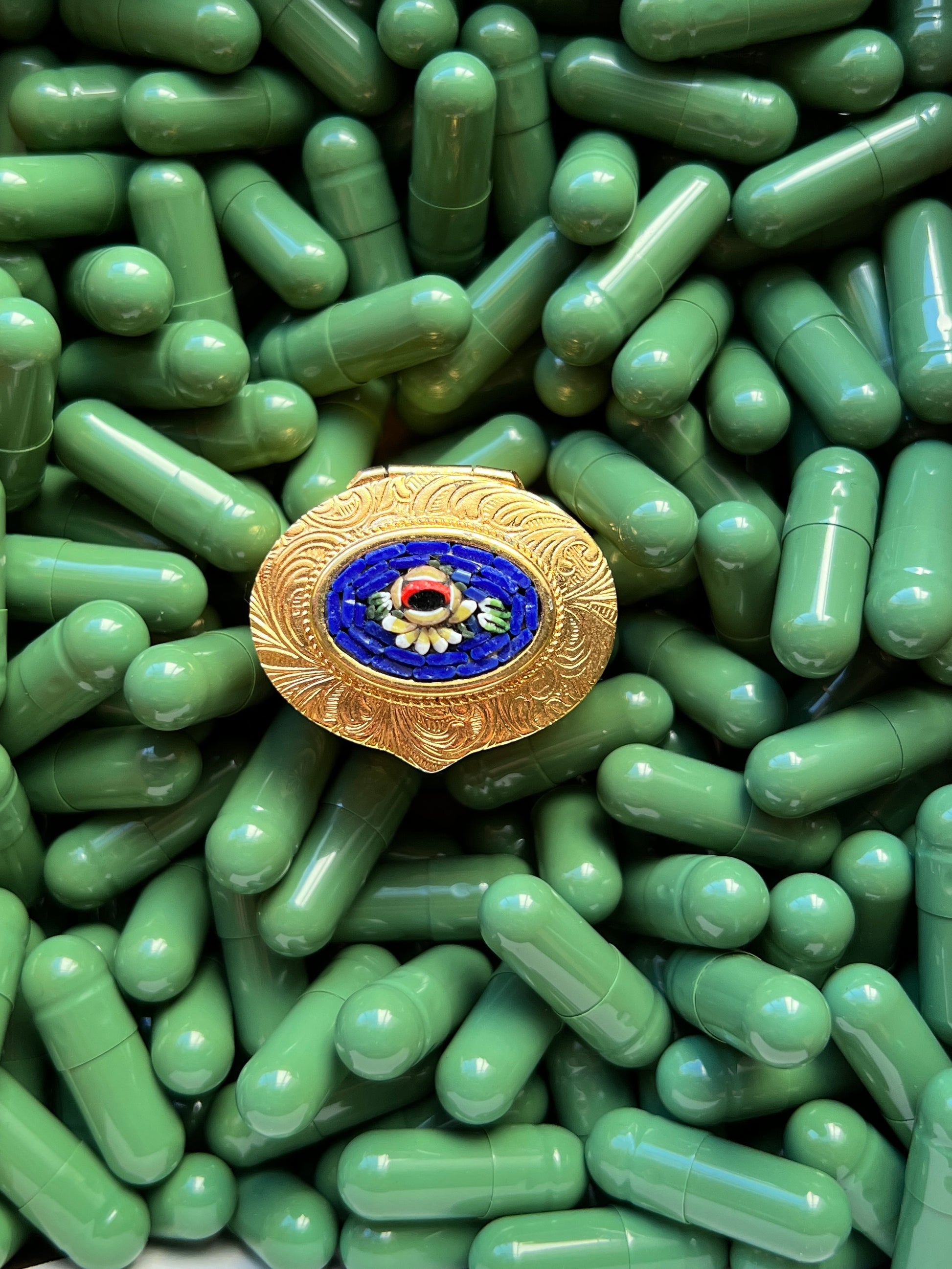 - Materials: Hand-cut glass tesserae set in gilt metal pill box.