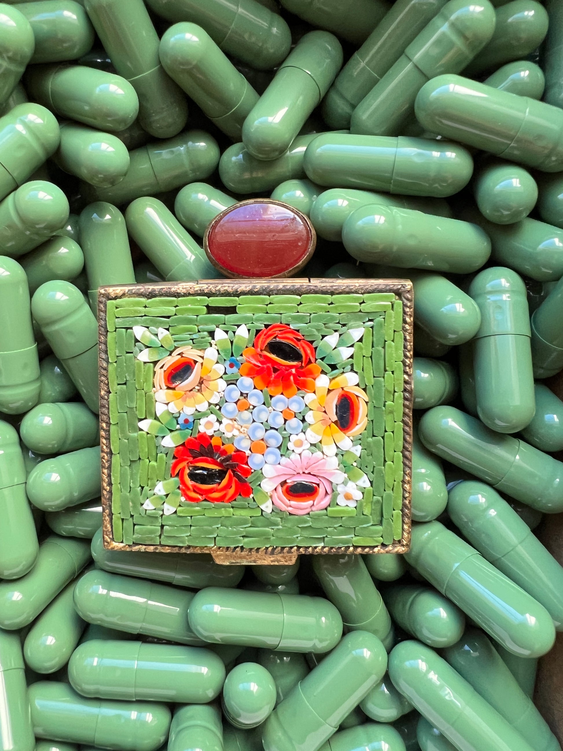 - Materials: Hand-cut glass tesserae set in gilt metal pill box.