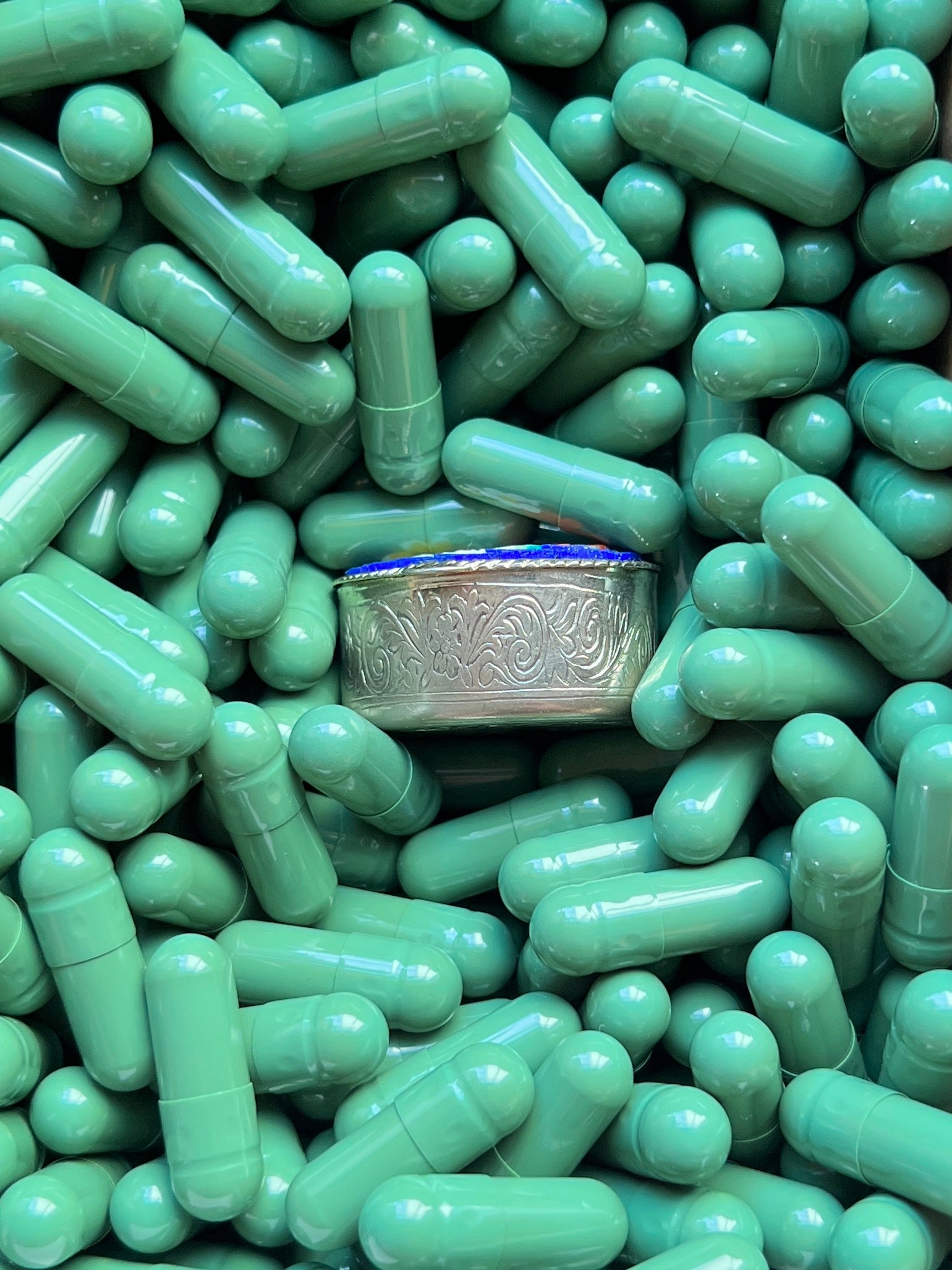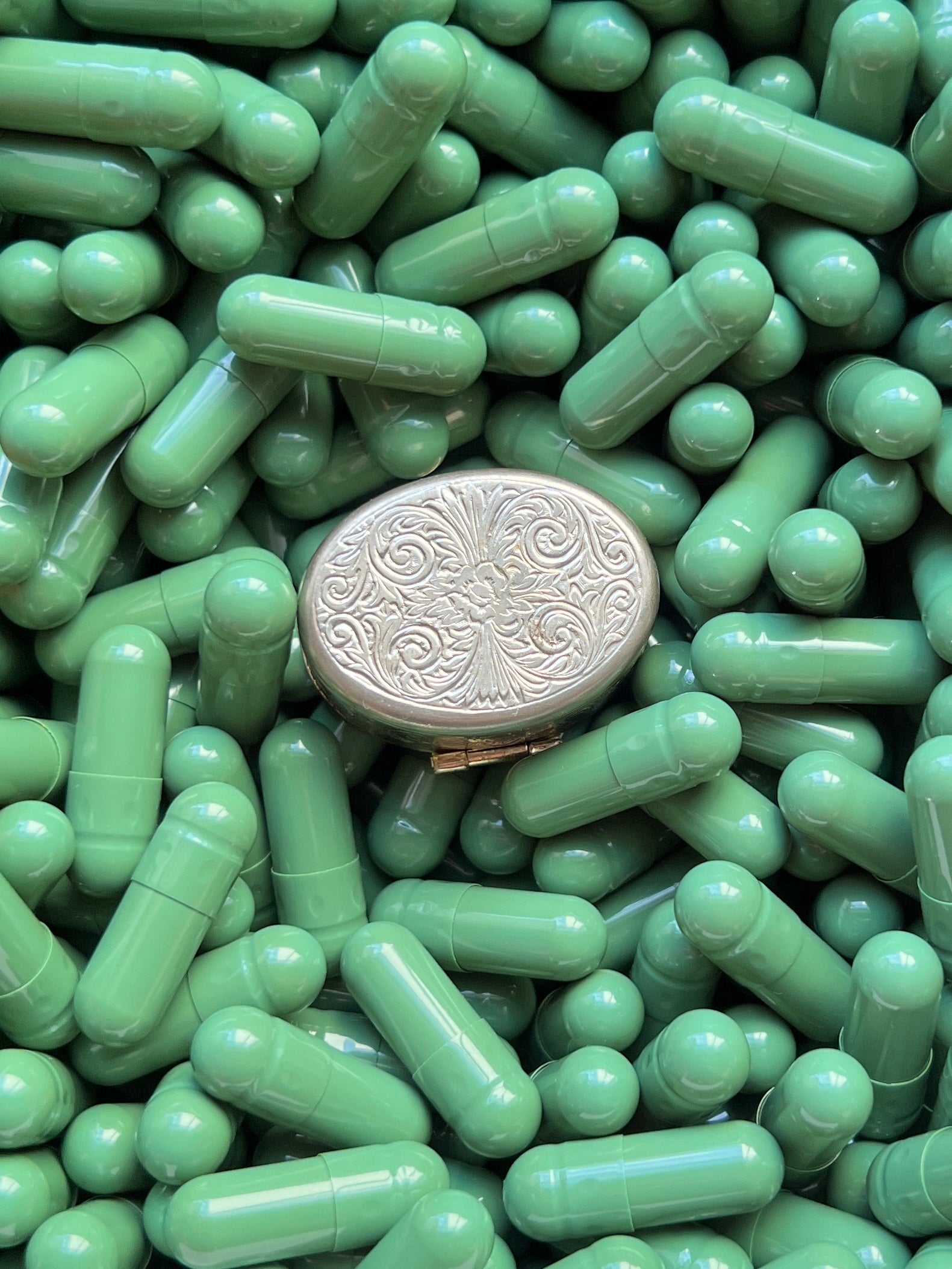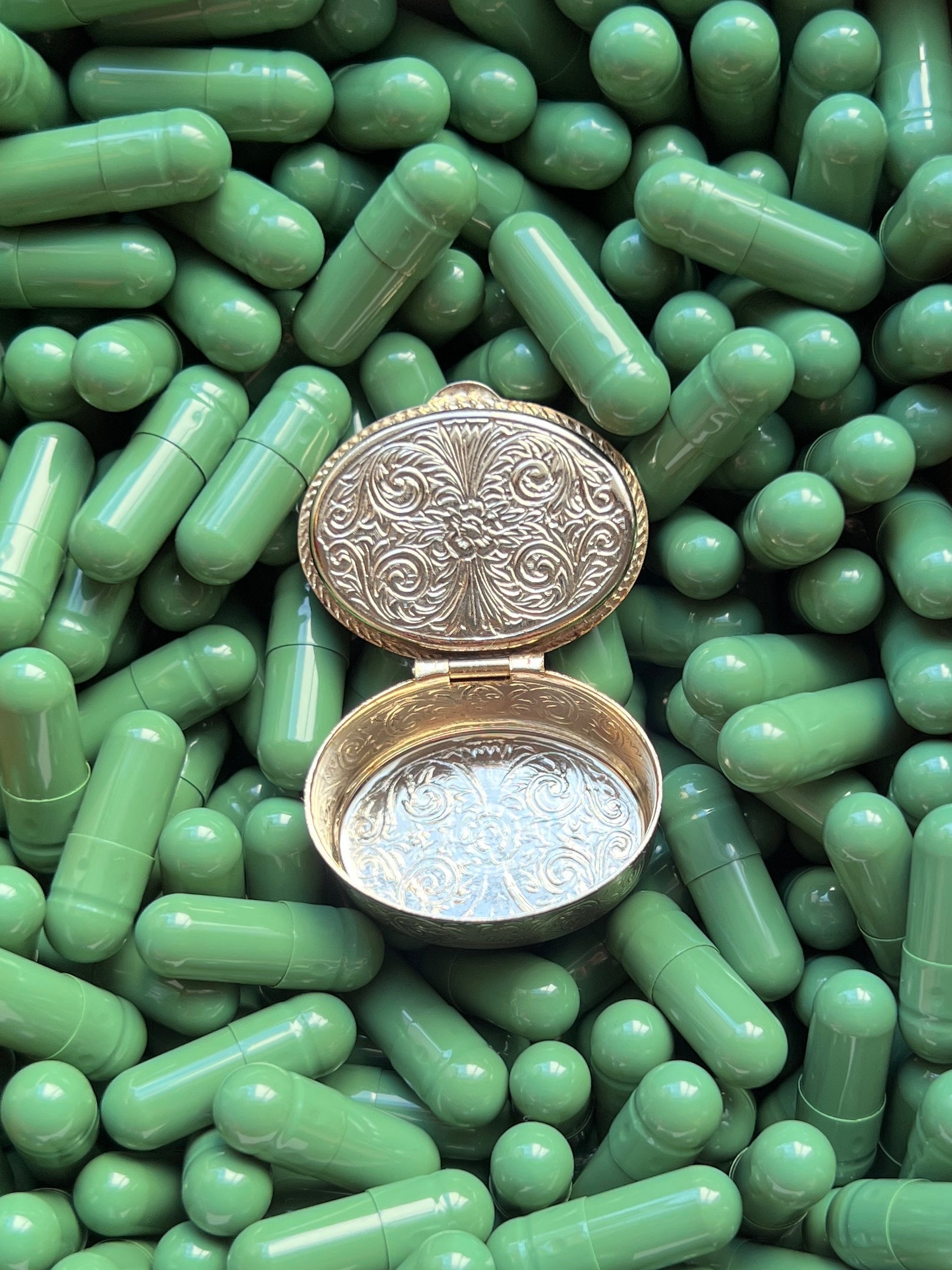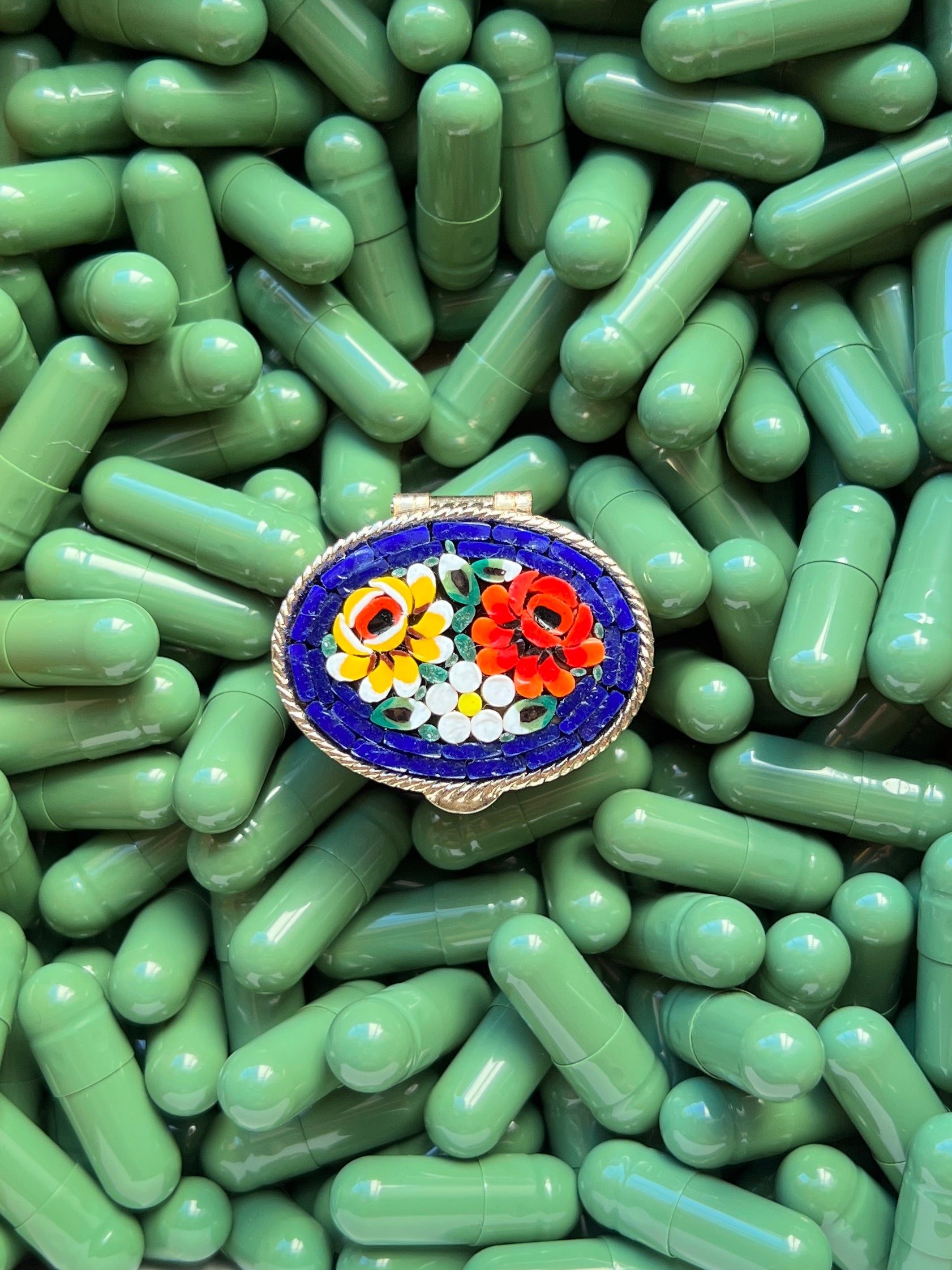 - Materials: Hand-cut glass tesserae set in gilt metal pill box.